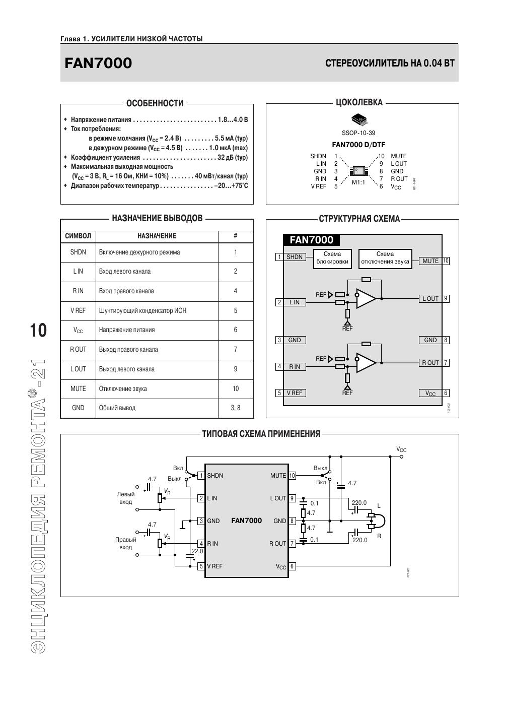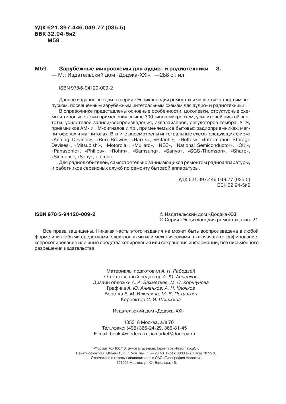 Данное издание выходит в серии «Энциклопедия ремонта» и является четвертым выпуском, посвященным зарубежным интегральным схемам для аудио- и радиотехники. В справочнике представлены основные особенности, цоколевки, структурные схемы и типовые схемы применения свыше 300 типов микросхем, усилителей низкой частоты, усилителей записи/воспроизведения, эквалайзеров, регуляторов тембра, УПЧ, приемников АМ и ЧМ сигналов и пр., применяемых в бытовых радиоприемниках, магнитофонах и магнитолах. В книге рассмотрены интегральные схемы следующих фирм: «Analog Devices», «Burr Brown», «Harris», «Hitachi», «Holtek», «Information Storage Devises», «Mitsubishi», «Motorola», «Mullard», «NEC», «National Semiconductor», «OKI», «Panasonic», «Philips», «Rohm», «Samsung», «Sanyo», «SGS Thomson», «Sharp», «Siemens», «Sony», «Temic». Для радиолюбителей, самостоятельно занимающихся ремонтом радиоаппаратуры, и работников сервисных служб по ремонту бытовой аппаратуры.