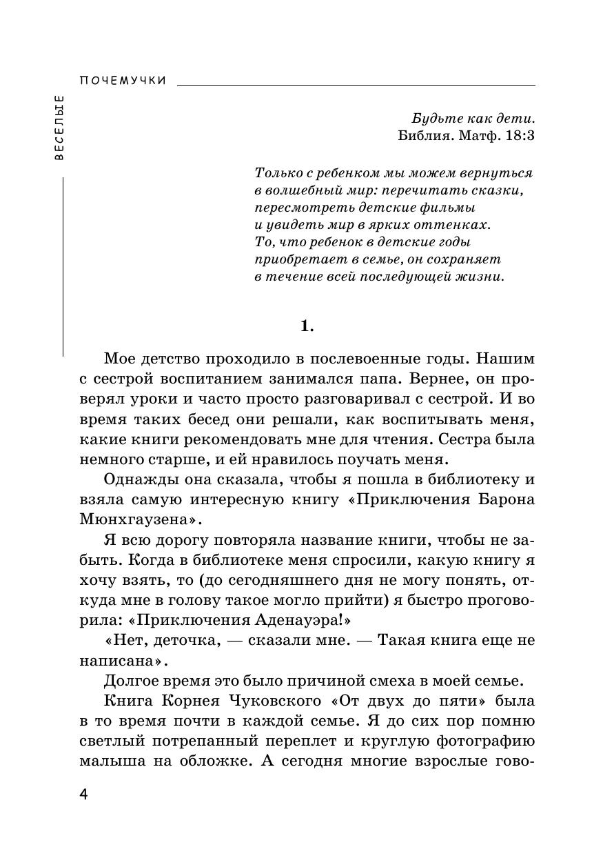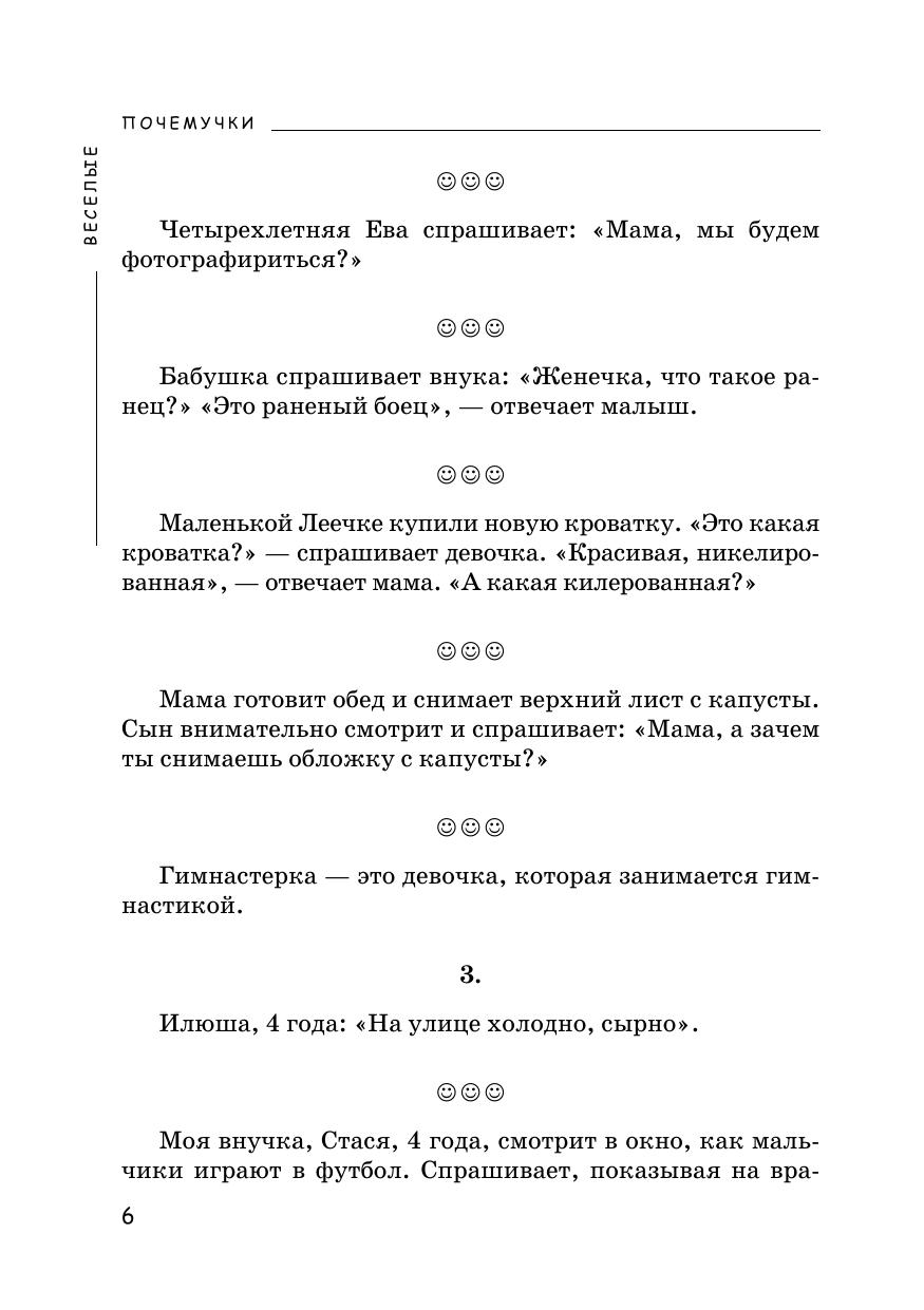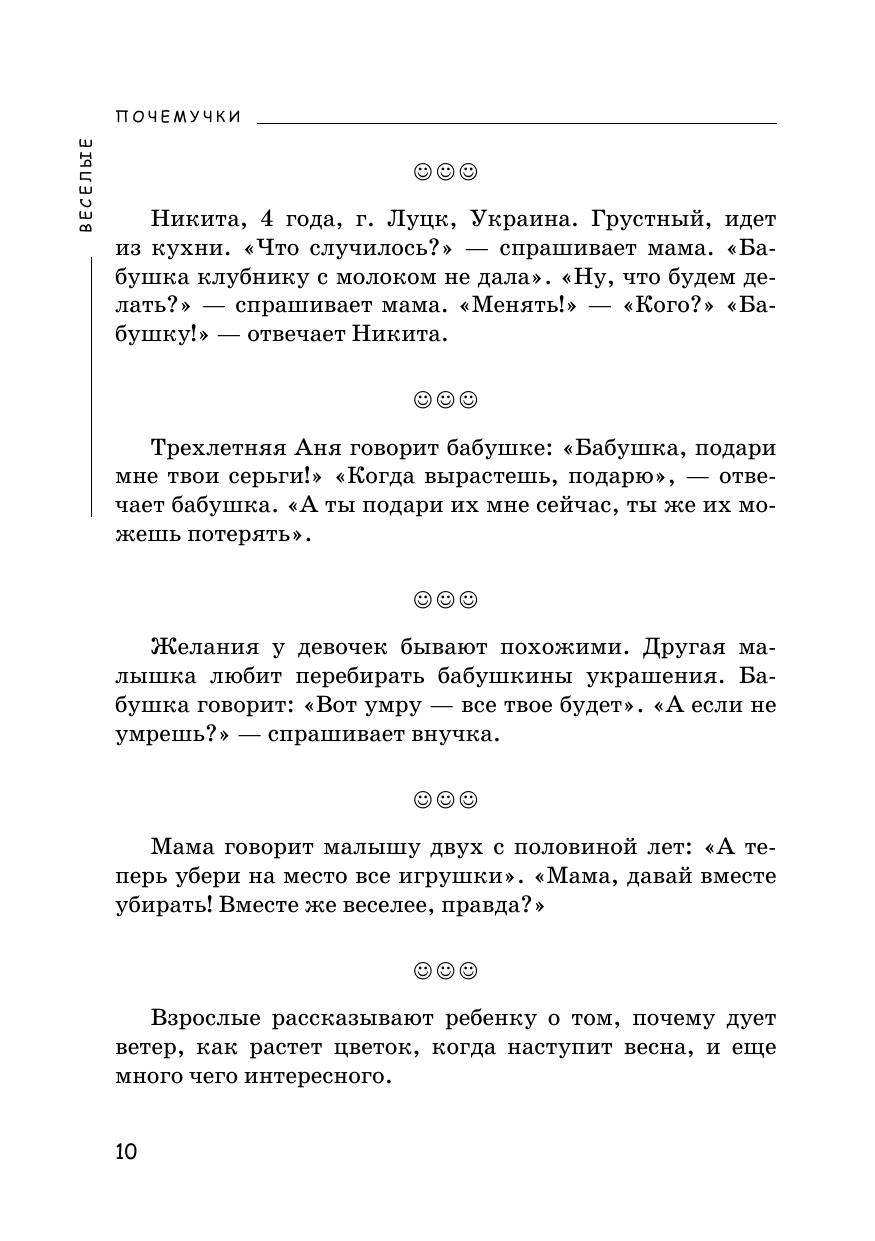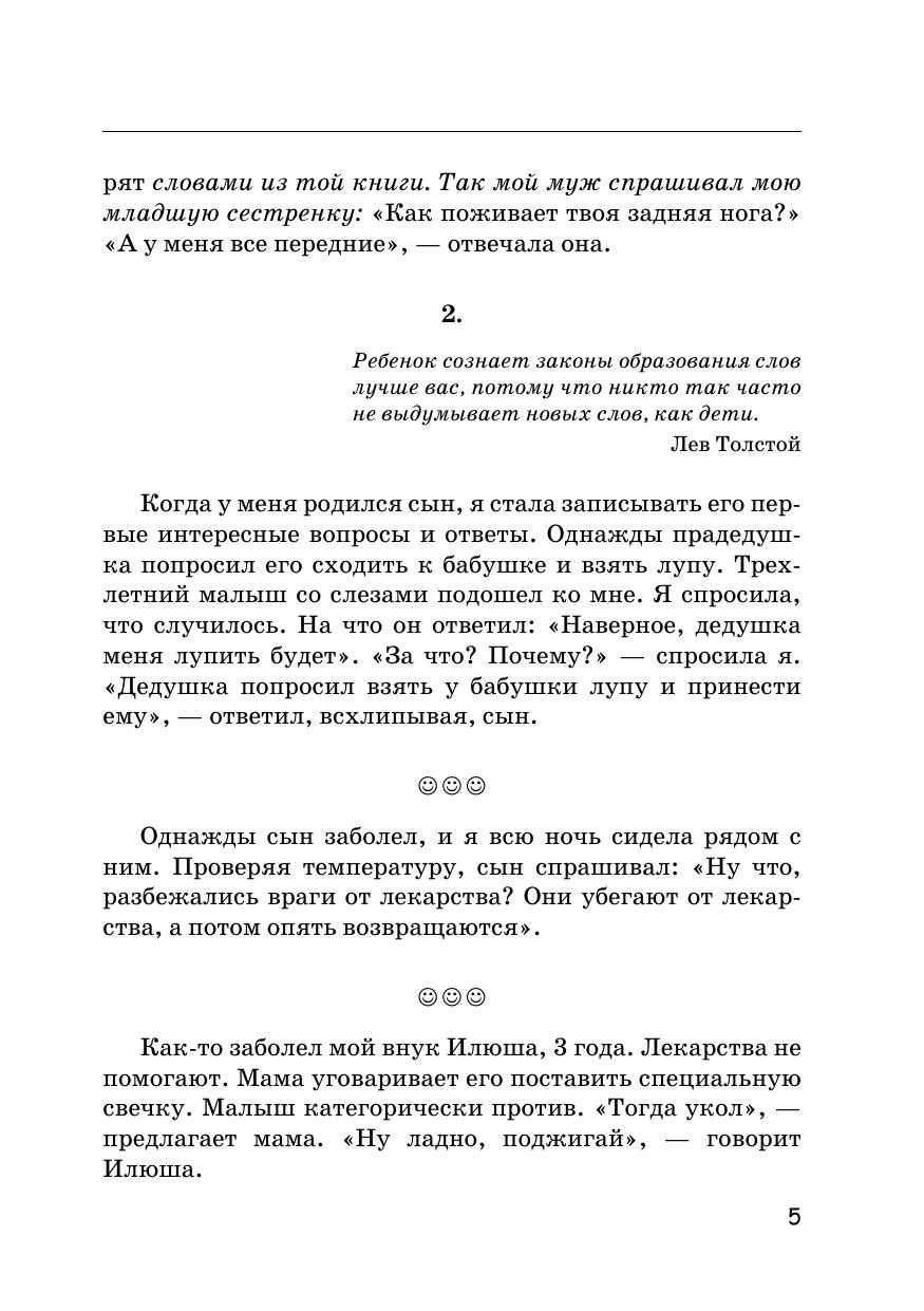 Вам предлагается очень интересная книжка, которая обязательно всем понравится. В ней говорят дети XXI века (от двух до шести лет). Автор книги и друзья — родители малышей — подслушали их. Детям важно все знать, и у них всегда есть свое мнение: «Мама, почему, когда приходит Дед Мороз, я не могу найти папу? Что такое небо? Мама, ты сказала, что это мыло туалетное. А ты меня им моешь?! Человек рождается для счастья, а не для того, чтобы слушаться!»