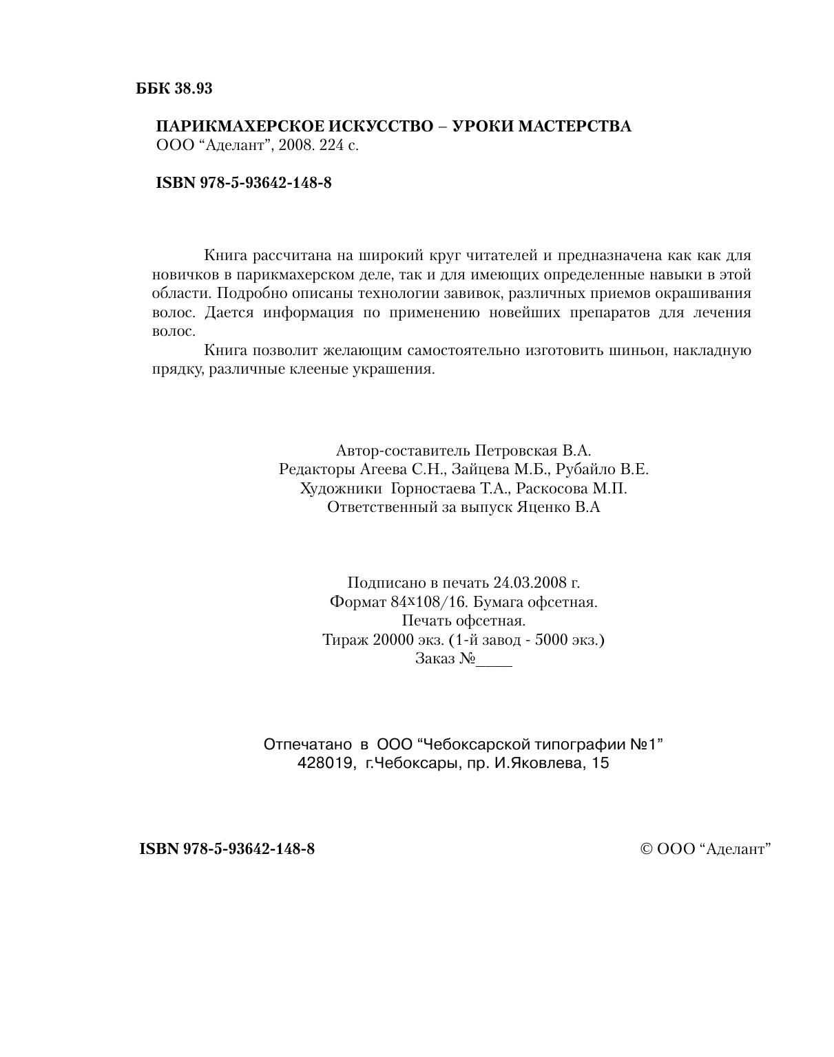 Книга рассчитана на широкий круг читателей и предназначена как как для новичков в парикмахерском деле, так и для имеющих определенные навыки в этой области. Подробно описаны технологии завивок, различных приемов окрашивания волос. Дается информация по применению новейших препаратов для лечения волос.