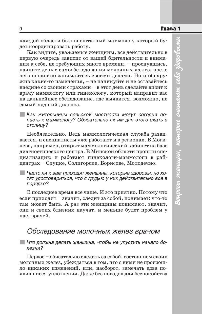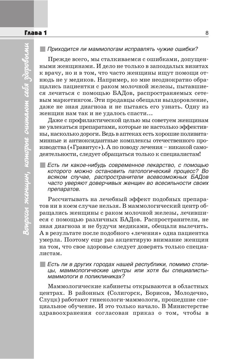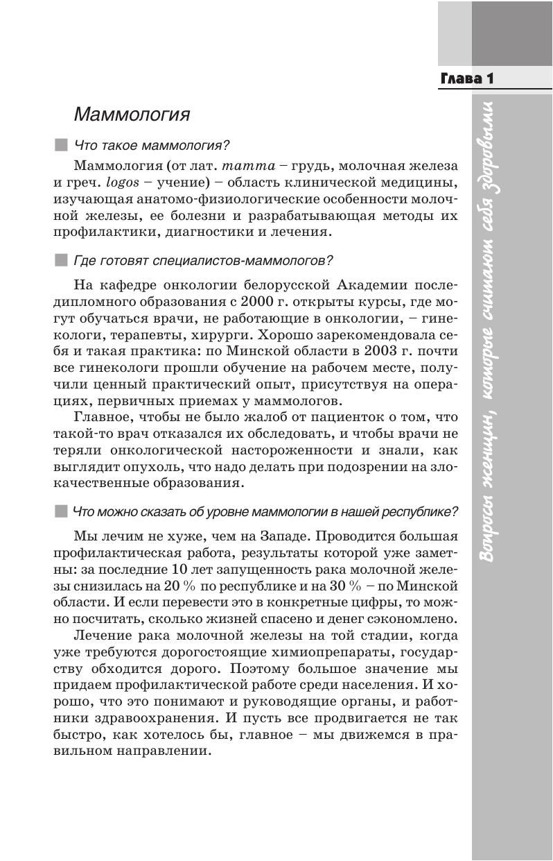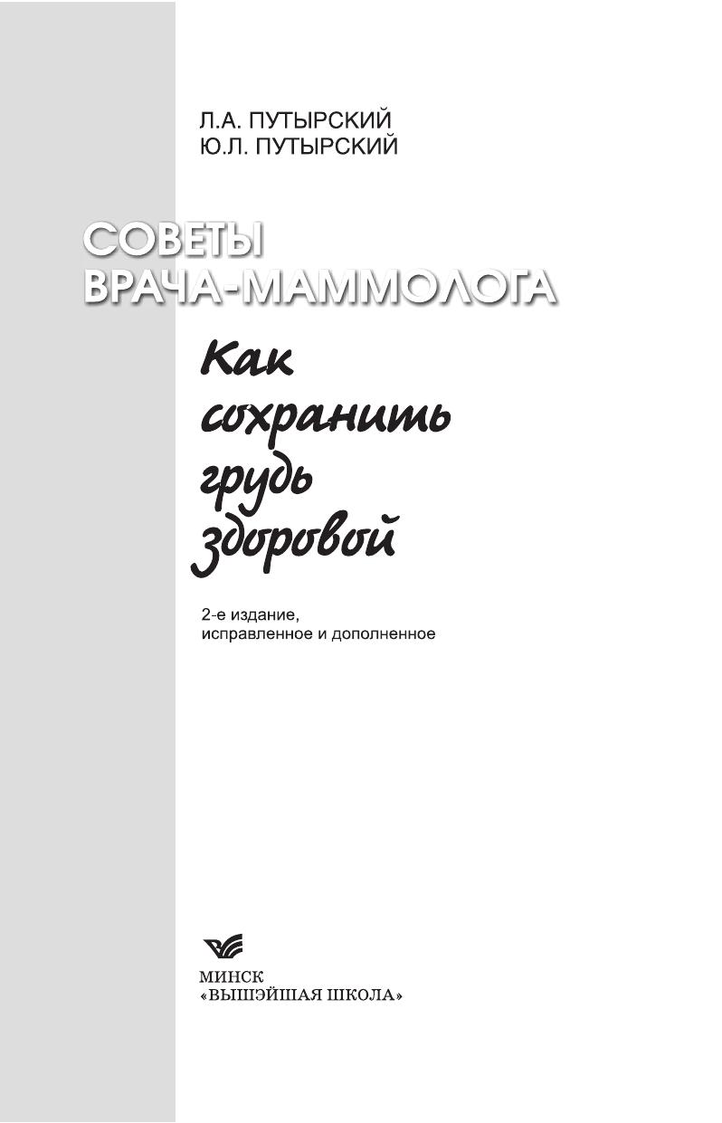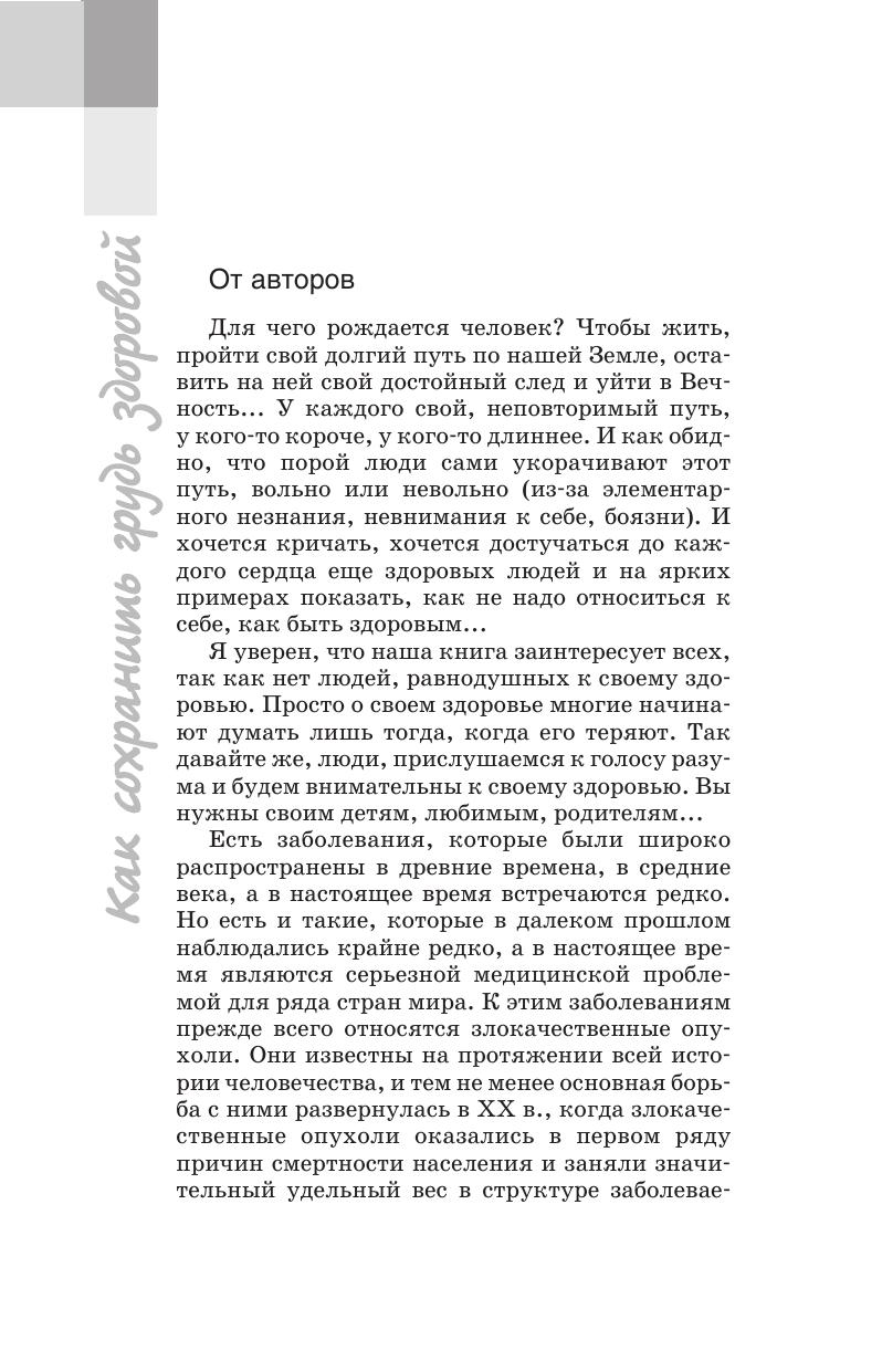 В форме вопросов и ответов предложены советы врача-маммолога, необходимые каждой женщине, желающей сохранить грудь здоровой. В первой главе собраны советы женщинам, которые считают себя здоровыми (приведены сведения о маммологии, обследовании молочных желез специалистами и самообследовании и др.) во второй -- помещены советы пациенткам, обнаружившим у себя изменения в молочных железах (подозрительные зоны, выделения и др.) третья -- включает советы пациенткам, у которых имеются заболевания молочных желез и в заключение приведены реальные женские истории, которые учат, как избежать ошибок. В издание помещены стихи одного из авторов, Л.А. Путырского, крупнейшего специалиста в области маммологии, доктора медицинских наук, профессора. Для широкого круга читателей.