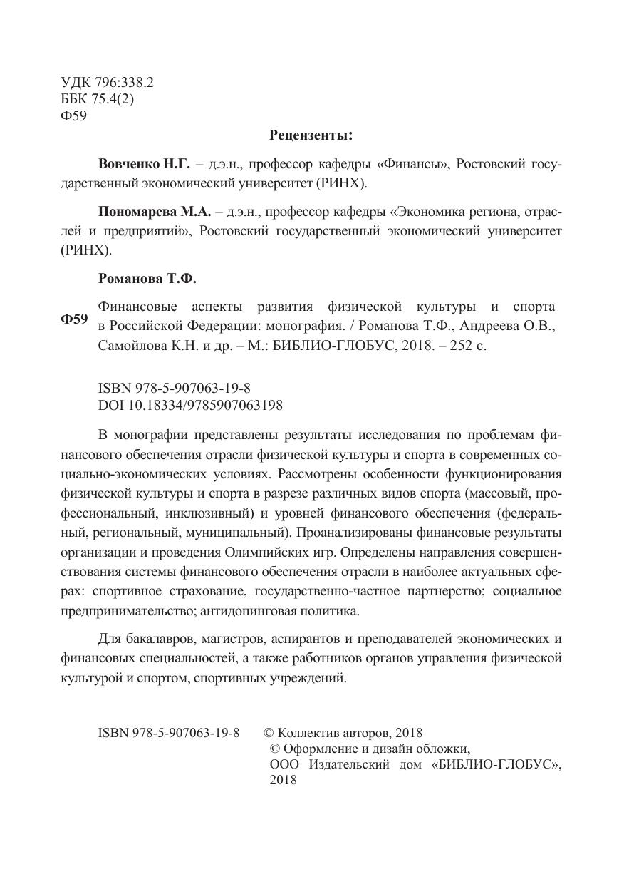 организации и проведения Олимпийских игр. Определены направления совершенствования системы финансового обеспечения отрасли в наиболее актуальных сферах: спортивное страхование, государственно-частное партнерство; социальное предпринимательство; антидопинговая политика.