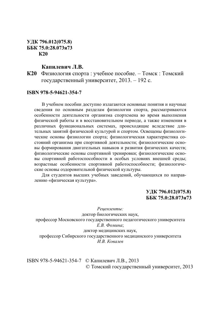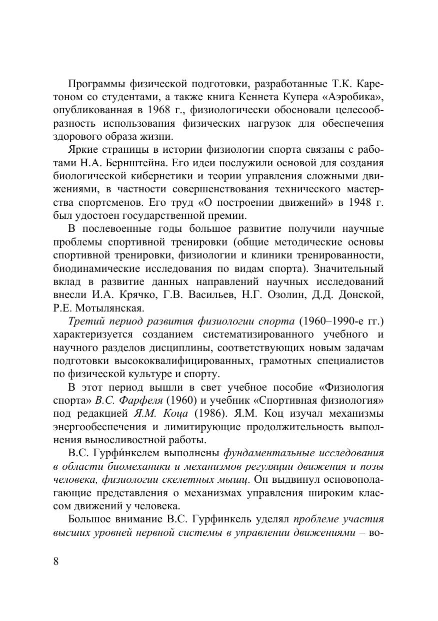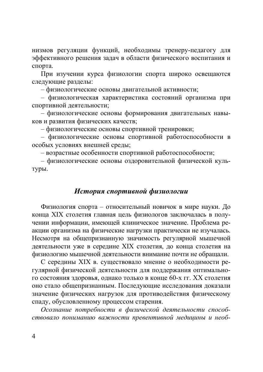 В учебном пособии доступно излагаются основные понятия и научные сведения по основным разделам физиологии спорта, рассматриваются особенности деятельности организма спортсмена во время выполнения физической работы и в восстановительном периоде, а также изменения в различных функциональных системах, происходящие вследствие длительных занятий физической культурой и спортом. Освещены физиологические основы физиологии спорта, физиологическая характеристика состояний организма при спортивной деятельности, физиологические основы формирования двигательных навыков и развития физических качеств, физиологические основы спортивной тренировки, физиологические основы спортивной работоспособности в особых условиях внешней среды, возрастные особенности спортивной работоспособности, физиологические основы оздоровительной физической культуры. Для студентов высших учебных заведений, обучающихся по направлению «физическая культура».