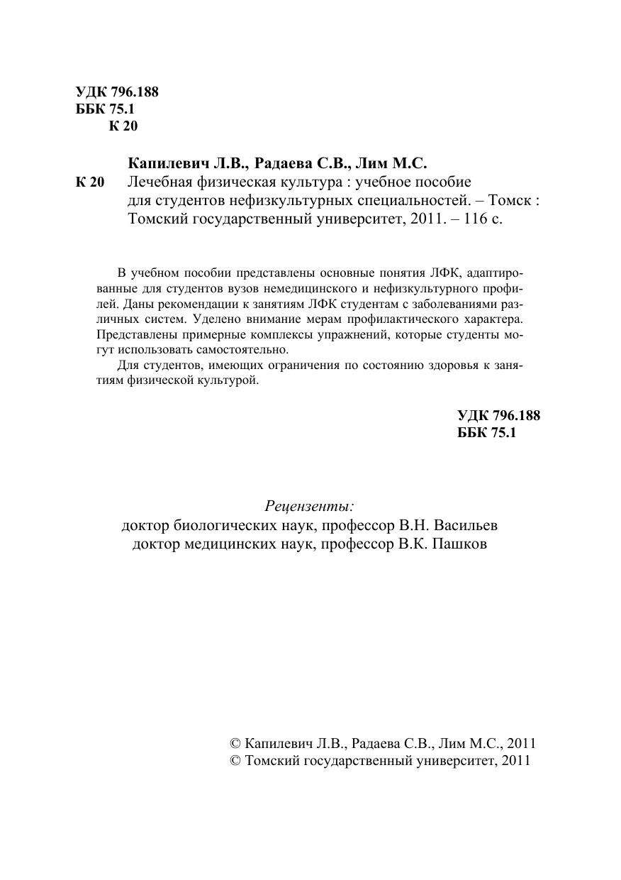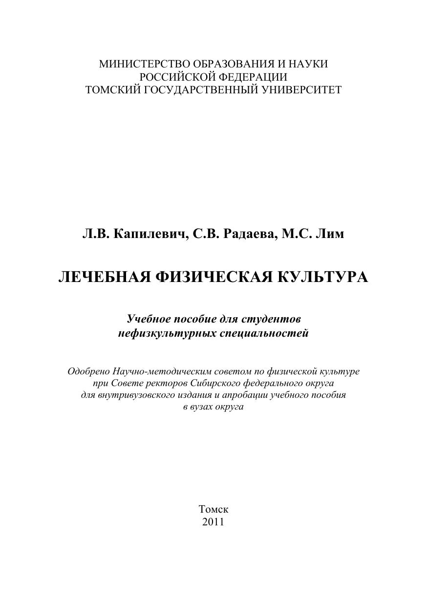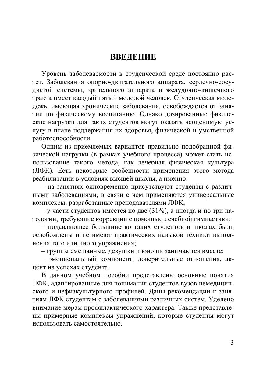 В учебном пособии представлены основные понятия ЛФК, адаптированные для студентов вузов немедицинского и нефизкультурного профилей. Даны рекомендации к занятиям ЛФК студентам с заболеваниями различных систем. Уделено внимание мерам профилактического характера. Представлены примерные комплексы упражнений, которые студенты могут использовать самостоятельно. Для студентов, имеющих ограничения по состоянию здоровья к занятиям физической культурой.