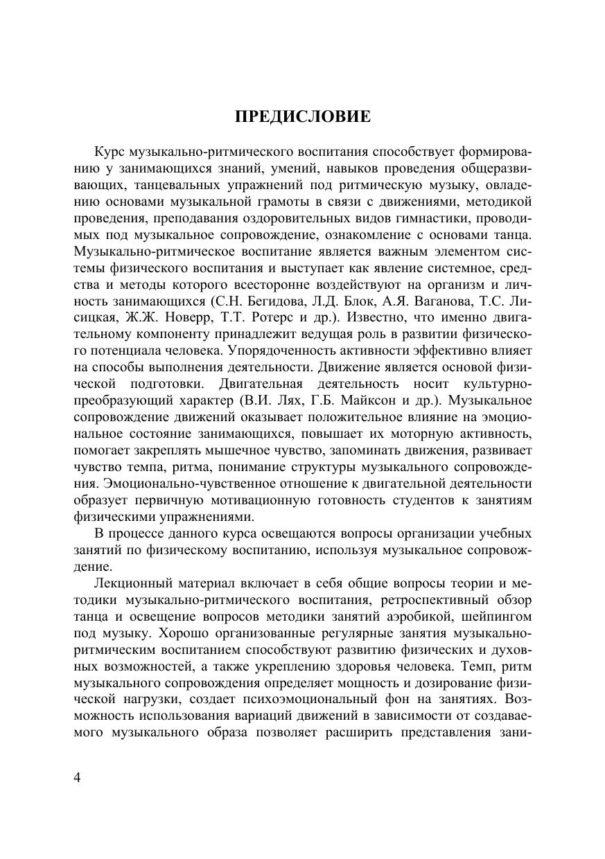 В учебно-методическом пособии дана современная трактовка понятия музыкально-ритмического воспитания. Представлены разделы об историческом развитии хореографии и танца, основных средствах, методических особенностях музыкально ритмического воспитания. Изложены методические особенности занятий по аэробике и шейпингу, элементы музыкальной грамоты, взаимосвязь упражнений и музыки. Учебно-методическое пособие предназначено для специалистов по физическому воспитанию, инструкторов по оздоровительным видам гимнастики, преподавателей и студентов физкультурных вузов.