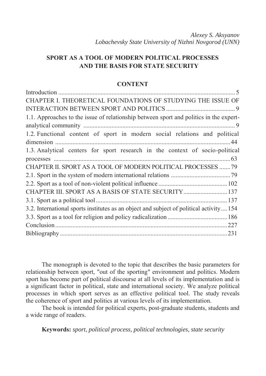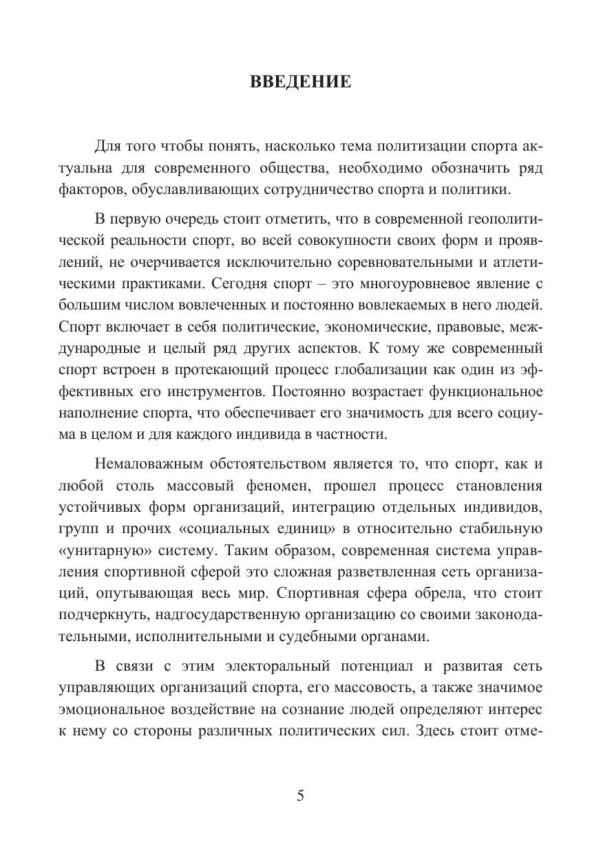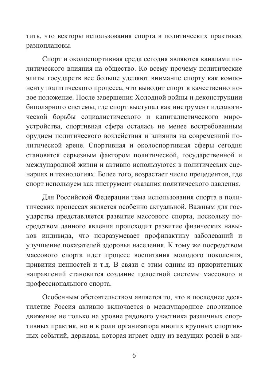 Монография посвящена теме, которая отражает основные параметры взаимоотношений спорта, околоспортивной среды и политической сферы. Современный спорт стал частью политического дискурса на всех уровнях его реализации и является весомым фактором политической, государственной и международной жизни общества. Анализируются политические процессы, в которых спортивная сфера выступает в качестве действенного политического инструмента. Проведенное исследование позволяет констатировать когерентность спорта и политики на различных уровнях ее реализации.