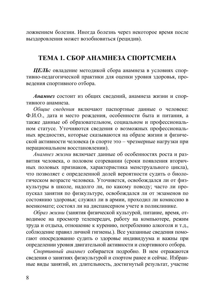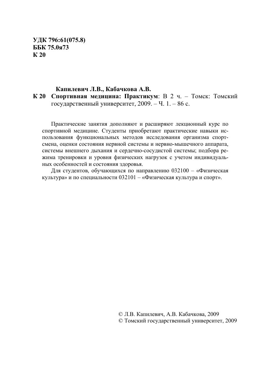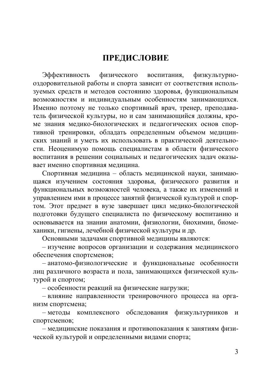 Практические занятия дополняют и расширяют лекционный курс по спортивной медицине. Студенты приобретают практические навыки использования функциональных методов исследования организма спортсмена, оценки состояния нервной системы и нервно-мышечного аппарата, системы внешнего дыхания и сердечно-сосудистой системы, подбора режима тренировки и уровня физических нагрузок с учетом индивидуальных особенностей и состояния здоровья. Для студентов, обучающихся по направлению 032100 – «Физическая культура» и по специальности 032101 – «Физическая культура и спорт».