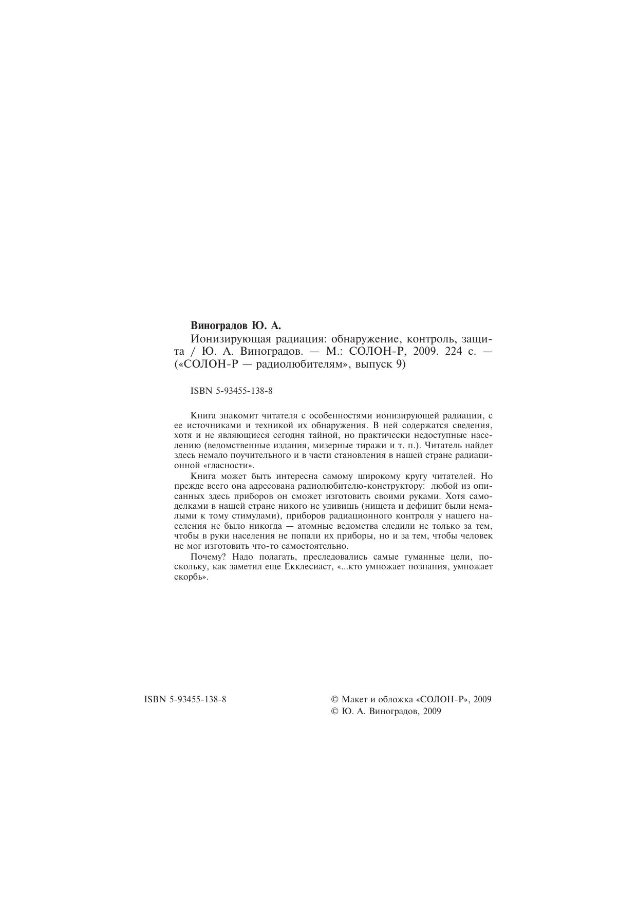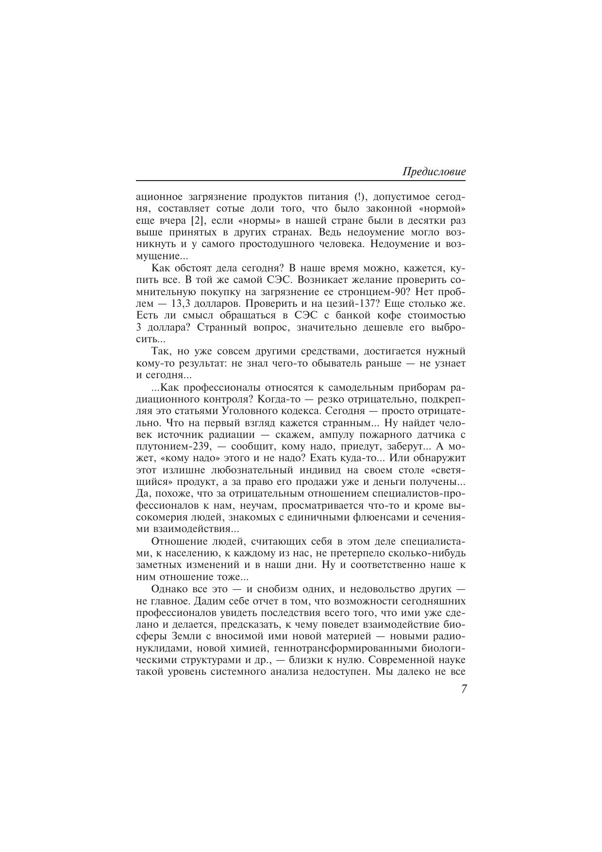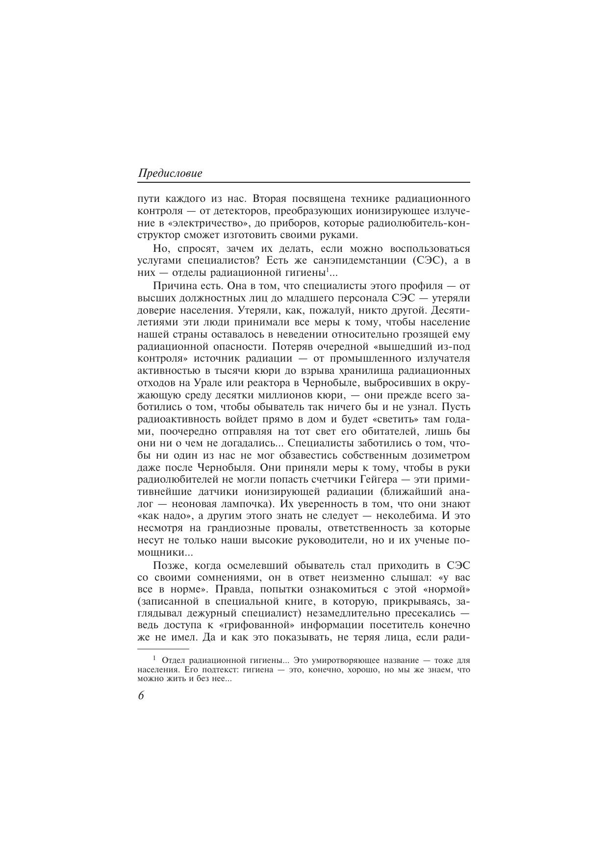 Книга знакомит читателя с особенностями ионизирующей радиации, с ее источниками и техникой их обнаружения. В ней содержатся сведения, хотя и не являющиеся сегодня тайной, но практически недоступные населению (ведомственные издания, мизерные тиражи и т. п.). Читатель найдет здесь немало поучительного и в части становления в нашей стране радиационной «гласности». Книга может быть интересна самому широкому кругу читателей. Но прежде всего она адресована радиолюбителю-конструктору: любой из описанных здесь приборов он сможет изготовить своими руками. Хотя самоделками в нашей стране никого не удивишь (нищета и дефицит были немалыми к тому стимулами), приборов радиационного контроля у нашего населения не было никогда — атомные ведомства следили не только за тем, чтобы в руки населения не попали их приборы, но и за тем, чтобы человек не мог изготовить что-то самостоятельно.