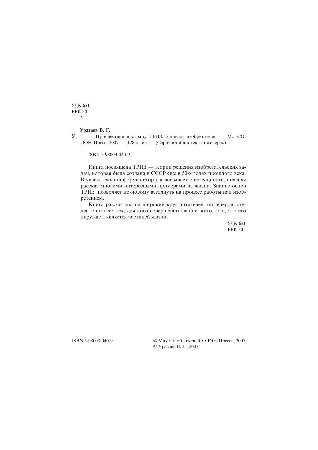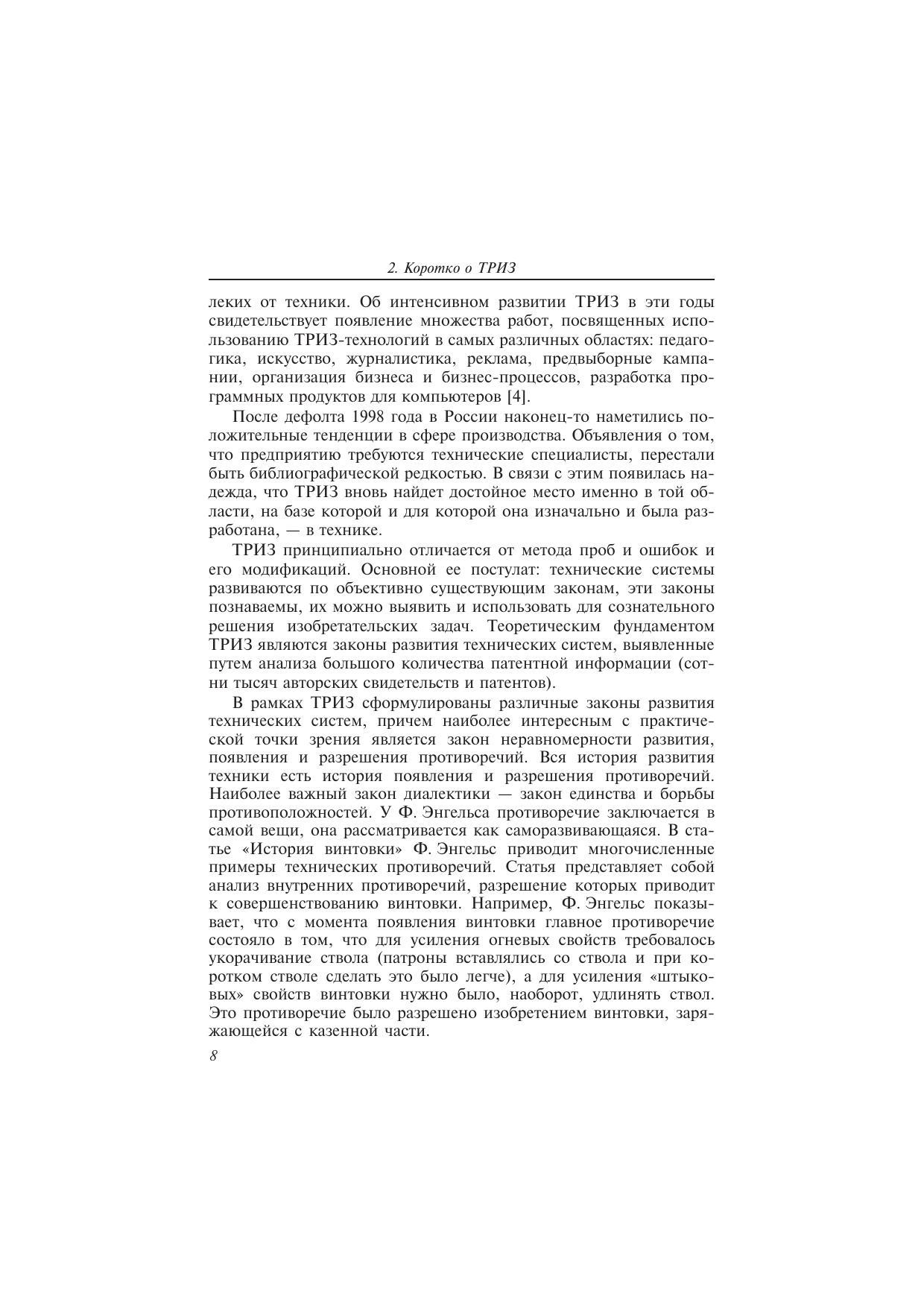 Книга посвящена ТРИЗ — теории решения изобретательских задач, которая была создана в СССР еще в 50-х годах прошлого века. В увлекательной форме автор рассказывает о ее сущности, поясняя рассказ многими интересными примерами из жизни. Знание основ ТРИЗ позволяет по-новому взглянуть на процесс работы над изобретением. Книга рассчитана на широкий круг читателей: инженеров, студентов и всех тех, для кого совершенствование всего того, что его окружает, является частицей жизни.
