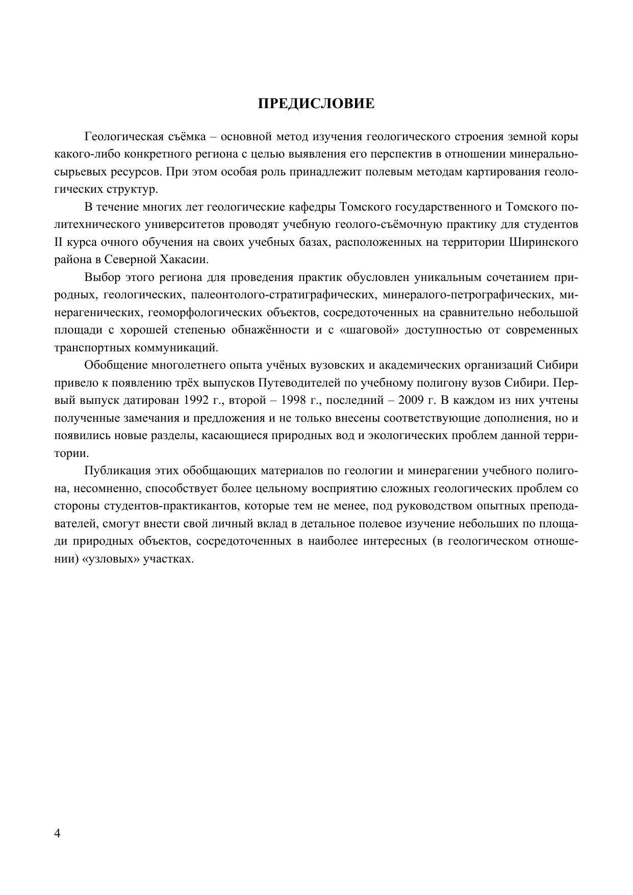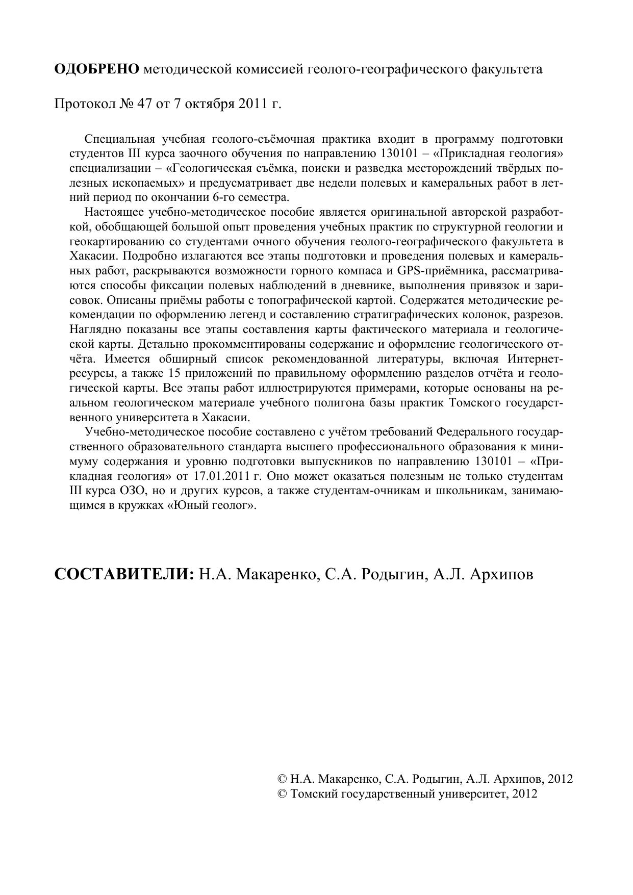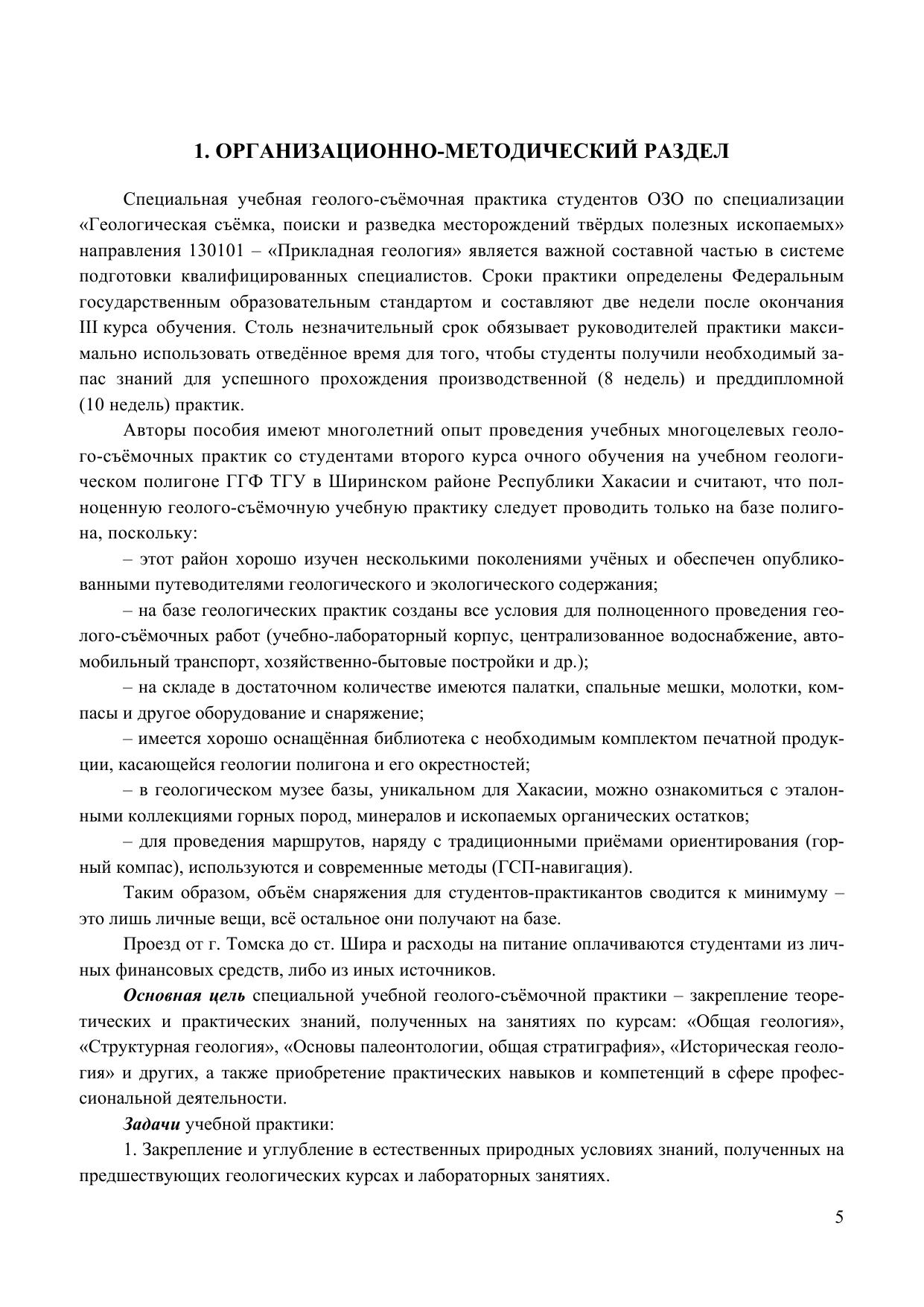 Специальная учебная геолого-съёмочная практика входит в программу подготовки студентов III курса заочного обучения по направлению 130101 – «Прикладная геология» специализации – «Геологическая съёмка, поиски и разведка месторождений твёрдых полезных ископаемых» и предусматривает две недели полевых и камеральных работ в летний период по окончании 6-го семестра. Настоящее учебно-методическое пособие является оригинальной авторской разработкой, обобщающей большой опыт проведения учебных практик по структурной геологии и геокартированию со студентами очного обучения геолого-географического факультета в Хакасии. Подробно излагаются все этапы подготовки и проведения полевых и камеральных работ, раскрываются возможности горного компаса и GPS-приёмника, рассматриваются способы фиксации полевых наблюдений в дневнике, выполнения привязок и зарисовок. Описаны приёмы работы с топографической картой. Содержатся методические рекомендации по оформлению легенд и составлению стратиграфических колонок, разрезов. Наглядно показаны все этапы составления карты фактического материала и геологической карты. Детально прокомментированы содержание и оформление геологического отчёта. Имеется обширный список рекомендованной литературы, включая Интернет-ресурсы, а также 15 приложений по правильному оформлению разделов отчёта и геологической карты. Все этапы работ иллюстрируются примерами, которые основаны на реальном геологическом материале учебного полигона базы практик Томского государственного университета в Хакасии. Учебно-методическое пособие составлено с учётом требований Федерального государственного образовательного стандарта высшего профессионального образования к минимуму содержания и уровню подготовки выпускников по направлению 130101 – «Прикладная геология» от 17.01.2011 г. Оно может оказаться полезным не только студентам III курса ОЗО, но и других курсов, а также студентам-очникам и школьникам, занимающимся в кружках «Юный геолог».