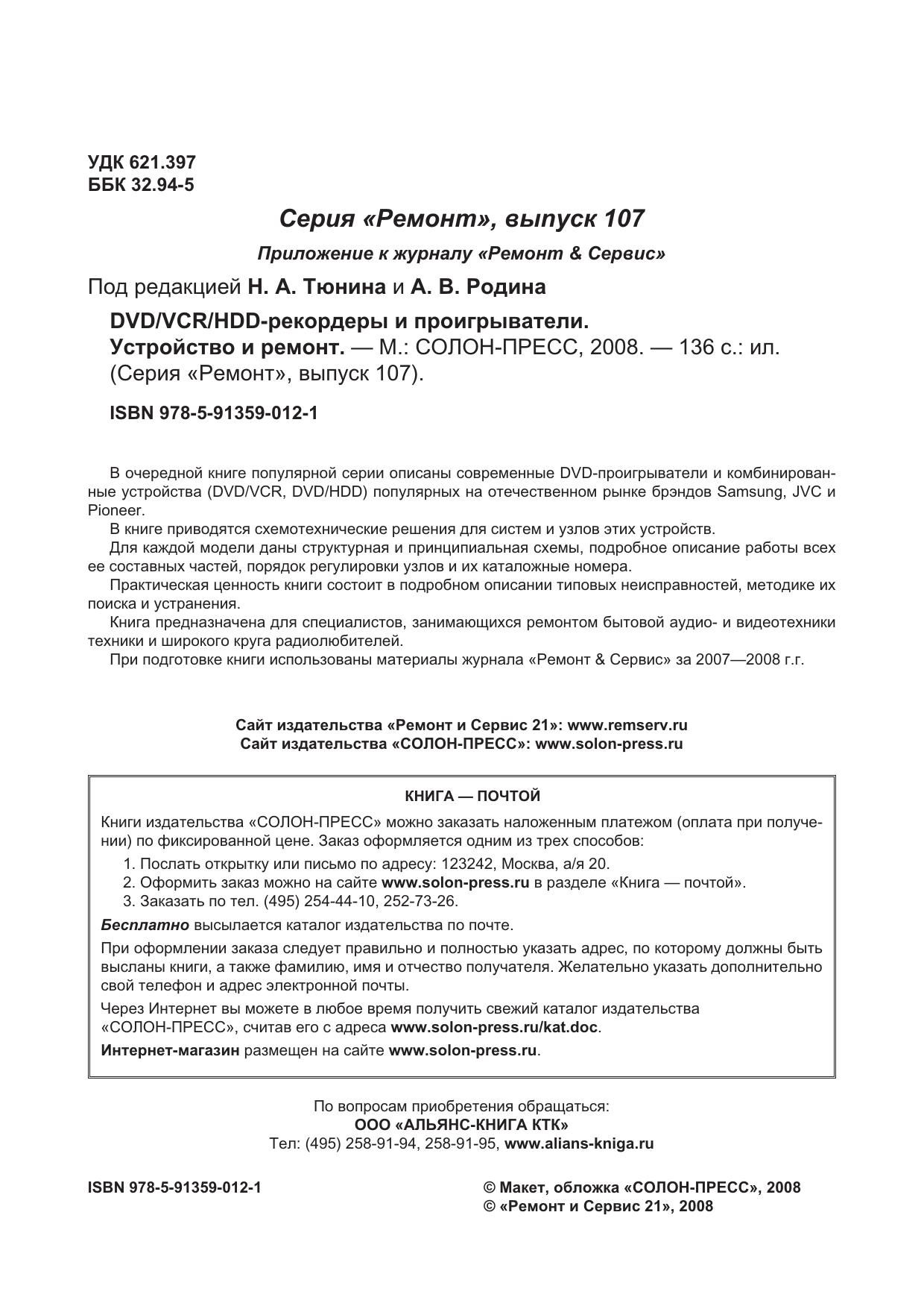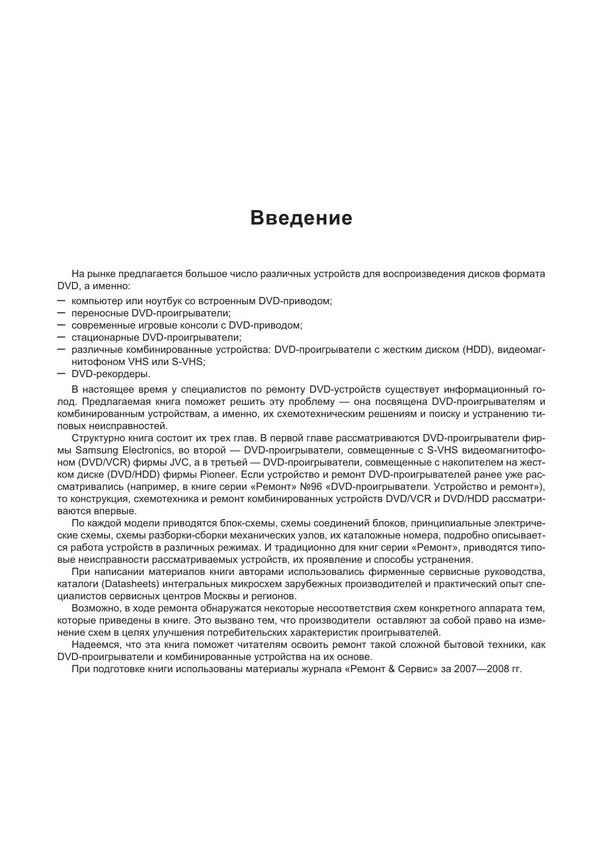В очередной книге популярной серии описаны современные DVD-проигрыватели и комбинированные устройства (DVD/VCR, DVD/HDD) популярных на отечественном рынке брэндов Samsung, JVC и Pioneer. В книге приводятся схемотехнические решения для систем и узлов этих устройств. Для каждой модели даны структурная и принципиальная схемы, подробное описание работы всех ее составных частей, порядок регулировки узлов и их каталожные номера. Практическая ценность книги состоит в подробном описании типовых неисправностей, методике их поиска и устранения. Книга предназначена для специалистов, занимающихся ремонтом бытовой аудио- и видеотехники техники и широкого круга радиолюбителей. При подготовке книги использованы материалы журнала «Ремонт & Сервис» за 2007—2008 г.г.