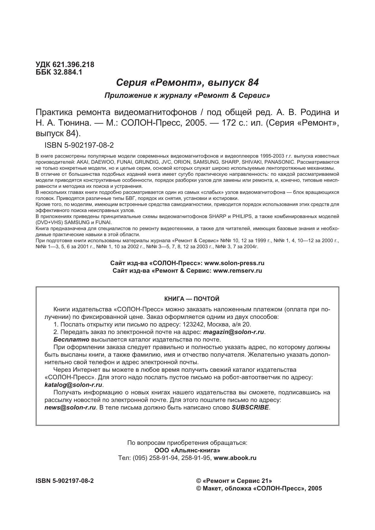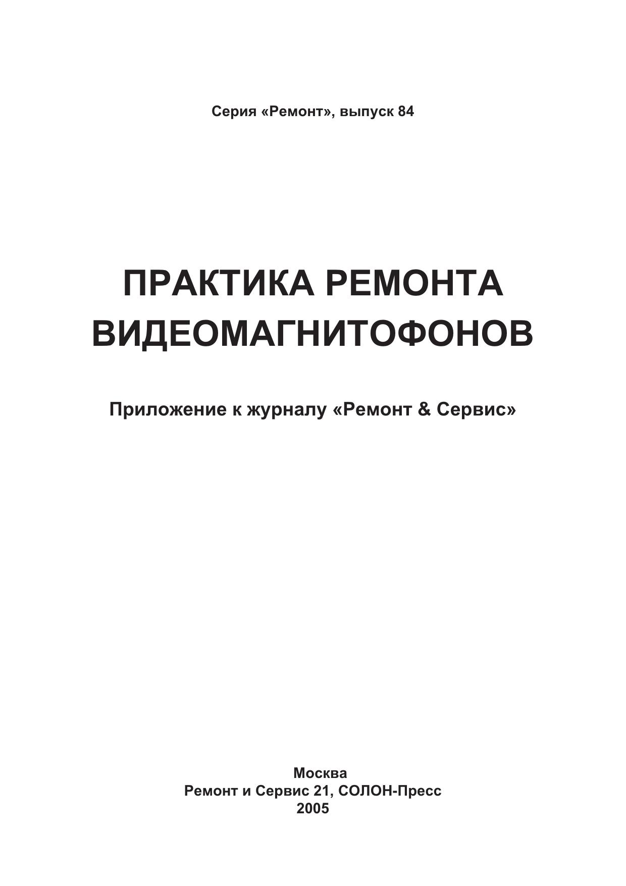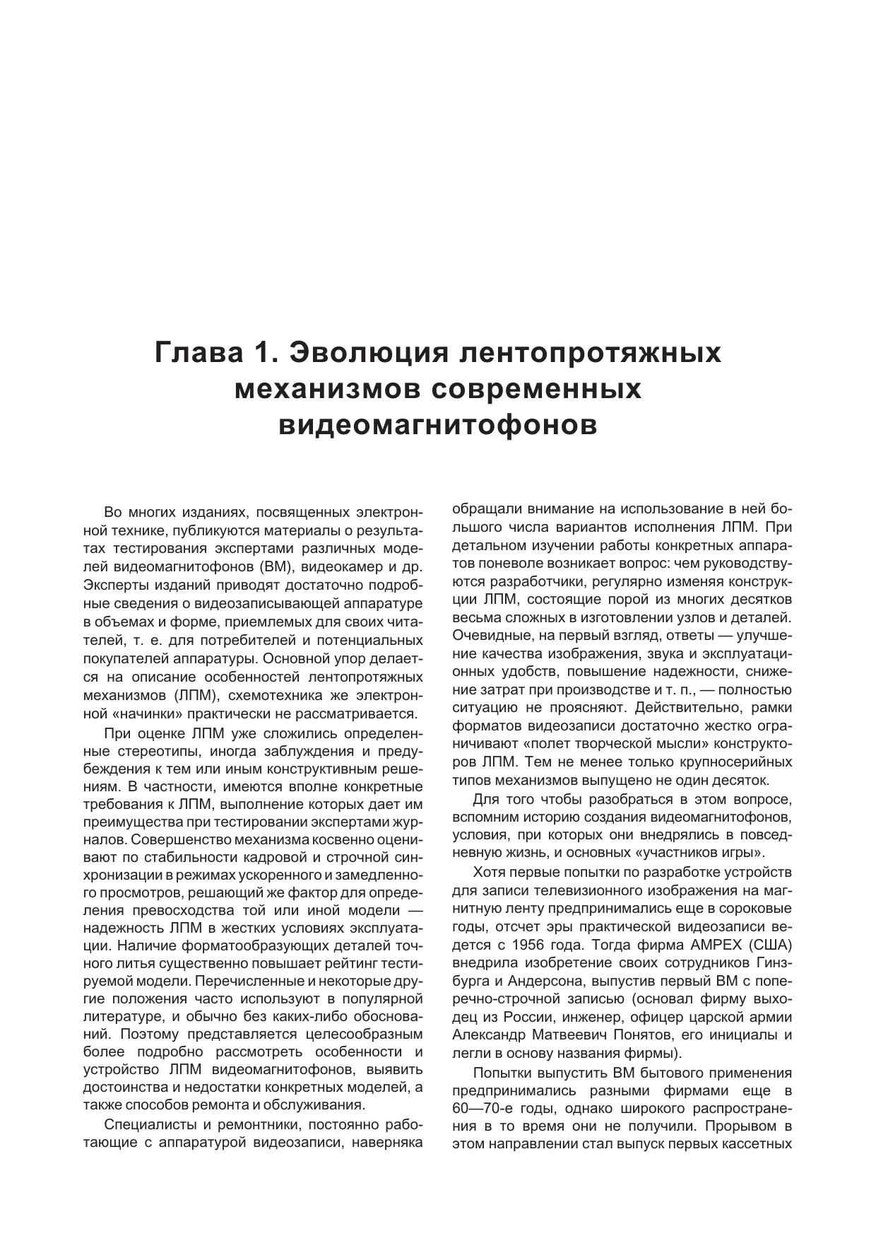 В книге рассмотрены популярные модели современных видеомагнитофонов и видеоплееров 1995-2003 г.г. выпуска известных производителей: AKAI, DAEWOO, FUNAI, GRUNDIG, JVC, ORION, SAMSUNG, SHARP, SHIVAKI, PANASONIC. Рассматриваются не только конкретные модели, но и целые серии, основой которых служат широко используемые лентопротяжные механизмы. В отличие от большинства подобных изданий книга имеет сугубо практическую направленность: по каждой рассматриваемой модели приводятся конструктивные особенности, порядок разборки узлов для замены или ремонта, и, конечно, типовые неисправности и методика их поиска и устранения. В нескольких главах книги подробно рассматривается один из самых «слабых» узлов видеомагнитофона — блок вращающихся головок. Приводятся различные типы БВГ, порядок их снятия, установки и юстировки. Кроме того, по моделям, имеющим встроенные средства самодиагностики, приводится порядок использования этих средств для эффективного поиска неисправных узлов. В приложениях приведены принципиальные схемы видеомагнитофонов SHARP и PHILIPS, а также комбинированных моделей (DVD+VHS) SAMSUNG и FUNAI. Книга предназначена для специалистов по ремонту видеотехники, а также для читателей, имеющих базовые знания и необходимые практические навыки в этой области.