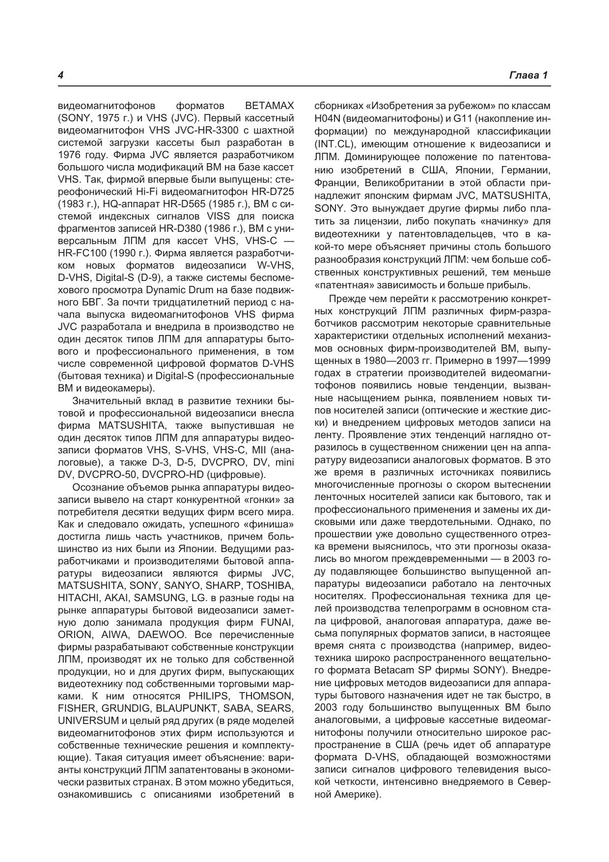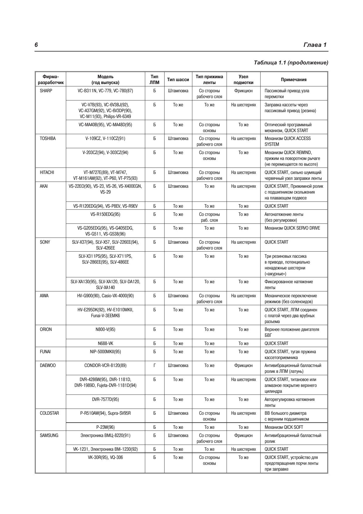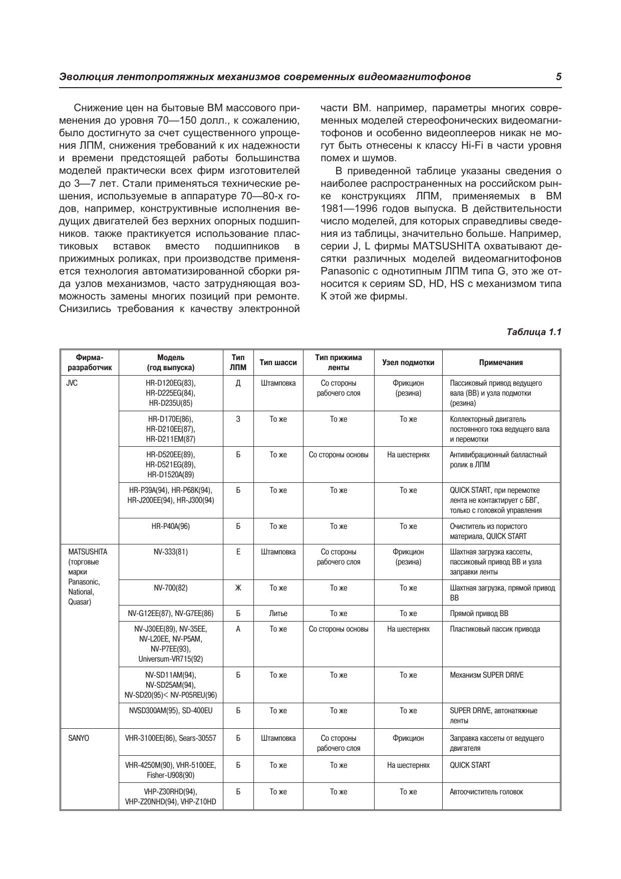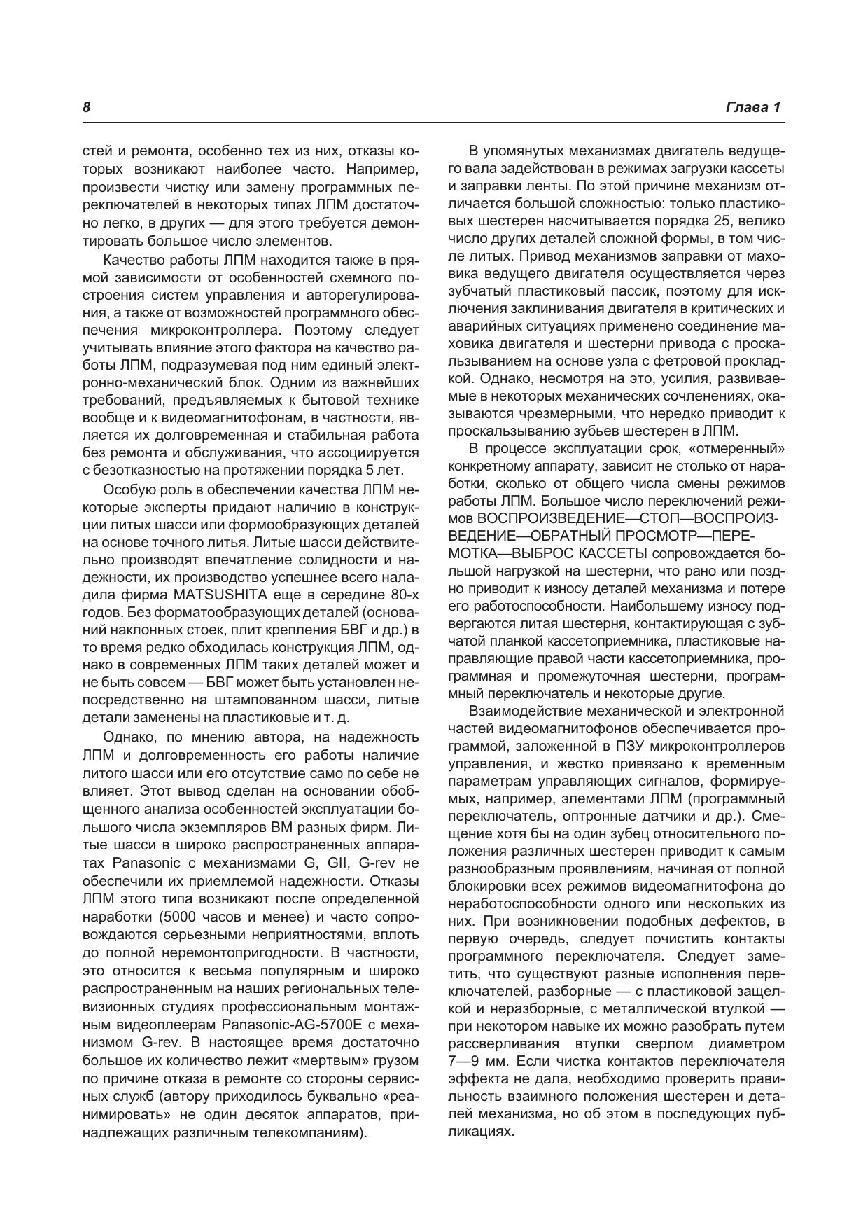 В книге рассмотрены популярные модели современных видеомагнитофонов и видеоплееров 1995-2003 г.г. выпуска известных производителей: AKAI, DAEWOO, FUNAI, GRUNDIG, JVC, ORION, SAMSUNG, SHARP, SHIVAKI, PANASONIC. Рассматриваются не только конкретные модели, но и целые серии, основой которых служат широко используемые лентопротяжные механизмы. В отличие от большинства подобных изданий книга имеет сугубо практическую направленность: по каждой рассматриваемой модели приводятся конструктивные особенности, порядок разборки узлов для замены или ремонта, и, конечно, типовые неисправности и методика их поиска и устранения. В нескольких главах книги подробно рассматривается один из самых «слабых» узлов видеомагнитофона — блок вращающихся головок. Приводятся различные типы БВГ, порядок их снятия, установки и юстировки. Кроме того, по моделям, имеющим встроенные средства самодиагностики, приводится порядок использования этих средств для эффективного поиска неисправных узлов. В приложениях приведены принципиальные схемы видеомагнитофонов SHARP и PHILIPS, а также комбинированных моделей (DVD+VHS) SAMSUNG и FUNAI. Книга предназначена для специалистов по ремонту видеотехники, а также для читателей, имеющих базовые знания и необходимые практические навыки в этой области.