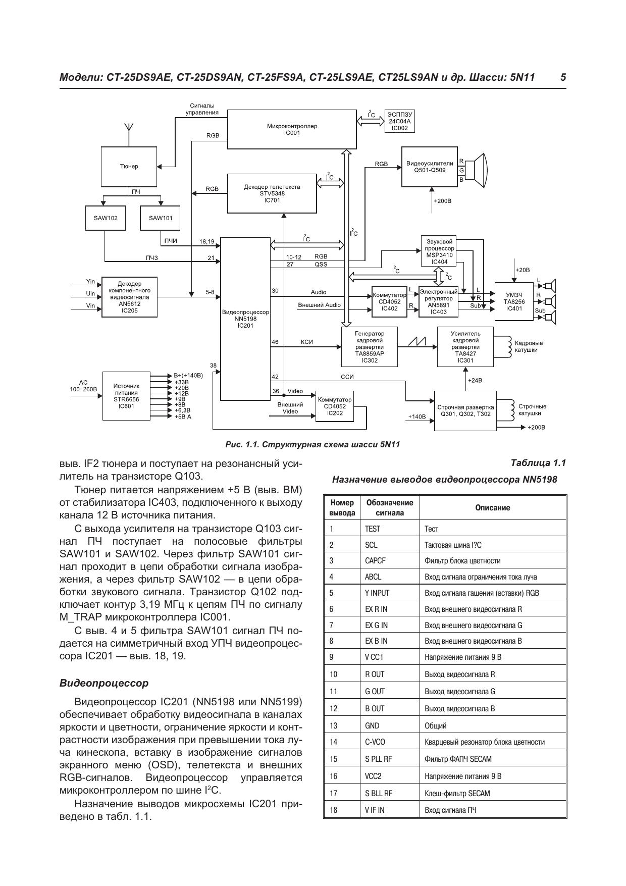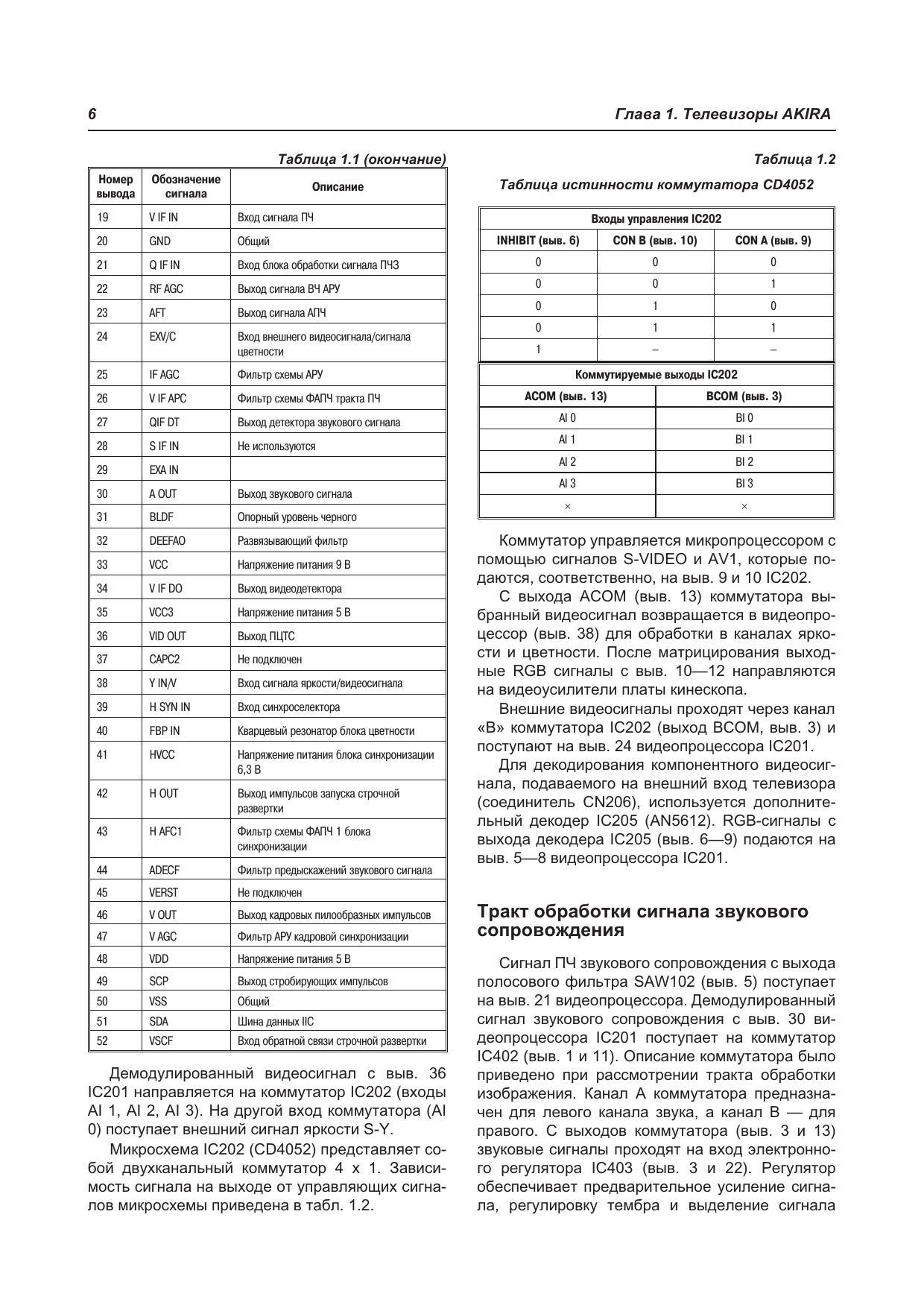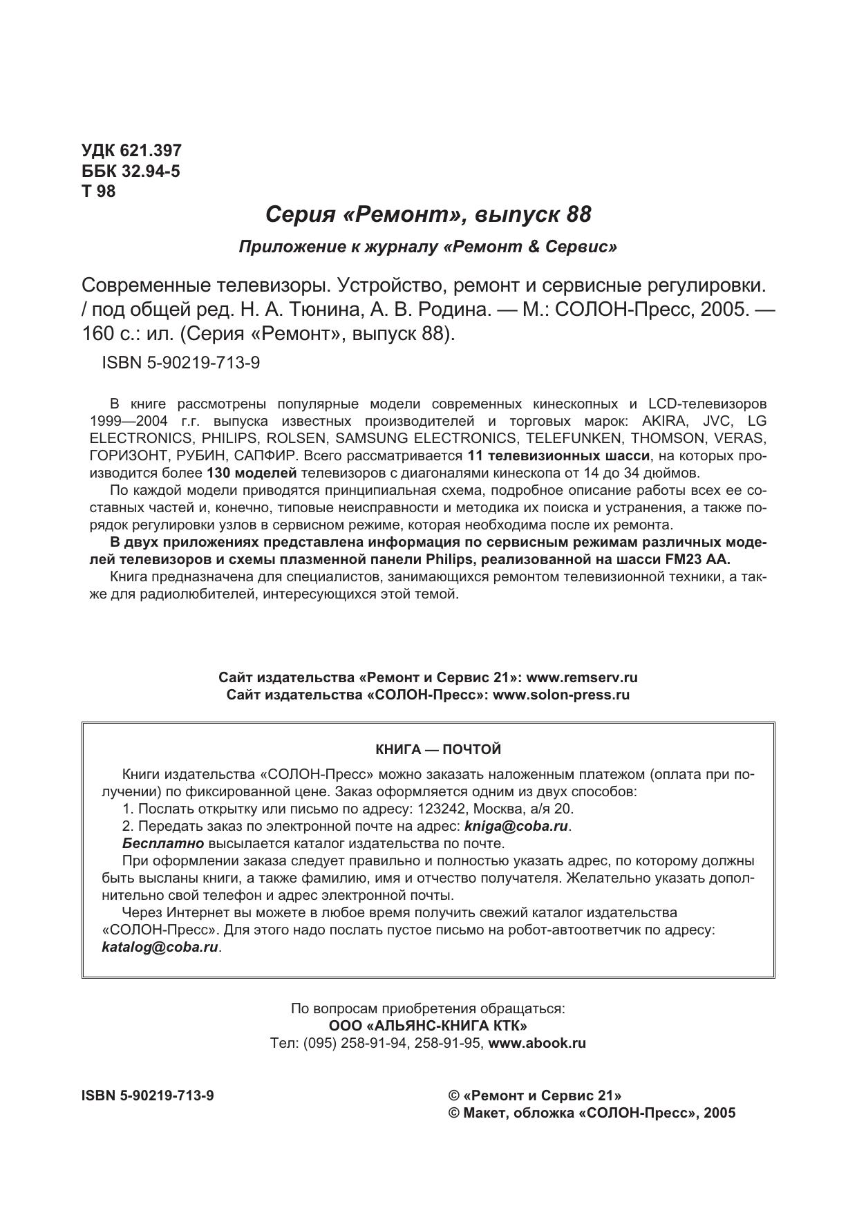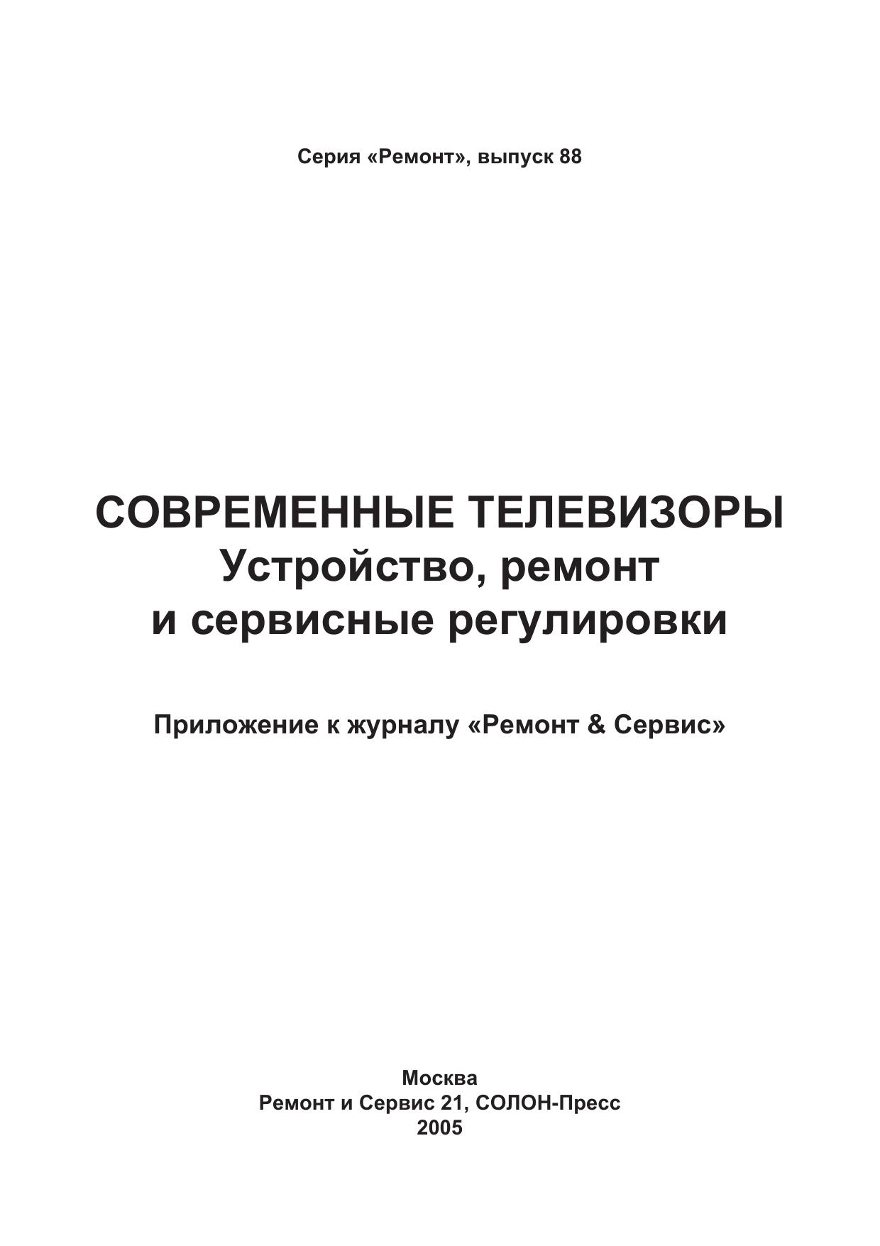 В книге рассмотрены популярные модели современных кинескопных и LCD-телевизоров 1999—2004 г.г. выпуска известных производителей и торговых марок: AKIRA, JVC, LG ELECTRONICS, PHILIPS, ROLSEN, SAMSUNG ELECTRONICS, TELEFUNKEN, THOMSON, VERAS, ГОРИЗОНТ, РУБИН, САПФИР. Всего рассматривается 11 телевизионных шасси, на которых производится более 130 моделей телевизоров с диагоналями кинескопа от 14 до 34 дюймов. По каждой модели приводятся принципиальная схема, подробное описание работы всех ее составных частей и, конечно, типовые неисправности и методика их поиска и устранения, а также порядок регулировки узлов в сервисном режиме, которая необходима после их ремонта. В двух приложениях представлена информация по сервисным режимам различных моделей телевизоров и схемы плазменной панели Philips, реализованной на шасси FM23 АА. Книга предназначена для специалистов, занимающихся ремонтом телевизионной техники, а также для радиолюбителей, интересующихся этой темой.