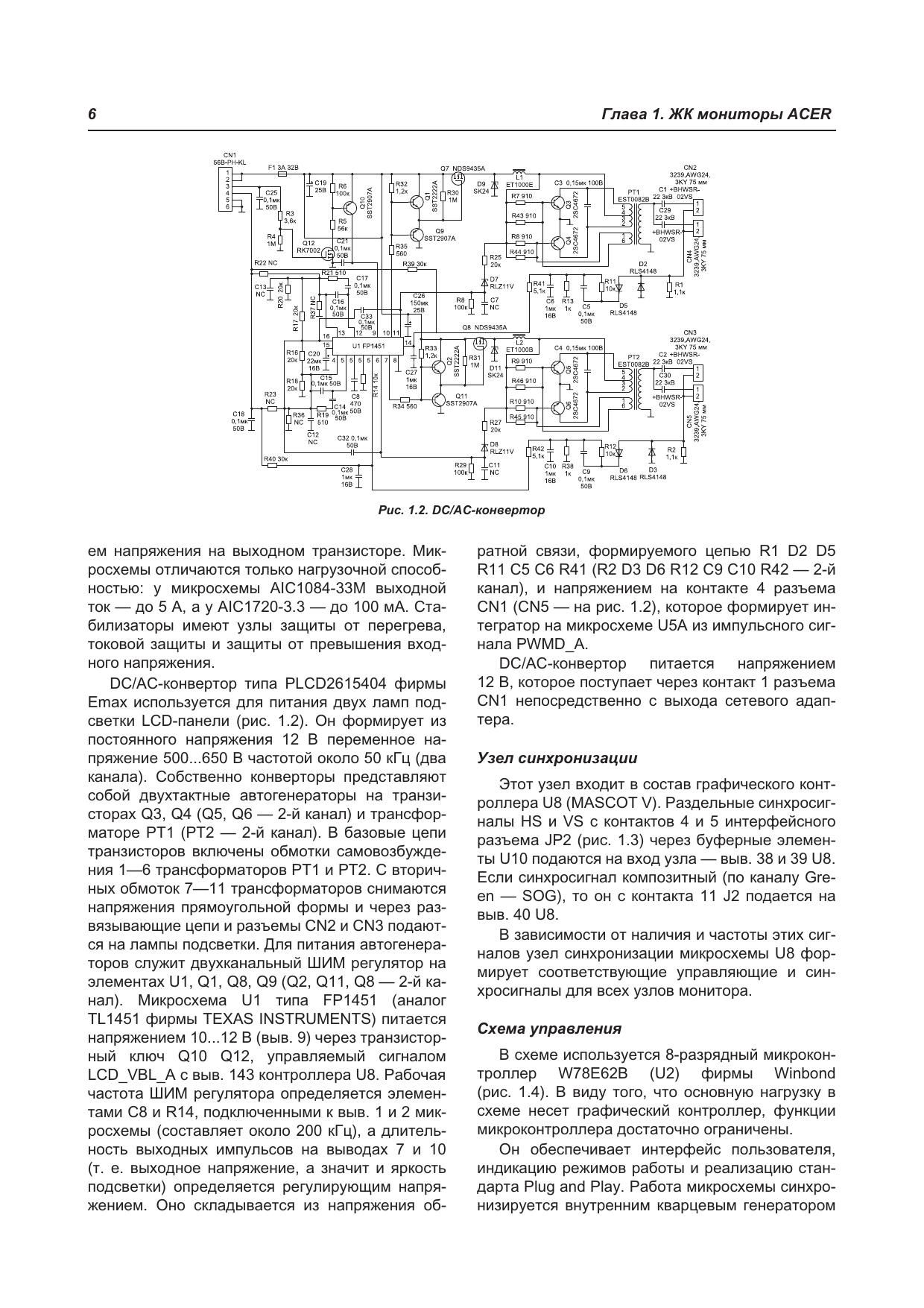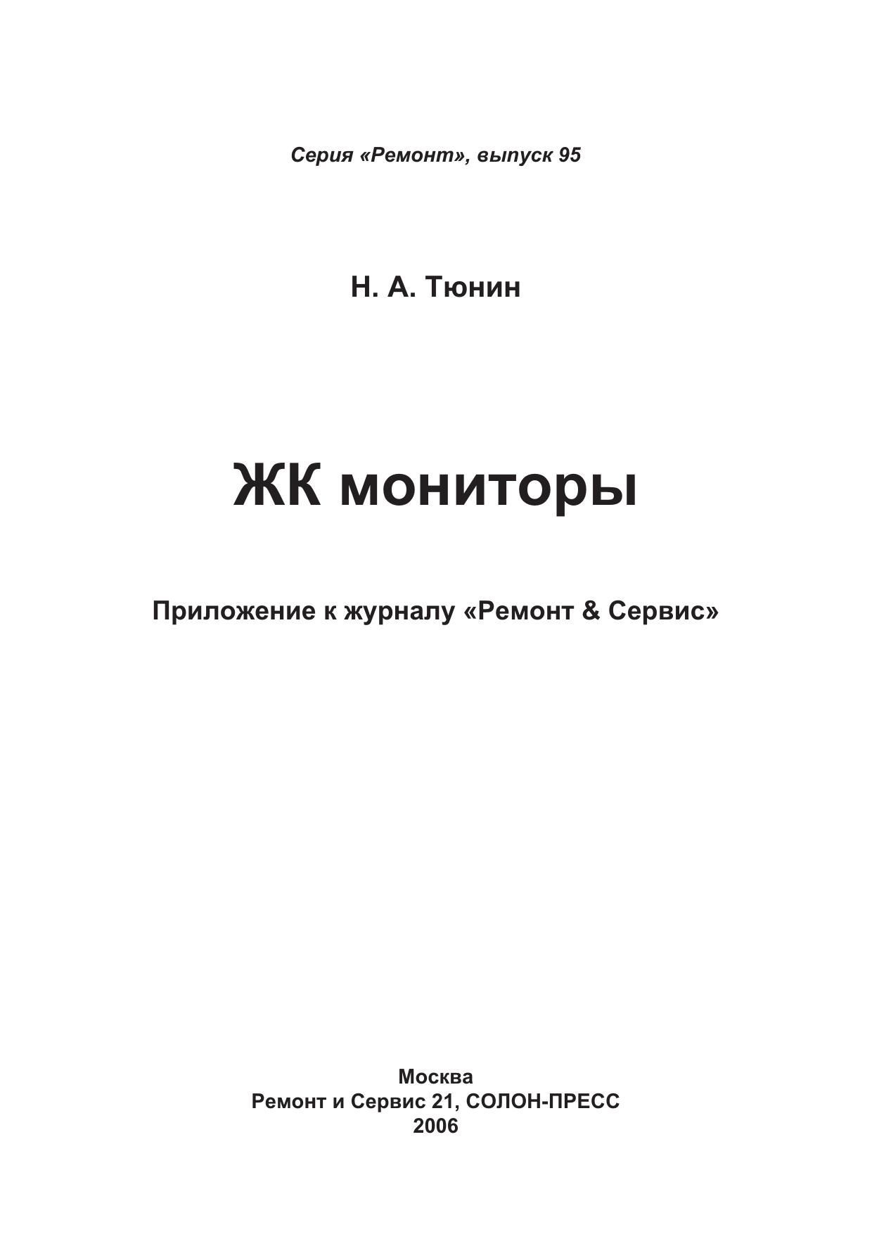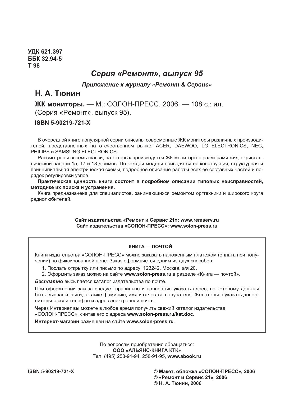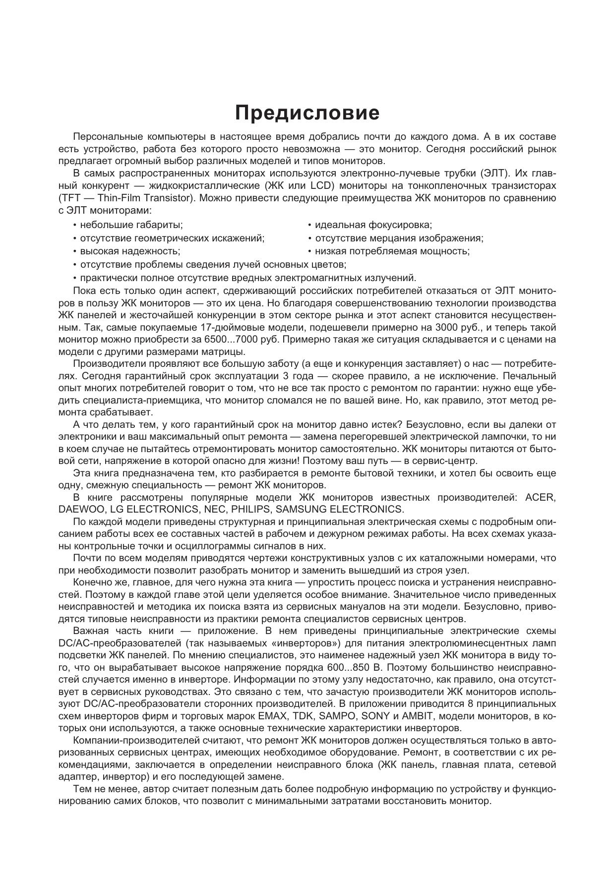 В очередной книге популярной серии описаны современные ЖК мониторы различных производителей, представленных на отечественном рынке: ACER, DAEWOO, LG ELECTRONICS, NEC, PHILIPS и SAMSUNG ELECTRONICS. Рассмотрены восемь шасси, на которых производятся ЖК мониторы с размерами жидкокристаллической панели 15, 17 и 18 дюймов. По каждой модели приводятся ее конструкция, структурная и принципиальная электрическая схемы, подробное описание работы всех ее составных частей и порядок регулировки узлов. Практическая ценность книги состоит в подробном описании типовых неисправностей, методике их поиска и устранения. Книга предназначена для специалистов, занимающихся ремонтом оргтехники и широкого круга радиолюбителей.