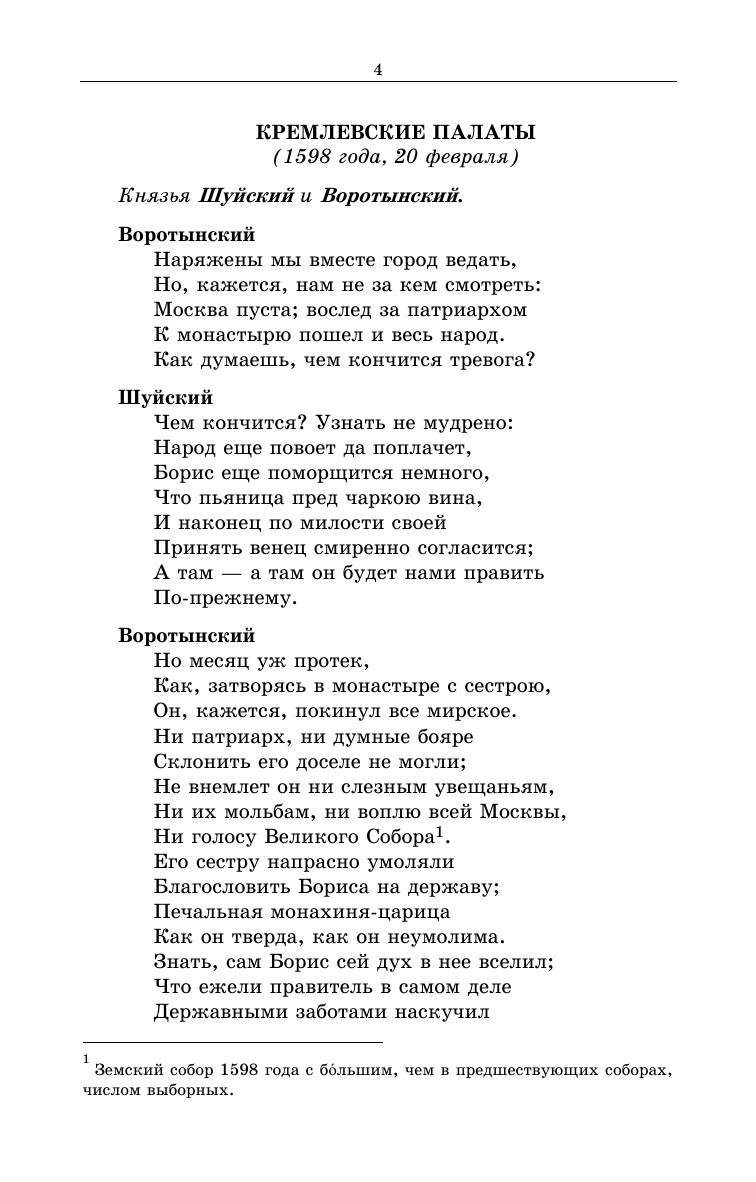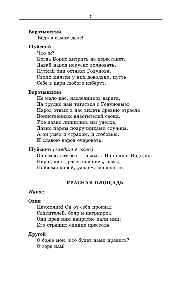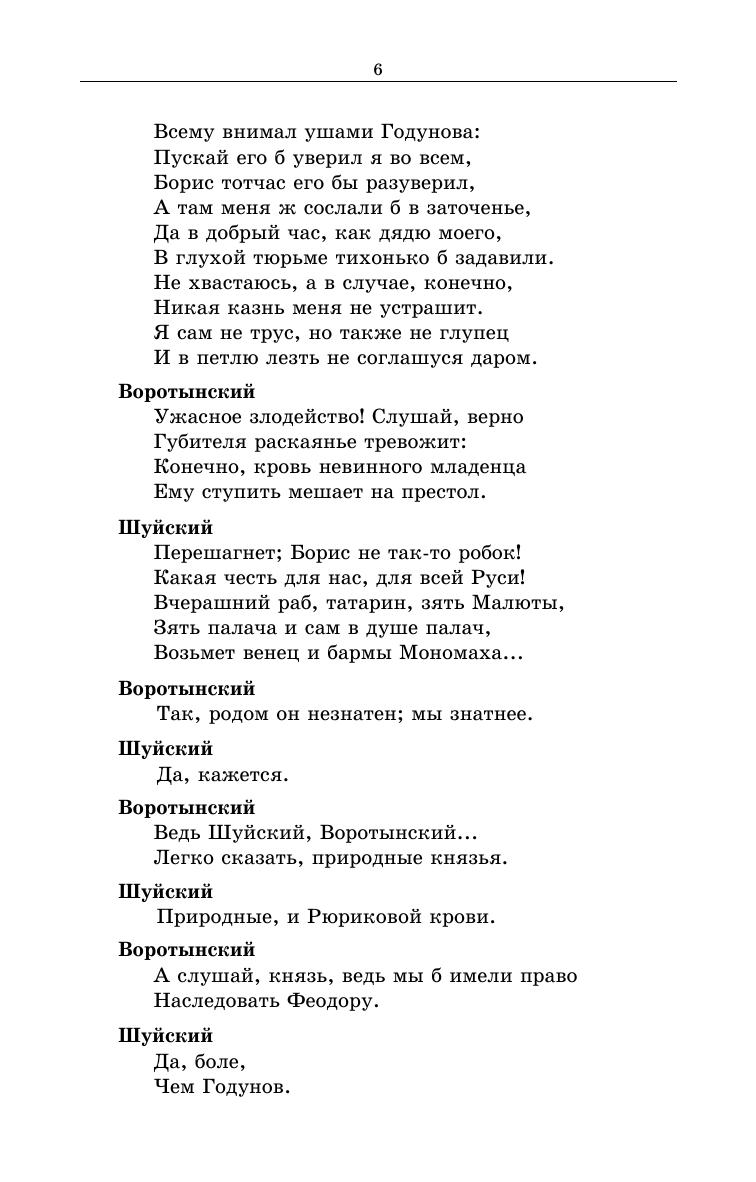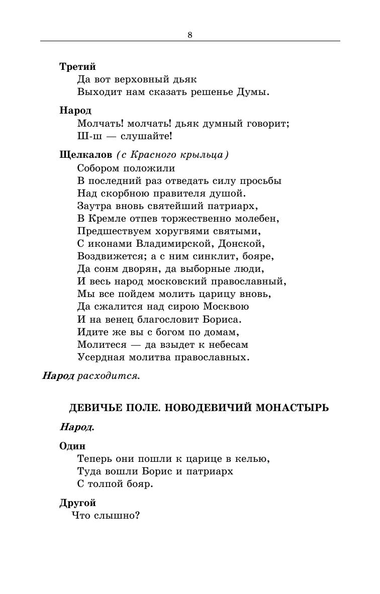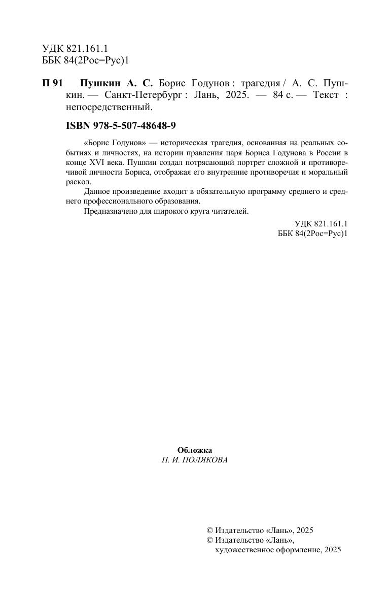 «Борис Годунов» — историческая трагедия, основанная на реальных событиях и личностях, на истории правления царя Бориса Годунова в России в конце XVI века. Пушкин создал потрясающий портрет сложной и противоречивой личности Бориса, отображая его внутренние противоречия и моральный раскол. Данное произведение входит в обязательную программу среднего и среднего профессионального образования. Предназначено для широкого круга читателей.