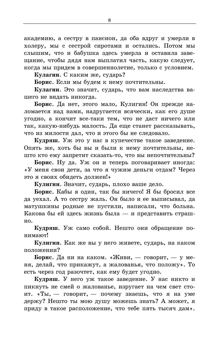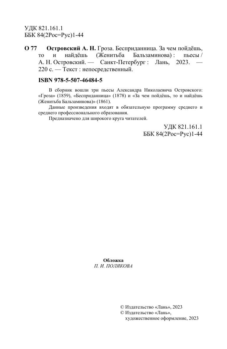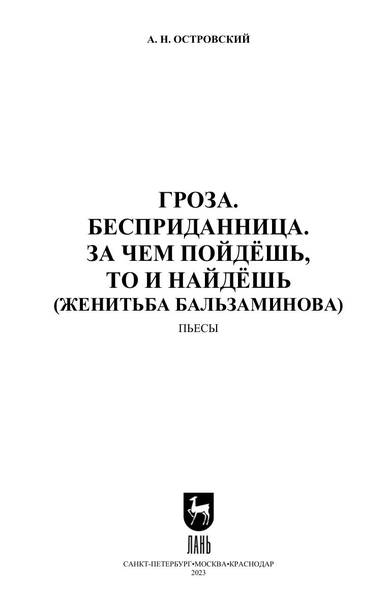 В сборник вошли три пьесы Александра Николаевича Островского: «Гроза» (1859), «Бесприданница» (1878) и «За чем пойдёшь, то и найдёшь (Женитьба Бальзаминова)» (1861). Данные произведения входят в обязательную программу среднего и среднего профессионального образования. Предназначено для широкого круга читателей.