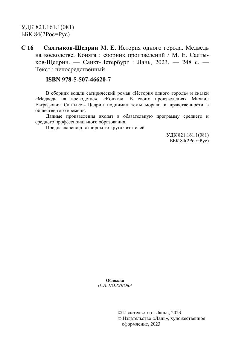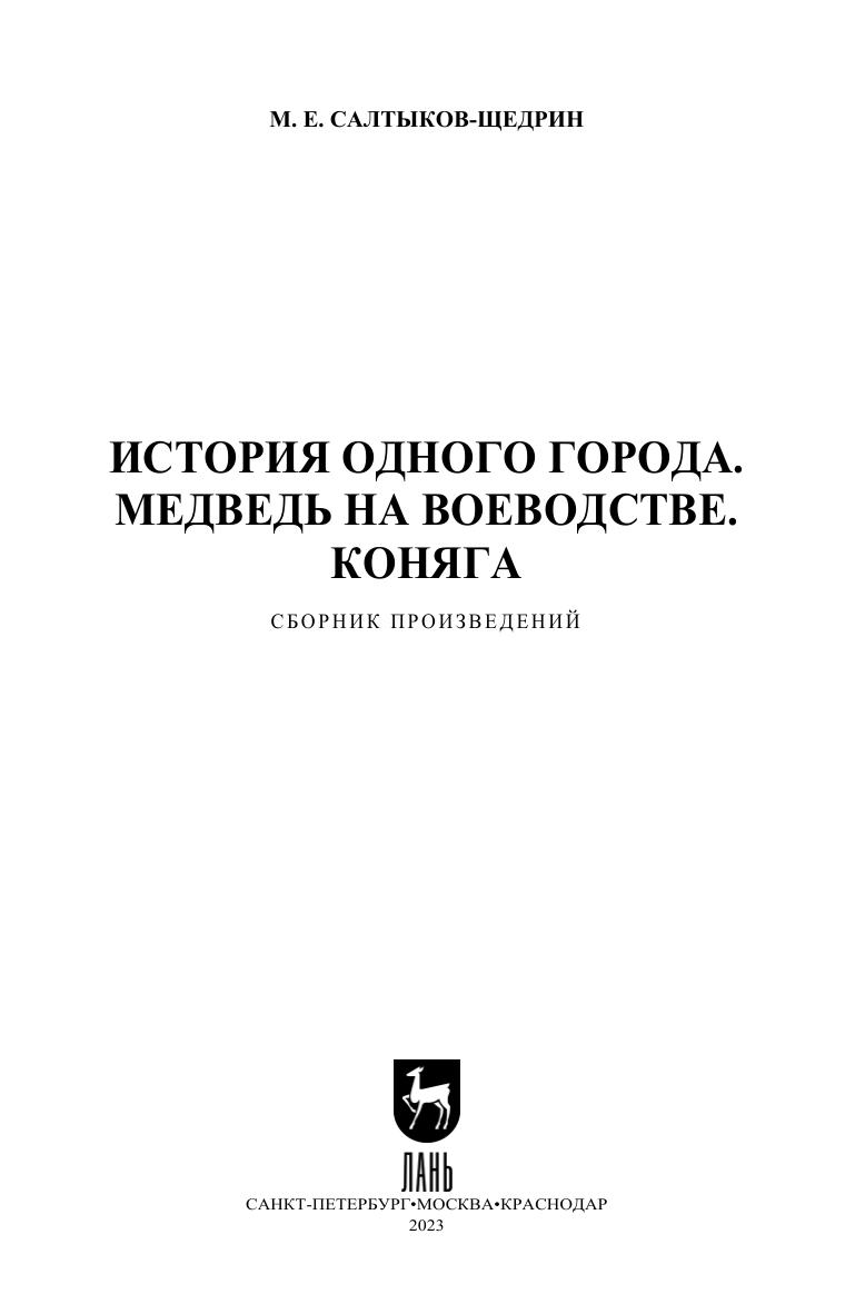 В сборник вошли сатирический роман «История одного города» и сказки «Медведь на воеводстве», «Коняга». В своих произведениях Михаил Евграфович Салтыков-Щедрин поднимал темы морали и нравственности в обществе того времени. Данные произведения входят в обязательную программу среднего и среднего профессионального образования. Предназначено для широкого круга читателей.