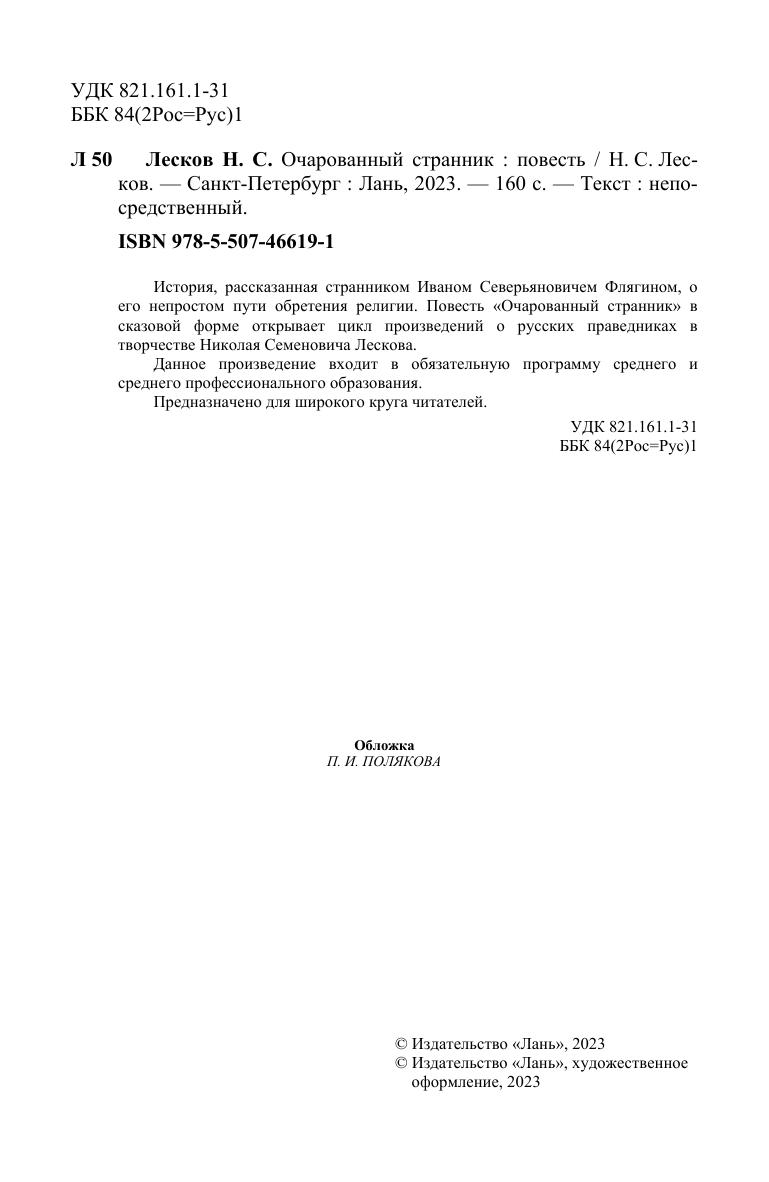 История, рассказанная странником Иваном Северьяновичем Флягином, о его непростом пути обретения религии. Повесть «Очарованный странник» в сказовой форме открывает цикл произведений о русских праведниках в творчестве Николая Семеновича Лескова. Данное произведение входит в обязательную программу среднего и среднего профессионального образования. Предназначено для широкого круга читателей.
