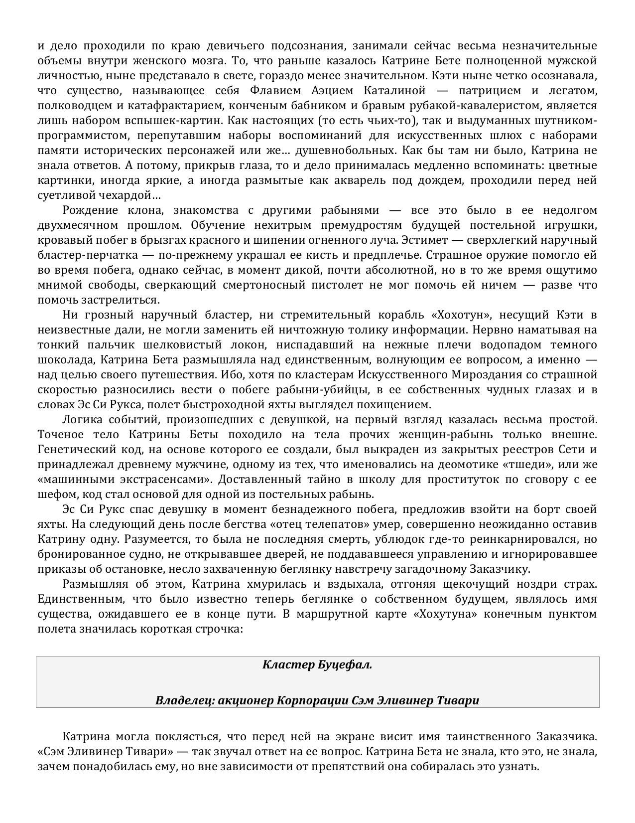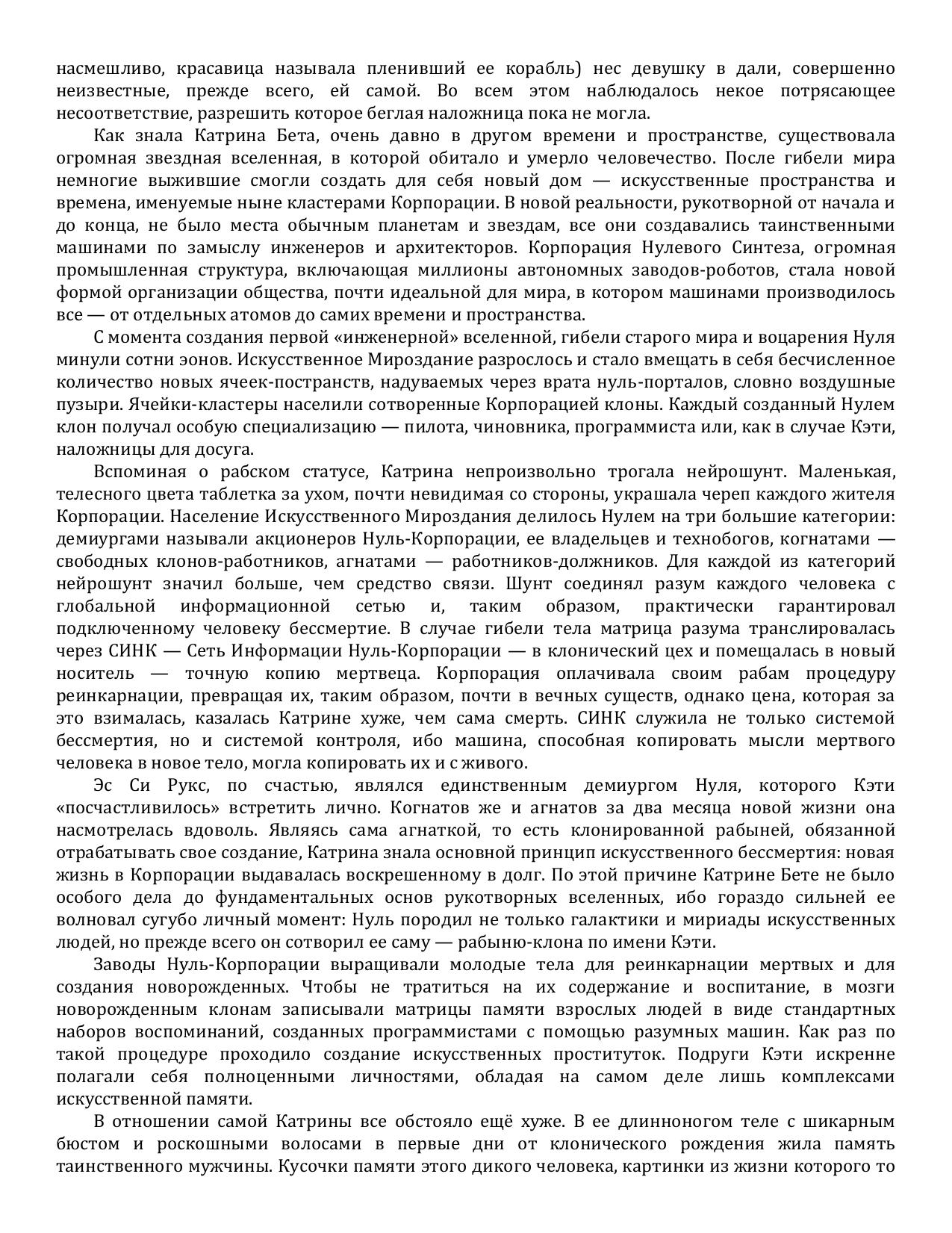 Катрина - агнатка с телом прекрасной женщины, памятью легата Флавия Аэция Катилины и способностями экстрасенса-тшеди - после побега из школы наложниц отправляется на встречу с таинственным Заказчиком, по воле которого она, существо с такой странной комбинацией качеств, шагнула на свет из клонической колбы. Собственно, у неё нет выбора: корабль, на котором она бежала из школы, сам по себе движется в сторону далёкой частной вселенной и не подчиняется командам. Катрина ждёт, что Заказчик ответит на её вопросы...