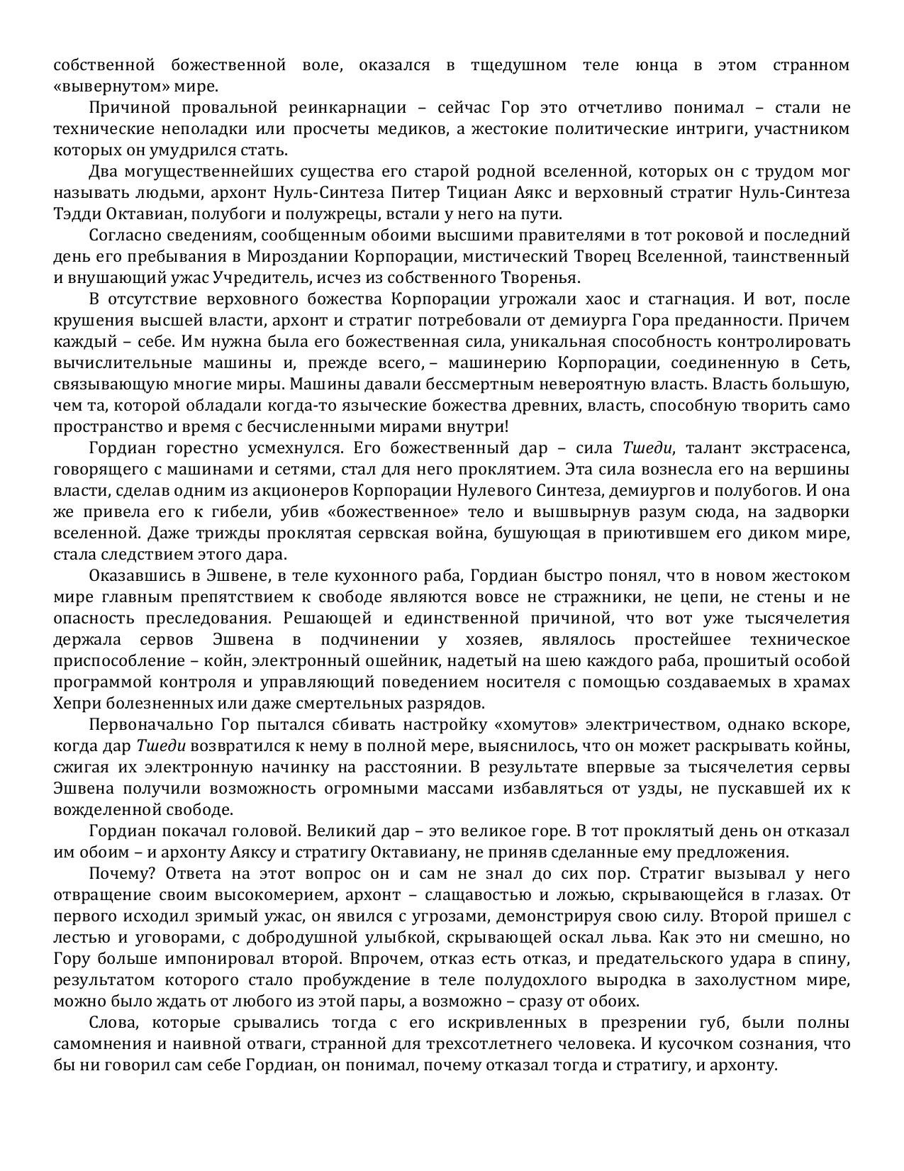 Акционер Корпорации, создающей вселенные на заказ, Гор искренне полагал, что обладает указанными качествами. Оказалось - не так. Перенесенный врагами в тело узкоплечего, слабого, а главное, смертного существа, он с удивлением осознает, что искренняя любовь и настоящая дружба с боевыми товарищами, спаянная мукой и кровью на полях сражений проклятой "сервской войны", способны творить чудеса, превосходящие все, на что способны даже Бог-Роботы, создававшие для него искусственные миры.