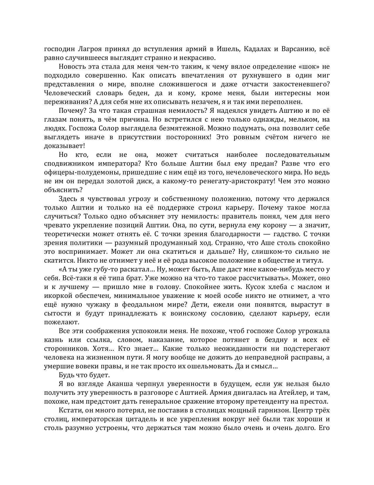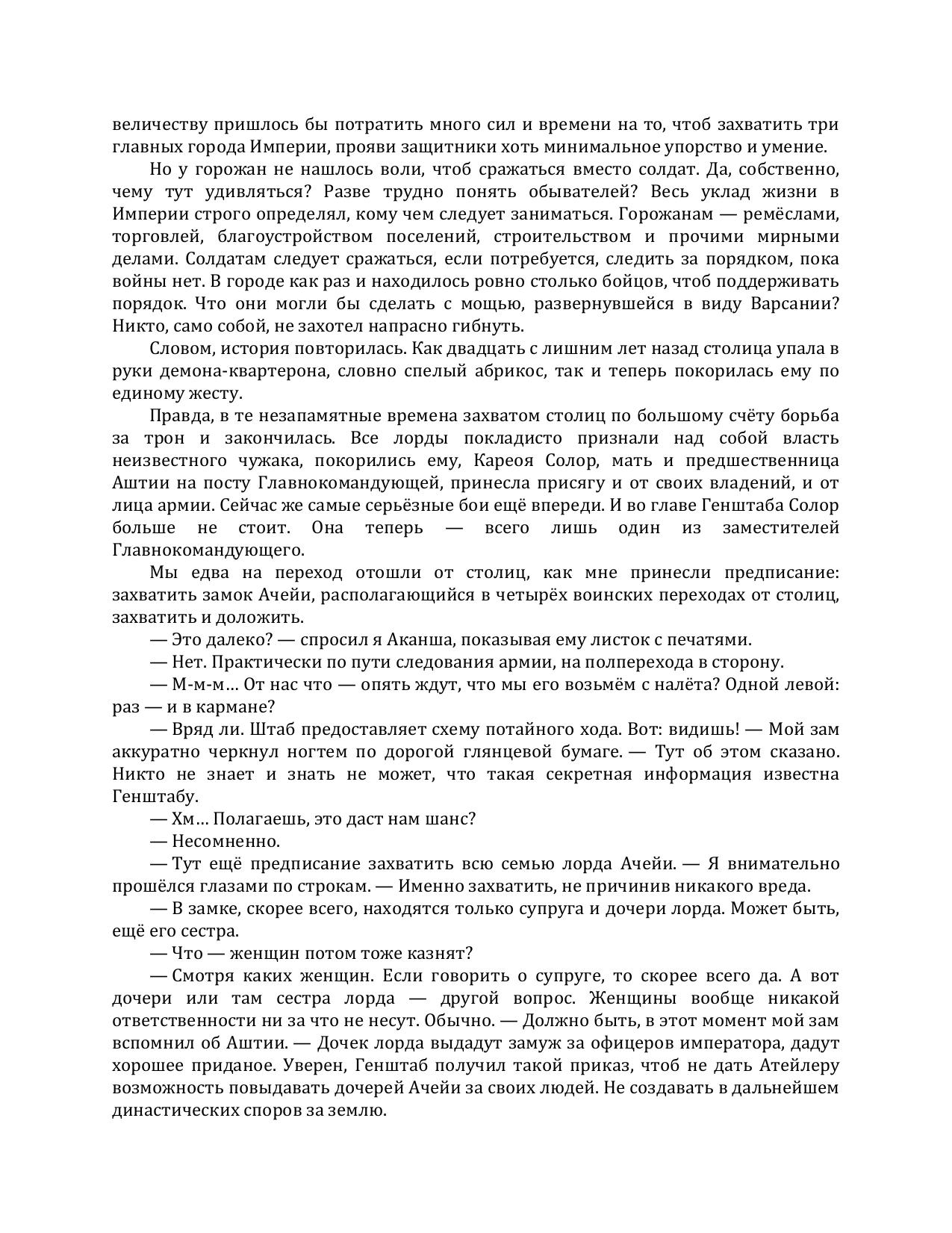 Гражданская война бушует на просторах Империи, и пусть император-демон сумел одержать первые победы в борьбе за свою власть и жизнь, надежда на победу ещё очень и очень призрачна. Аштия Солор, которая выиграла для императора первые сражения, единственная покровительница Сергея, единственная, кто может помочь ему уцелеть, снята со всех постов и лишена влияния. Она балансирует на краю гибели. Над Империей начинает всходить звезда нового главнокомандующего, который в своей жестокости и злобе во много раз превосходит самого демона-властителя. Под его властью, ревнивой к чужим успехам, Сергея, как и его знатную покровительницу, не может ждать ничего хорошего.