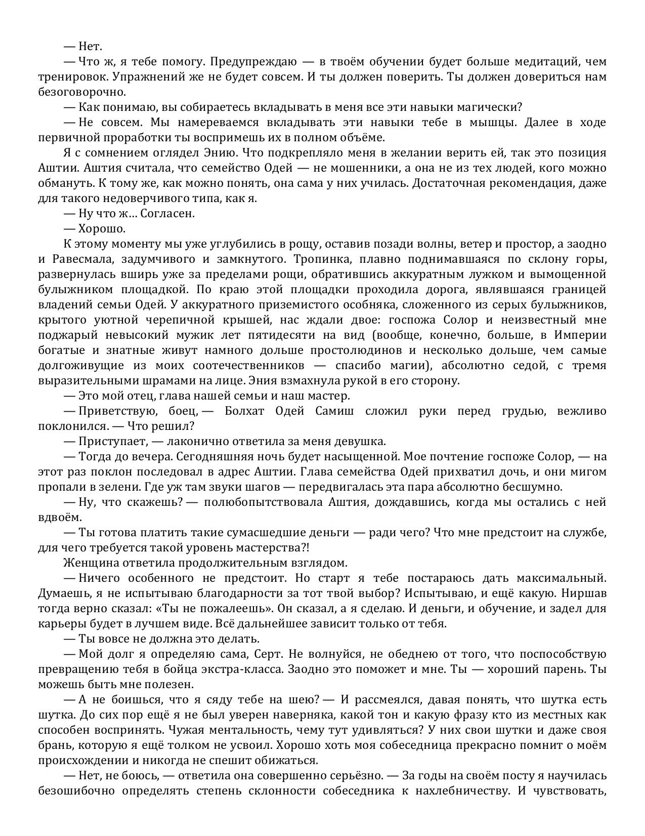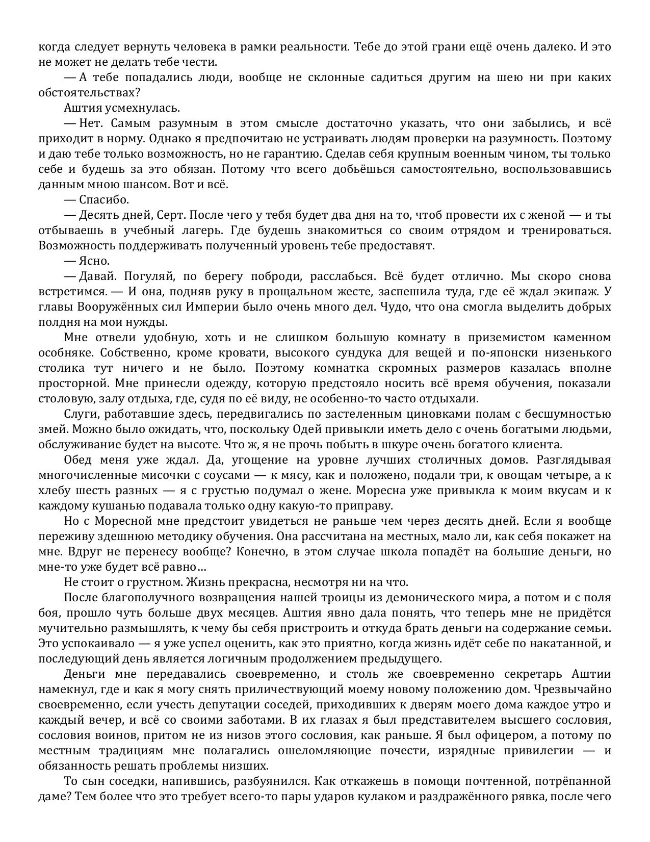 В чужом мире, живущем по своим законам, пришелец извне вынужден выбирать - или оставаться неприкаянным, каждую минуту опасаться за свою жизнь и свободу, или принять чужие правила игры, сделать попытку хотя бы представиться своим, если уж большее не дано. Сергей, начавший свой путь в Империи с гладиаторской арены, не может теперь отказаться от чести стать офицером особых войск и в предстоящих рейдах по демоническим мирам каждый час рисковать своей жизнью. Пусть Империя одарила его чудесным искусством владения мечом, это едва ли способно обнадёжить по-настоящему. Ведь от Сергея ждут результатов, которые на его новой родине принято считать невозможными.
