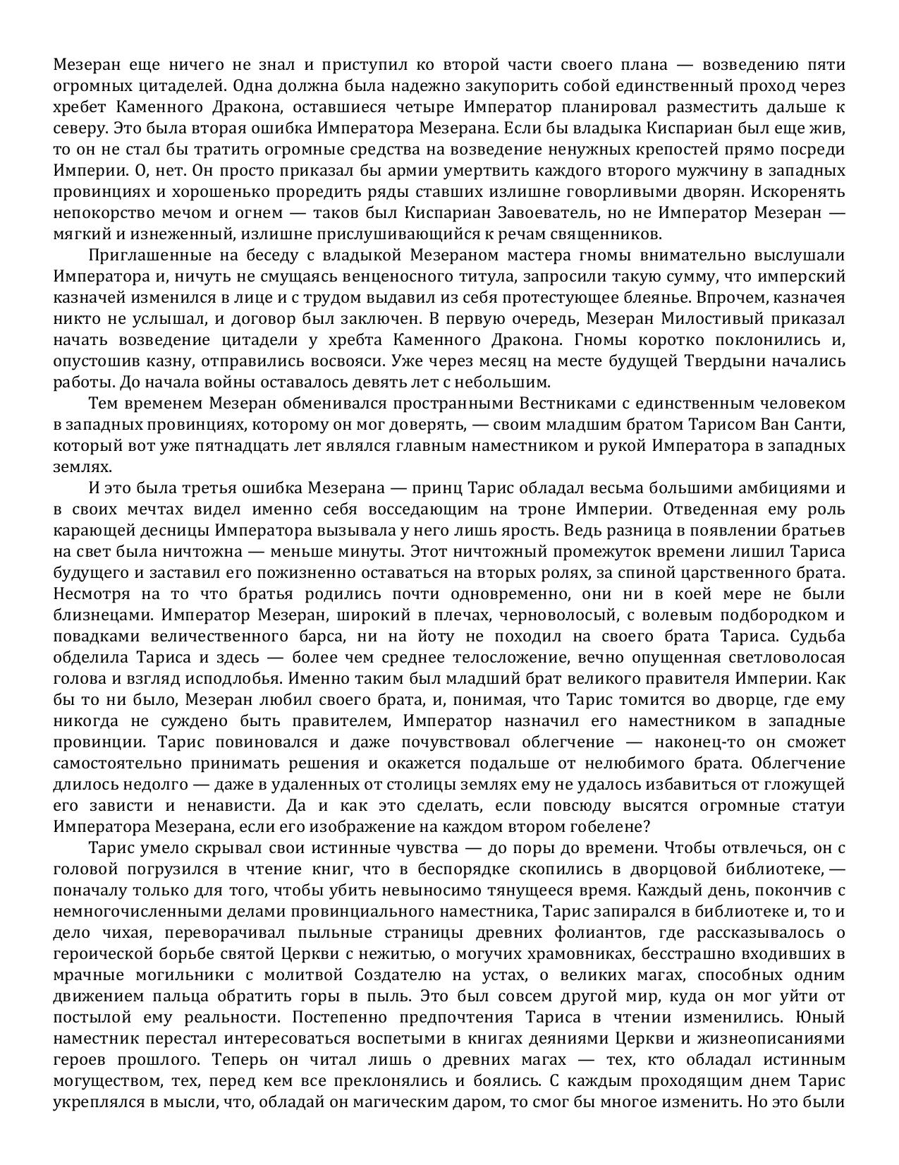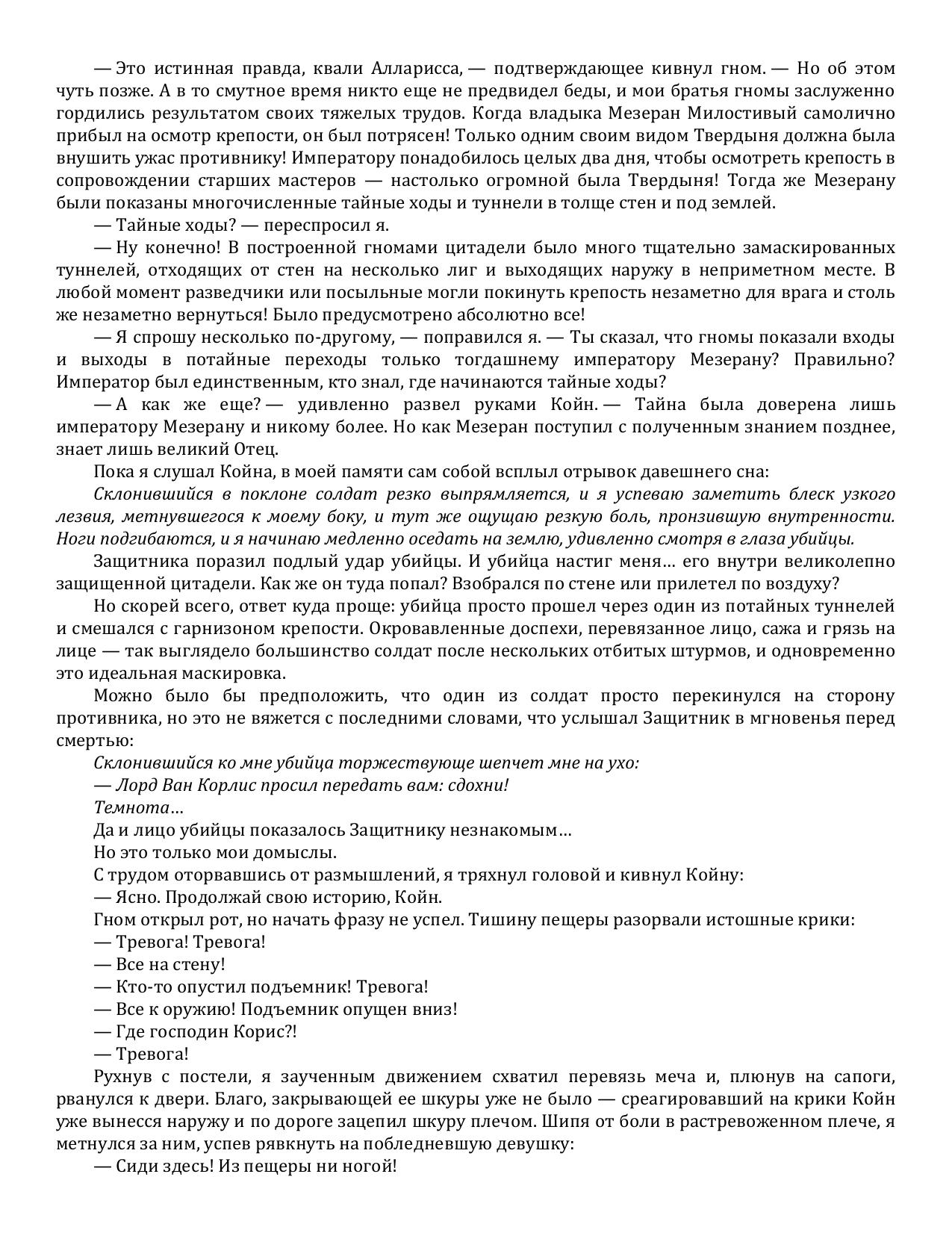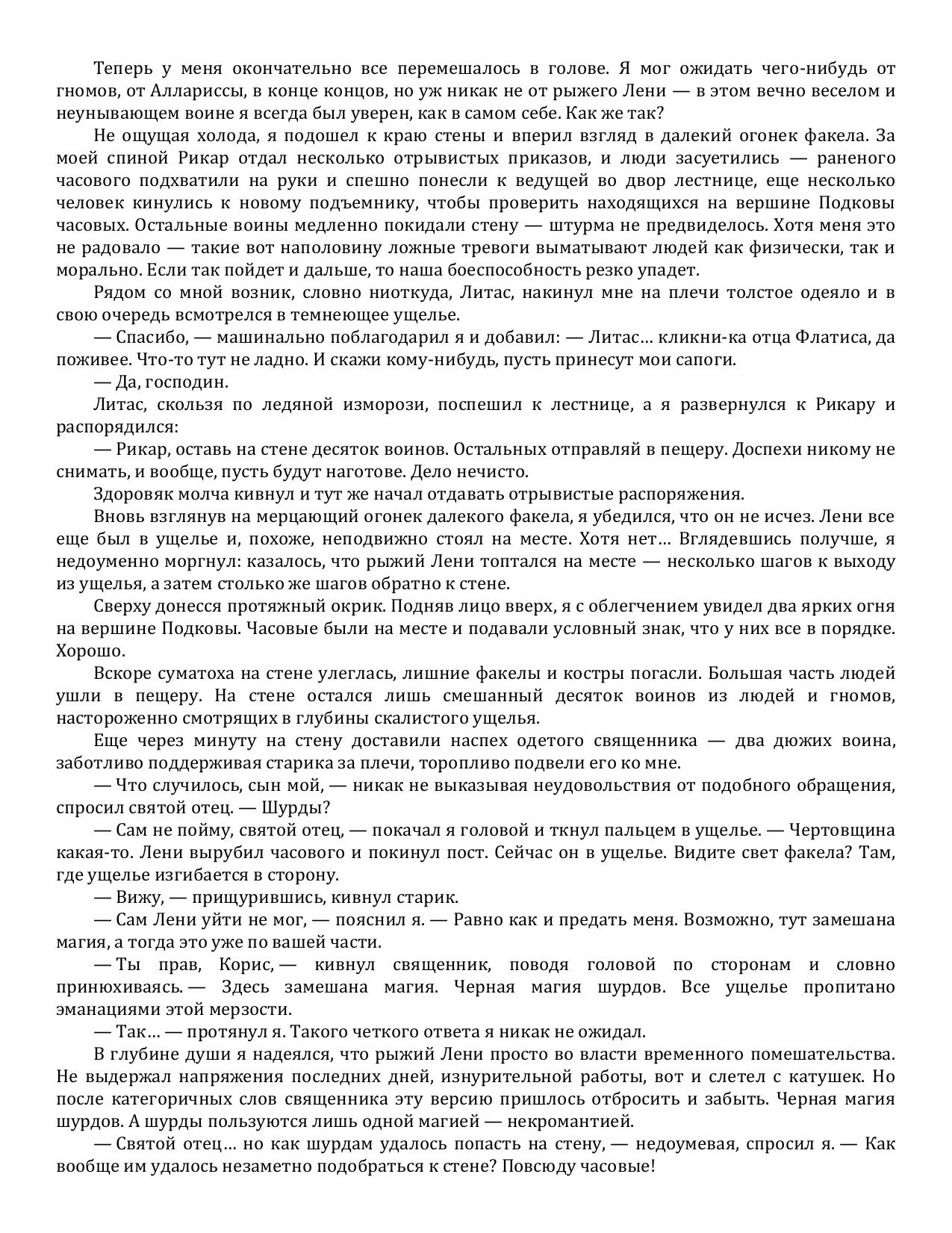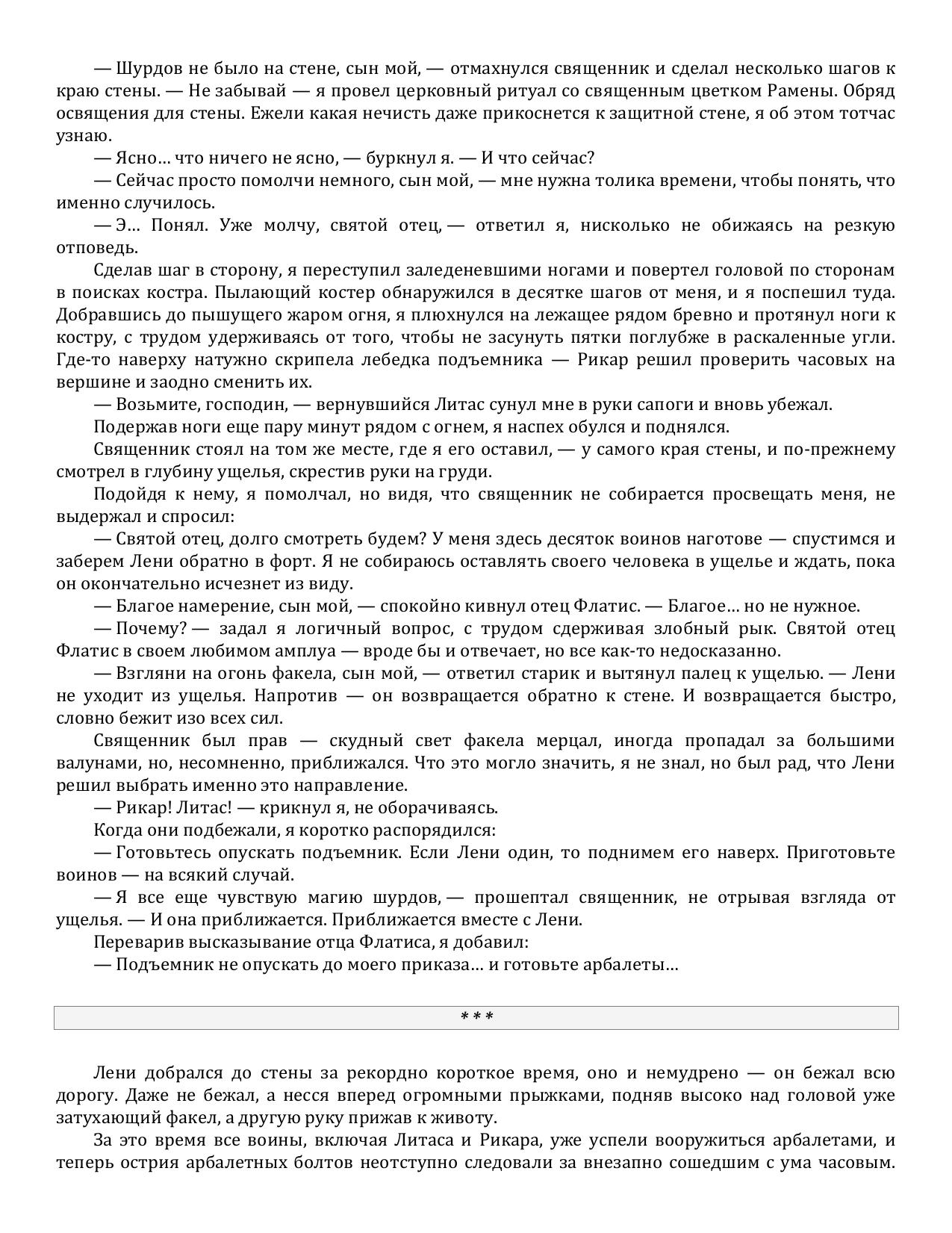 События набирают обороты и, подобно катящемуся под уклон каменному жернову, мчатся вперед. Армия озлобленных шурдов, считающих себя истинными хозяевами Диких Земель, отряд несокрушимых ниргалов во главе с верным псом Повелителя, огромные чудовища сгархи, полчище нежити - всем им суждено встретиться под стенами поселения Кориса Ван Исер. Сумеет ли горстка уставших от вечной борьбы за выживание людей и гномов дать врагам достойный отпор? Устоят ли стены крепости надежды перед натиском превосходящих сил? Кто знает. Ясно лишь одно - поселение будет сражаться до последней капли крови.