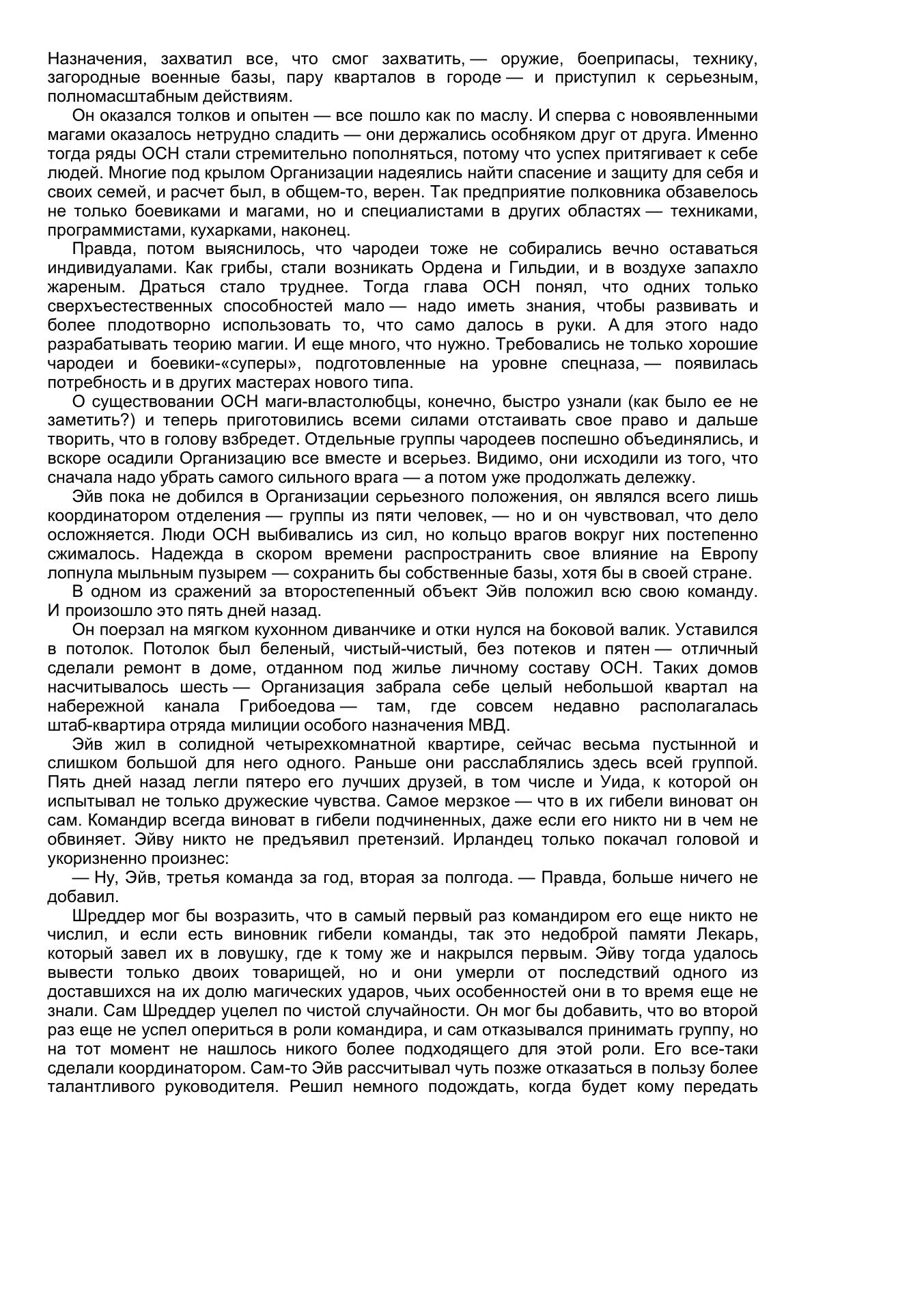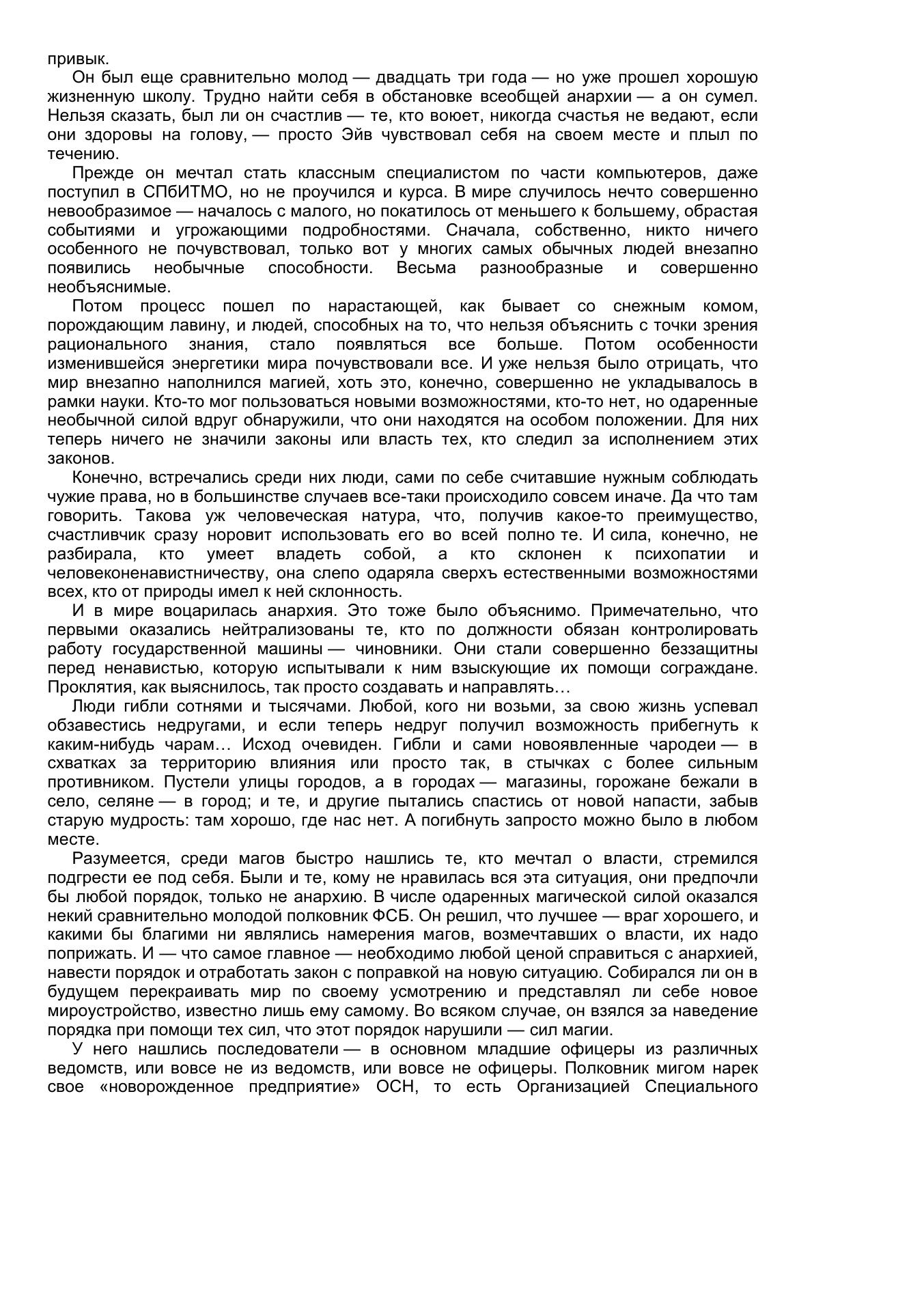 Что может быть страшнее анархии, внезапно рухнувшей на страну, едва сумевшую на руинах прошлого возвести хрупкое здание порядка? Необузданная мощь магии, пришедшая в мир, прежде лишенный даже ее бледных признаков, без разбора наделила новыми возможностями обычных людей. Она не выбирала, хорош человек или плох, совестлив или безжалостен, простой обыватель или прирожденный преступник. Ее не волновало, чем человек руководствуется в этой жизни, пользуясь своими новыми возможностями — собственной ли выгодой или собственными представлениями о счастье всех людей. И то, и другое несло гибель слабым и несогласным. Но нашлись те, кто хотел восстановить порядок, создать новые законы и новую жизнь с поправкой на сложившуюся ситуацию. Из этих людей была создана ОСН, Организация Специального Назначения, которая взяла на себя обязанность силой оружия и магии дать отпор чародеям, не желающим признавать другого закона, кроме собственного желания. Организация, которая встала на пути магических Орденов, мечтающих создать мир, где они станут единственными властителями.