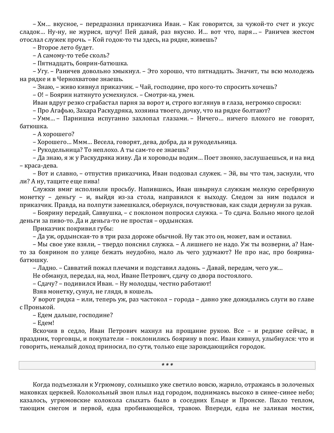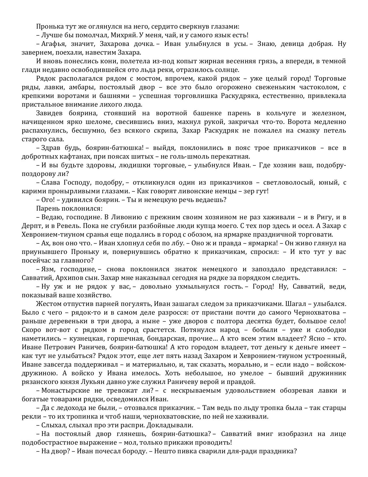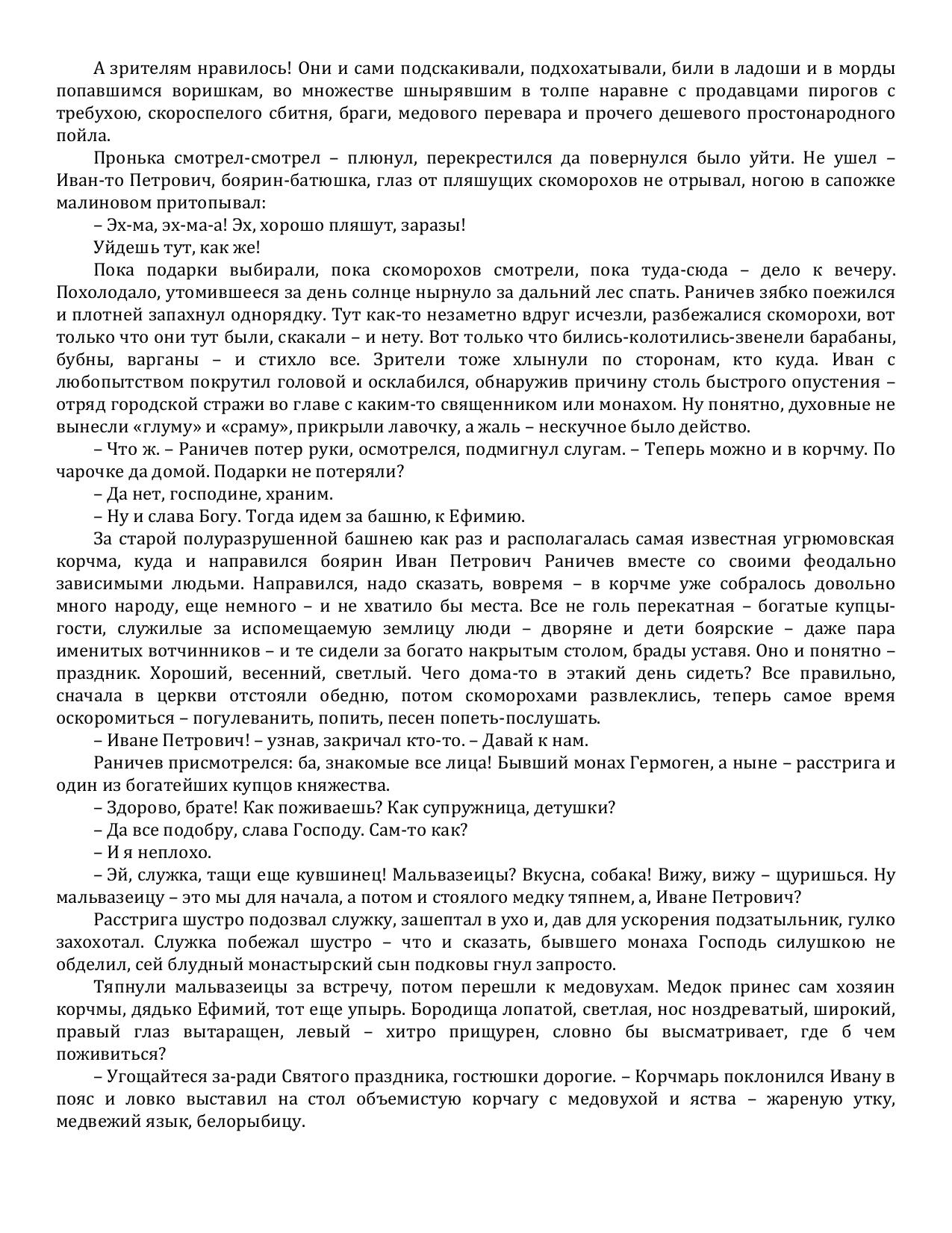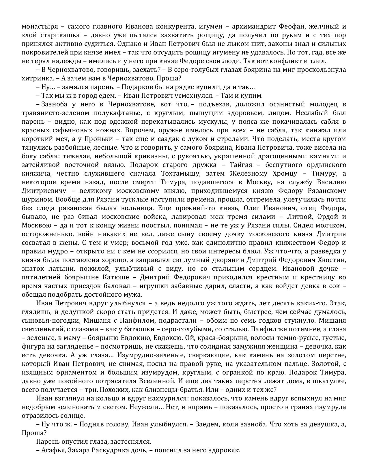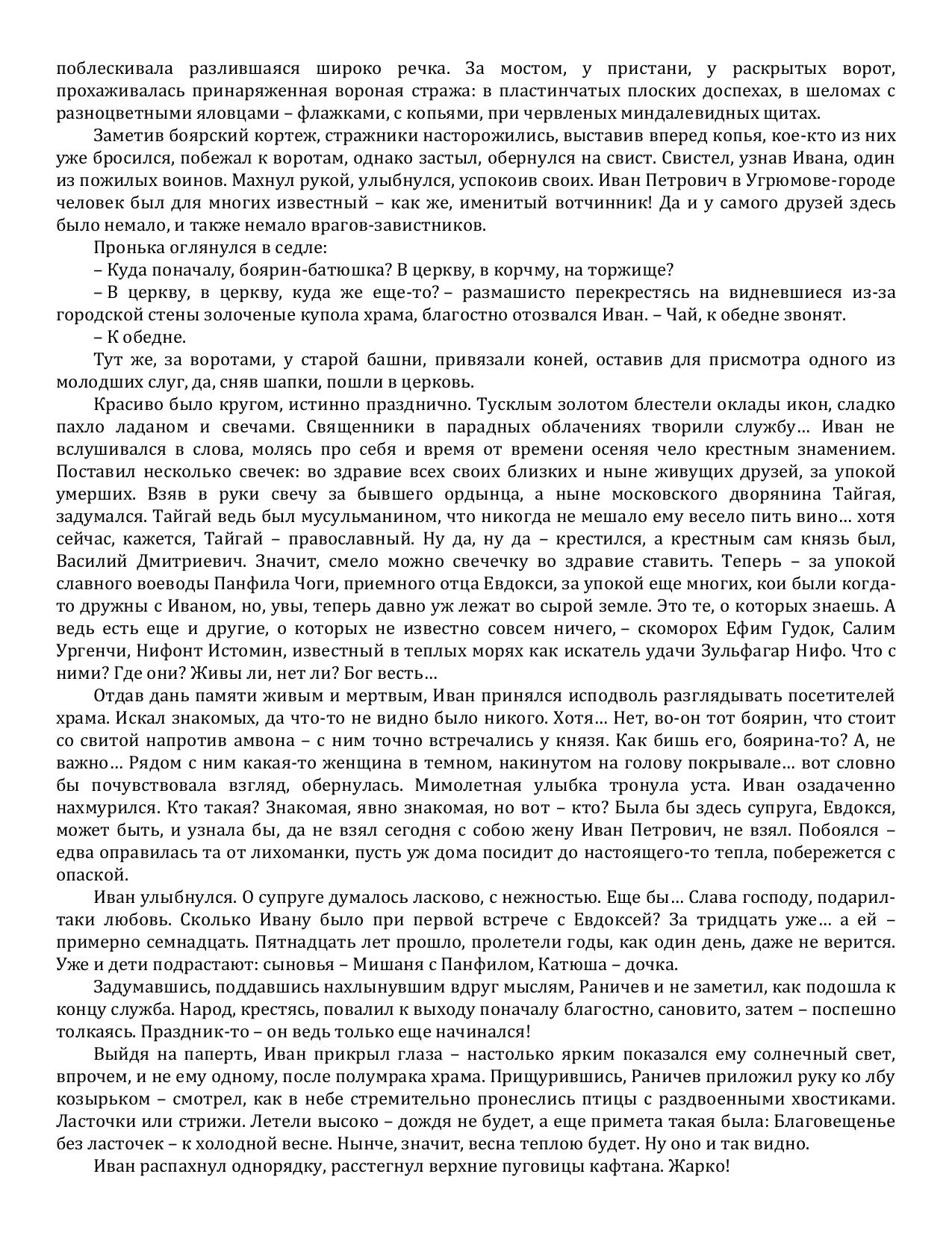 Совсем уже успокоился боярин Иван Петрович Раничев, ведь целых пять лет прошло с тех пор, как он в очередной раз столкнулся с изощренным и хитрым врагом. Теперь же наступило спокойствие: давно умер потрясатель Вселенной Тимур, убит Тохтамыш, повержены неприятели, лишь игумен Ферапонтова монастыря Феофан время от времени устраивает мелкие пакости. Иван с головой погружен в вотчинное хозяйство и собственную семью: все хорошеет любимая жена, подрастают дети.