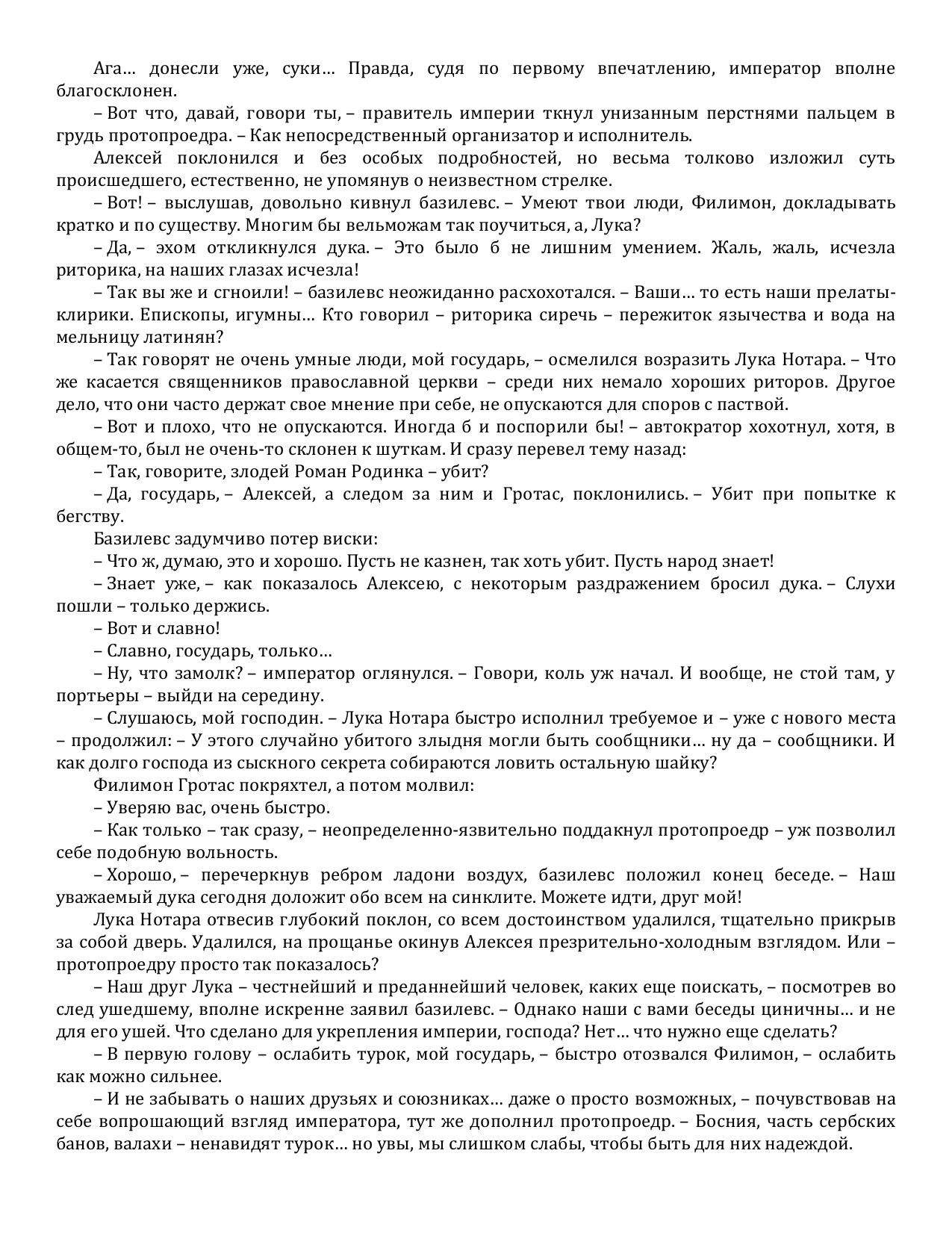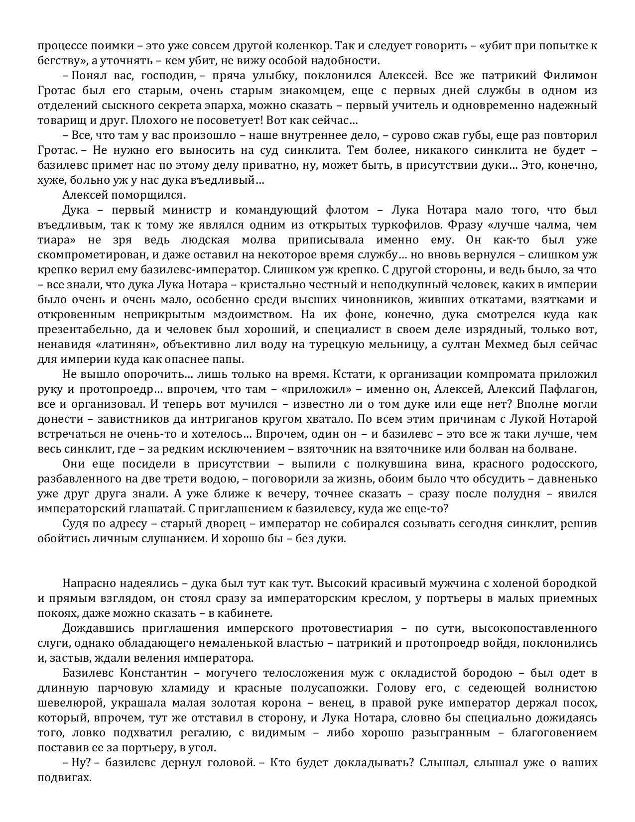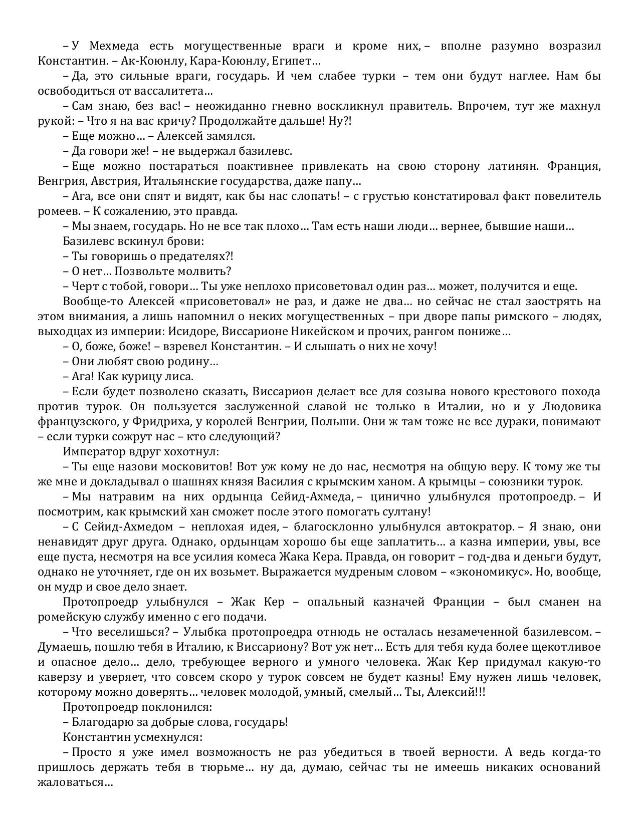 Наш современник Алексей, злой прихотью судьбы некогда заброшенный в средневековый Константинополь, добивается там многого: уважения врагов и друзей, любви, семейного счастья… Мало того, он делает быструю карьеру на государственной службе, связанной с защитой Империи ромеев от происков турок. Именно Алексею, делавшему все для своей второй родины, Константинополь обязан тем, что не стал Стамбулом. Знаменитый штурм 1453 года закончился ничем! Султан Мехмед после этого – лишь жалкий неудачник, янычары готовят мятеж… Однако Алексей по чистой случайности узнает, что новый султан вновь начнет экспансию и Константинополь падет… пусть даже на два года позже, чем в прежней истории. А с падением имперской столицы наш герой потерял бы все: семью, друзей, родину…