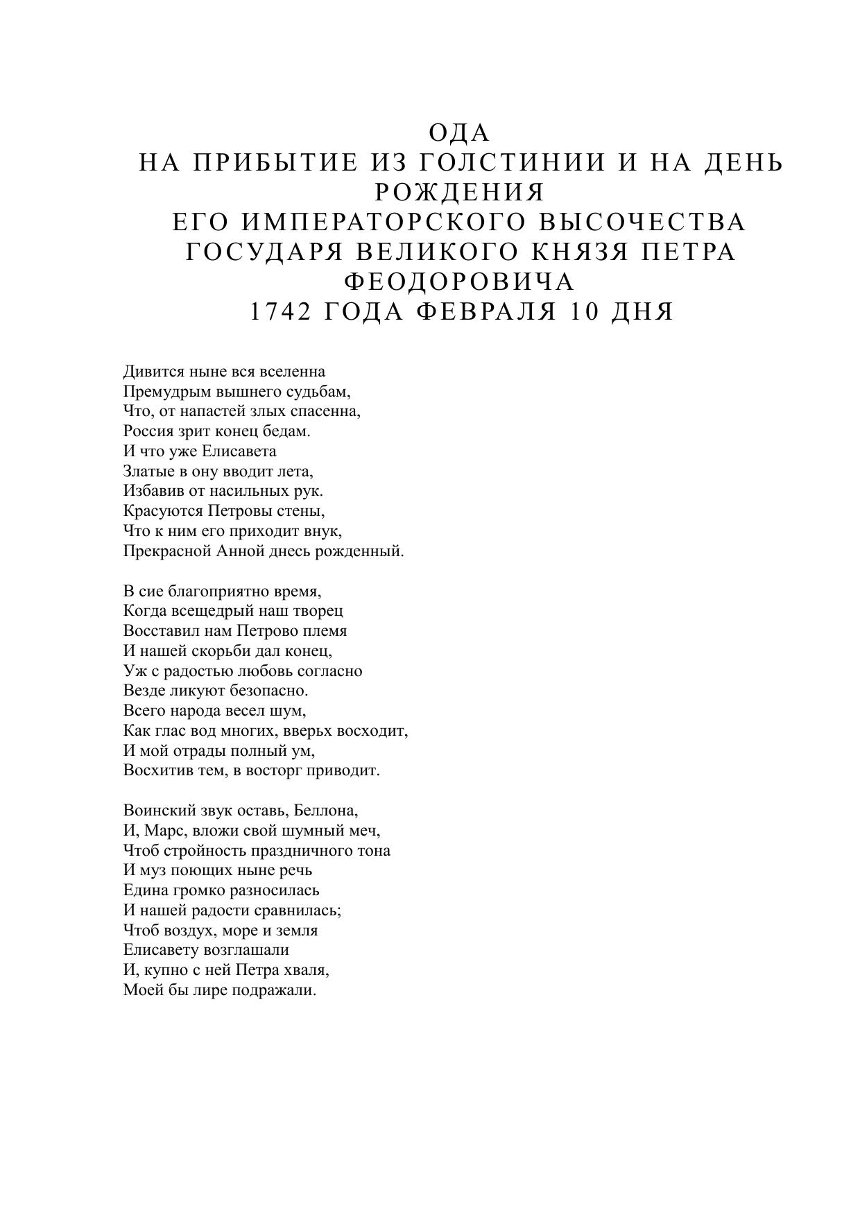 Ода на прибытие из Голстинии и на день рождения великого князя Петра Феодоровича 1742 года февраля 10 дня