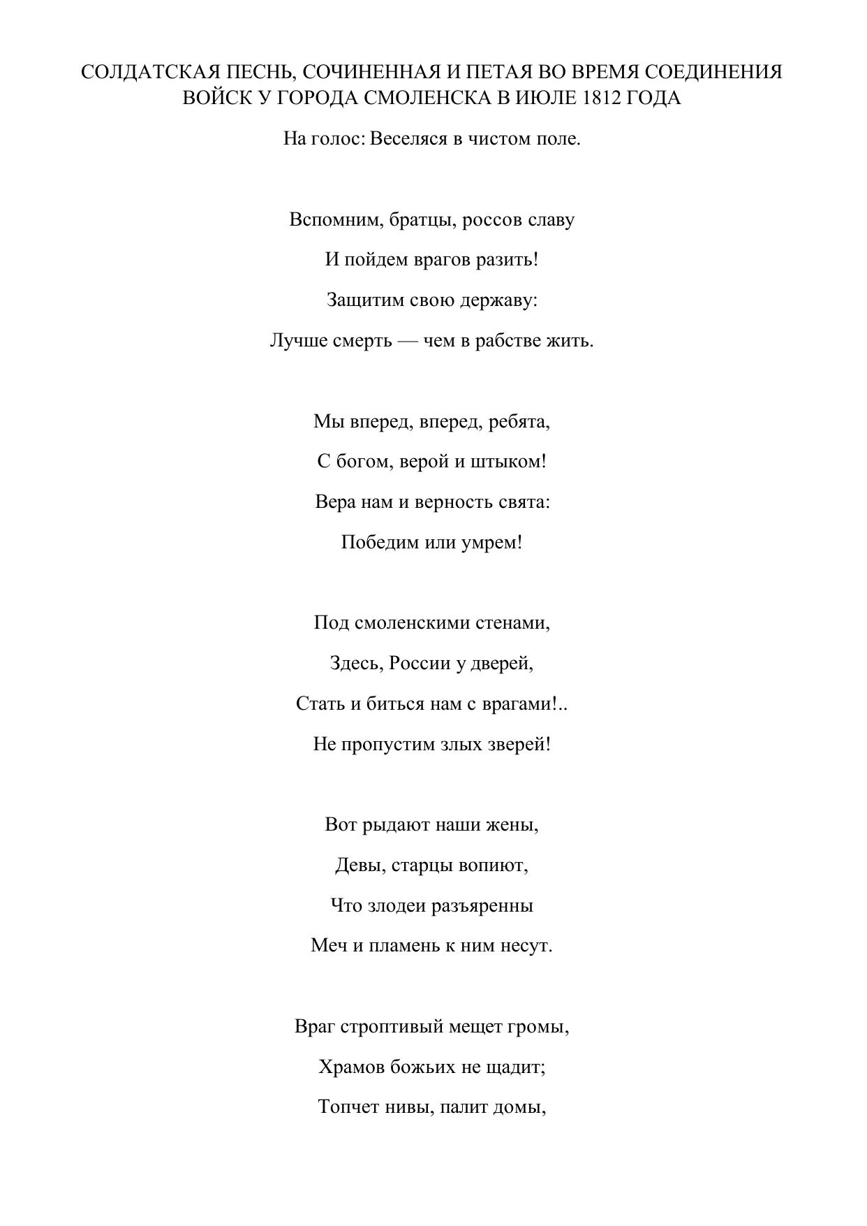 Солдатская песнь, сочиненная и петая во время соединения войск у города Смоленска