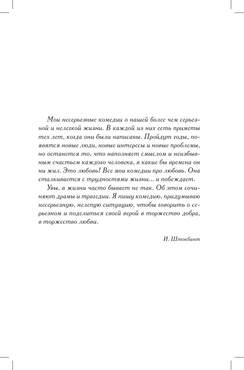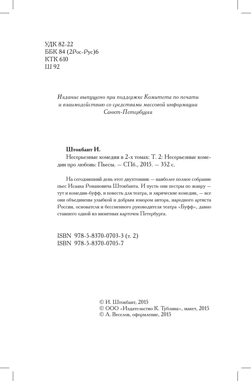 На сегодняшний день этот двухтомник – наиболее полное собрание пьес Исаака Романовича Штокбанта. И пусть они пестры по жанру – тут и комедии-буфф, и повесть для театра, и лирические комедии, все они объединены улыбкой и добрым юмором автора, народного артиста России, основателя и бессменного руководителя театра «Буфф», давно ставшего одной из визитных карточек Петербурга.