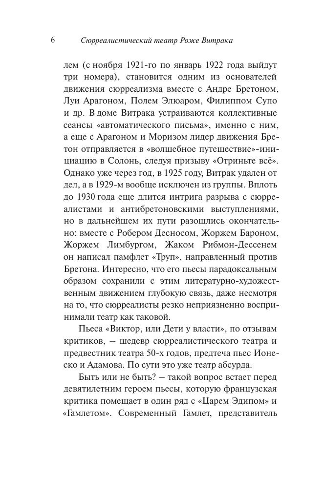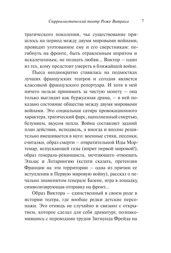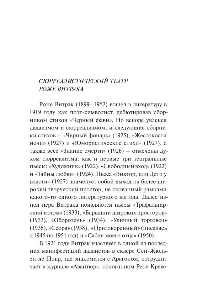 Роже Витрак (1899–1952) вошел в литературу в 1919 году как поэт-символист, дебютировав сборником стихов "Черный фавн". Но вскоре увлекся дадаизмом и сюрреализмом, и следующие сборники стихов – "Черный фонарь" (1925), "Жестокости ночи" (1927) и "Юмористические стихи" (1927), а также эссе "Знание смерти" (1926) – отмечены духом сюрреализма, как и первые три театральные пьесы: "Художник" (1922), "Свободный вход" (1922) и "Тайны любви" (1924). Пьеса "Виктор, или Дети у власти" (1927) знаменует собой выход на более широкий творческий простор, не скованный рамками какого-то одного литературного метода. Далее из-под пера Витрака появляются пьесы "Трафальгарский излом" (1933), "Барышни широких просторов" (1933), "Оборотень" (1934), "Уличный торговец" (1936), "Ссора" (1938), "Приговоренный" (писалась с 1945 по 1951 год) и "Сабля моего отца" (1950).