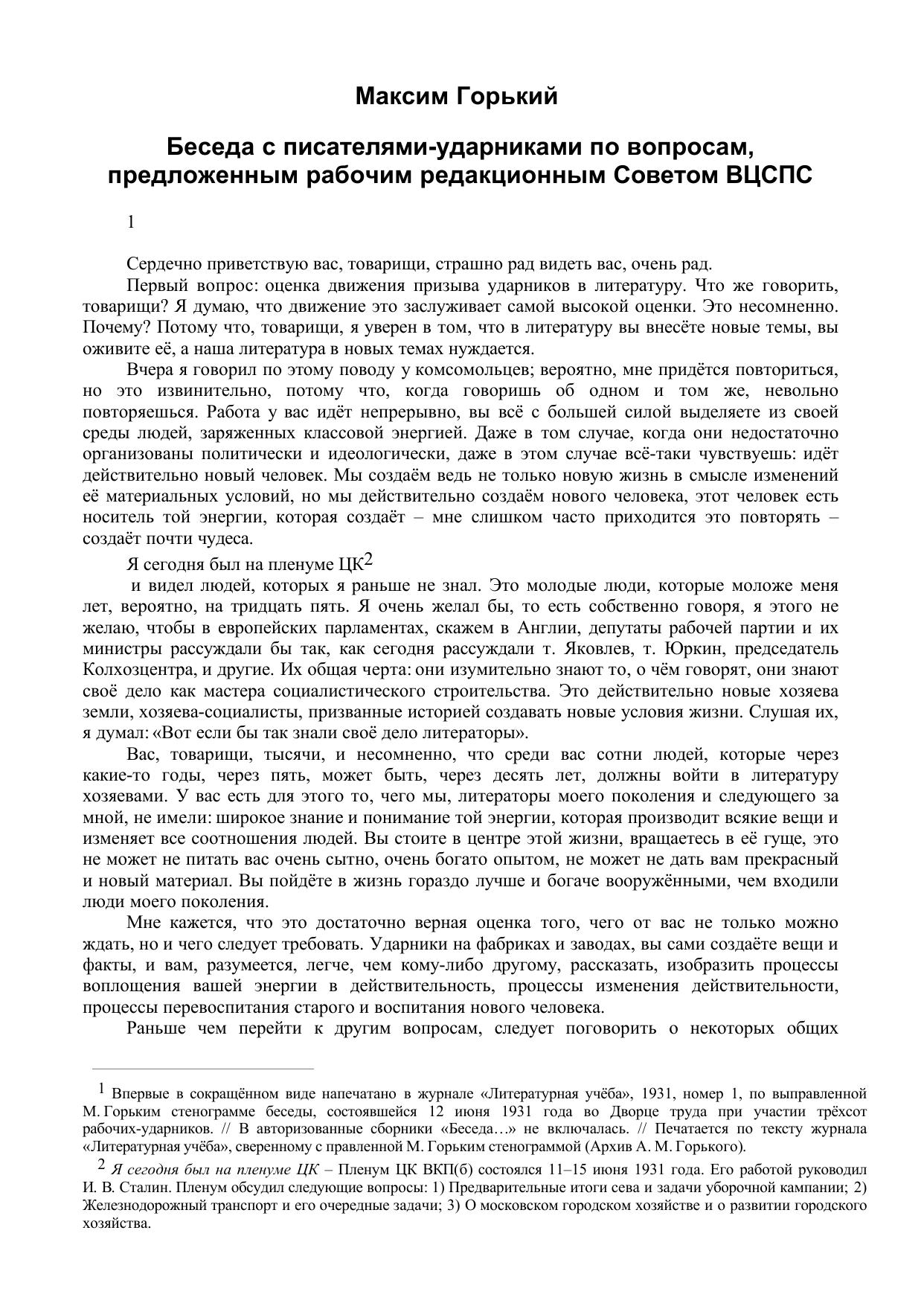 Беседа с писателями ударниками по вопросам, предложенным рабочим редакционным Советом ВЦСПС