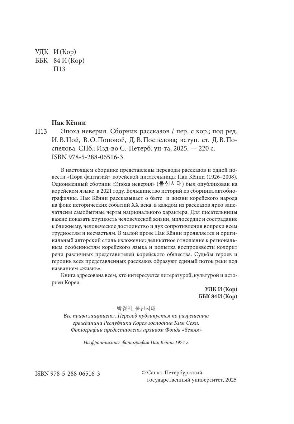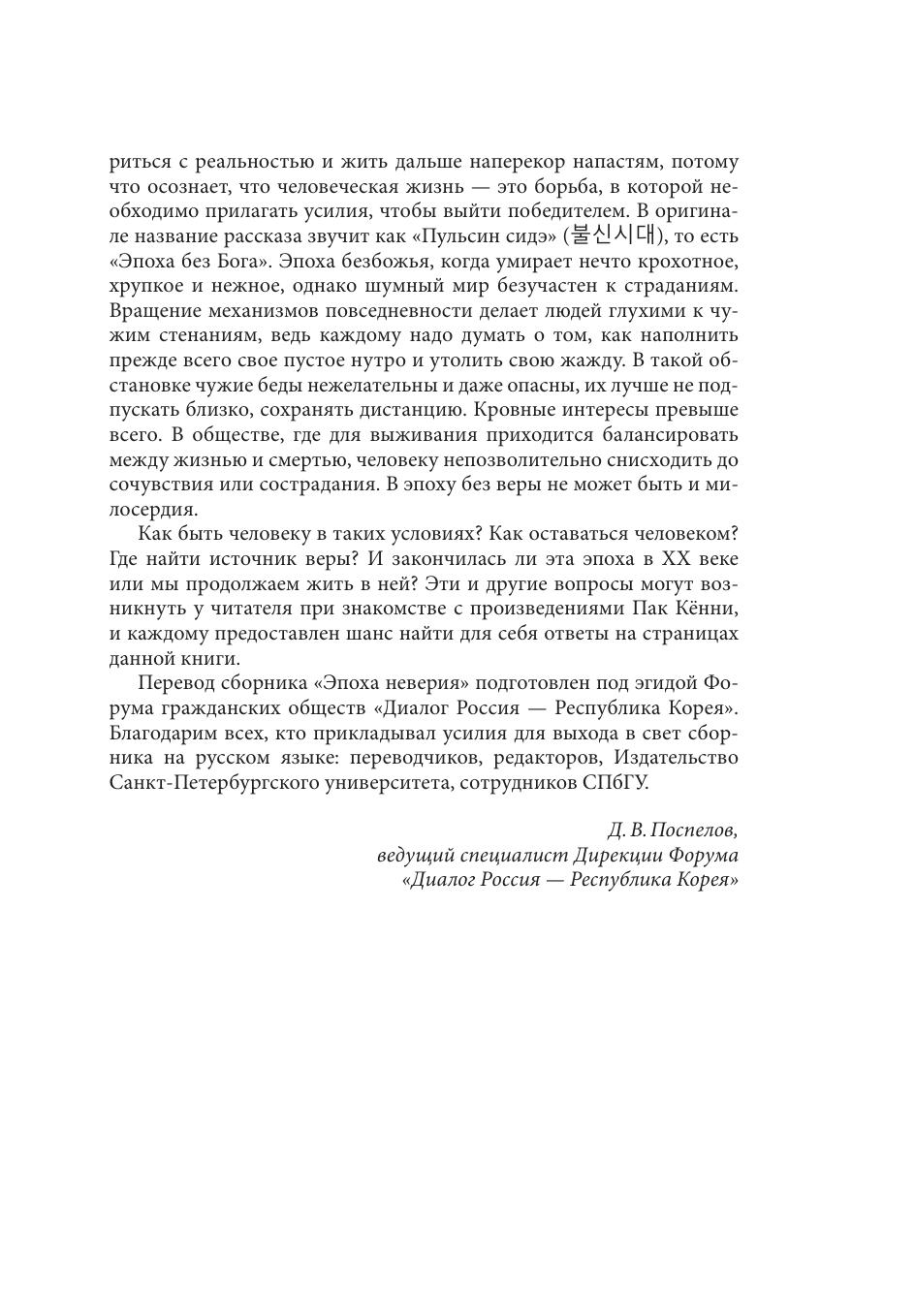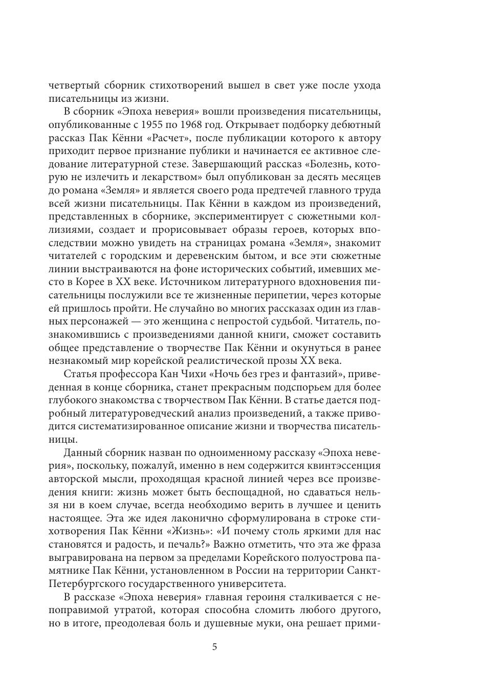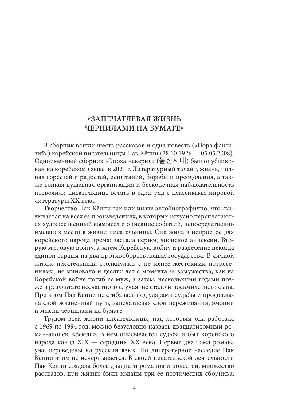 В настоящем сборнике представлены переводы рассказов и одной повести «Пора фантазий» корейской писательницы Пак Кённи (1926–2008). Одноименный сборник «Эпоха неверия» был опубликован на корейском языке в 2021 году. Большинство историй из сборника автобиографичны. Пак Кённи рассказывает о быте и жизни корейского народа на фоне исторических событий XX века, в каждом из рассказов ярко запечатлены самобытные черты национального характера. Для писательницы важно показать хрупкость человеческой жизни, милосердие и сострадание к ближнему, человеческое достоинство и дух сопротивления вопреки всем трудностям и несчастьям. В малой прозе Пак Кённи проявляется и оригинальный авторский стиль изложения: деликатное отношение к региональным особенностям корейского языка и попытка воспроизвести колорит речи различных представителей корейского общества. Судьбы героев и героинь всех представленных рассказов образуют единый поток реки под названием «жизнь». Книга адресована всем, кто интересуется литературой, культурой и историей Кореи.