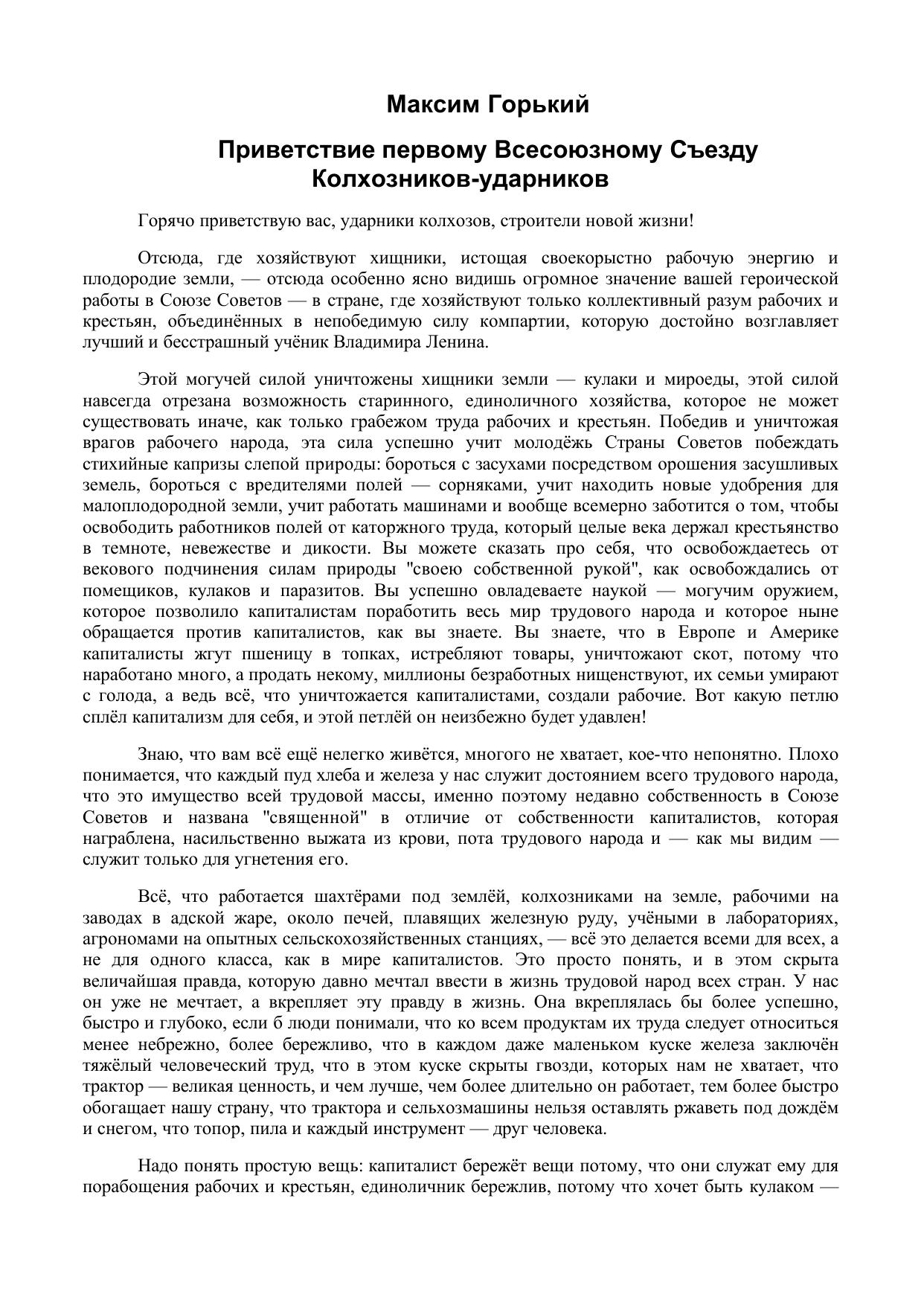 Приветствие первому Всесоюзному Съезду Колхозников-ударников