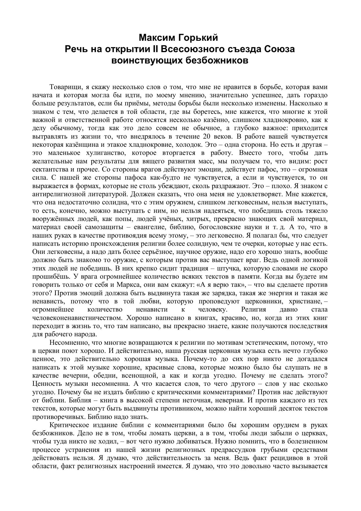 Речь на открытии II Всесоюзного съезда Союза воинствующих безбожников