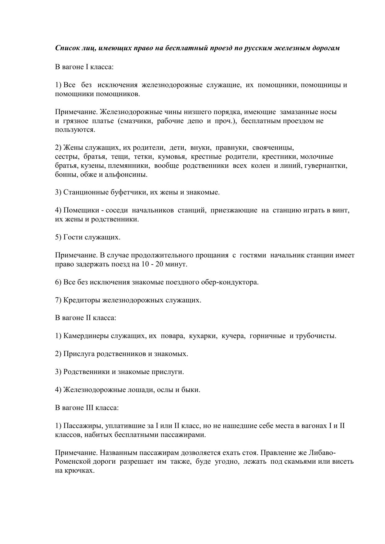 Список лиц, имеющих право на бесплатный проезд по русским железным дорогам