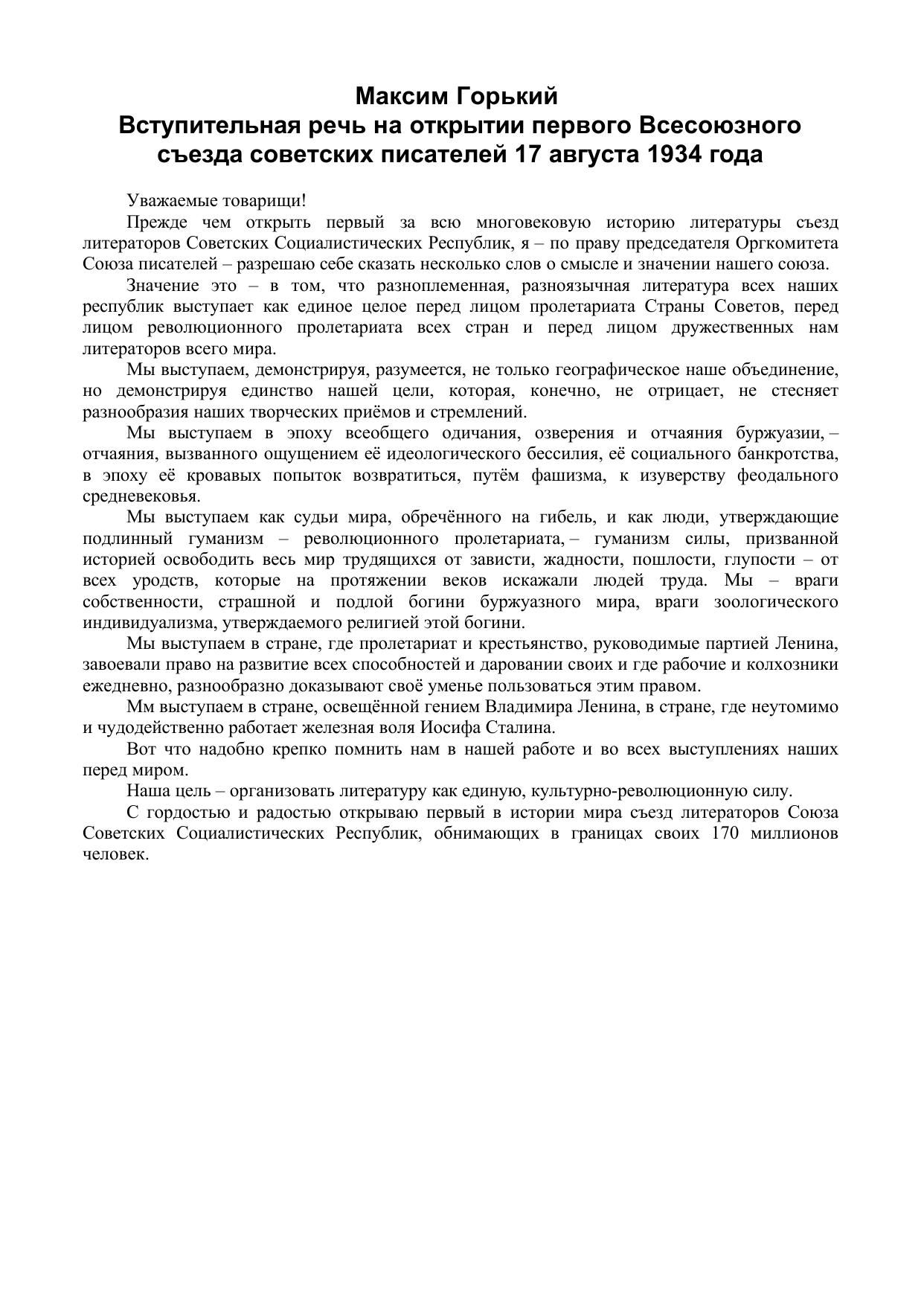 Вступительная речь на открытии первого Всесоюзного съезда советских писателей 17 августа 1934 года