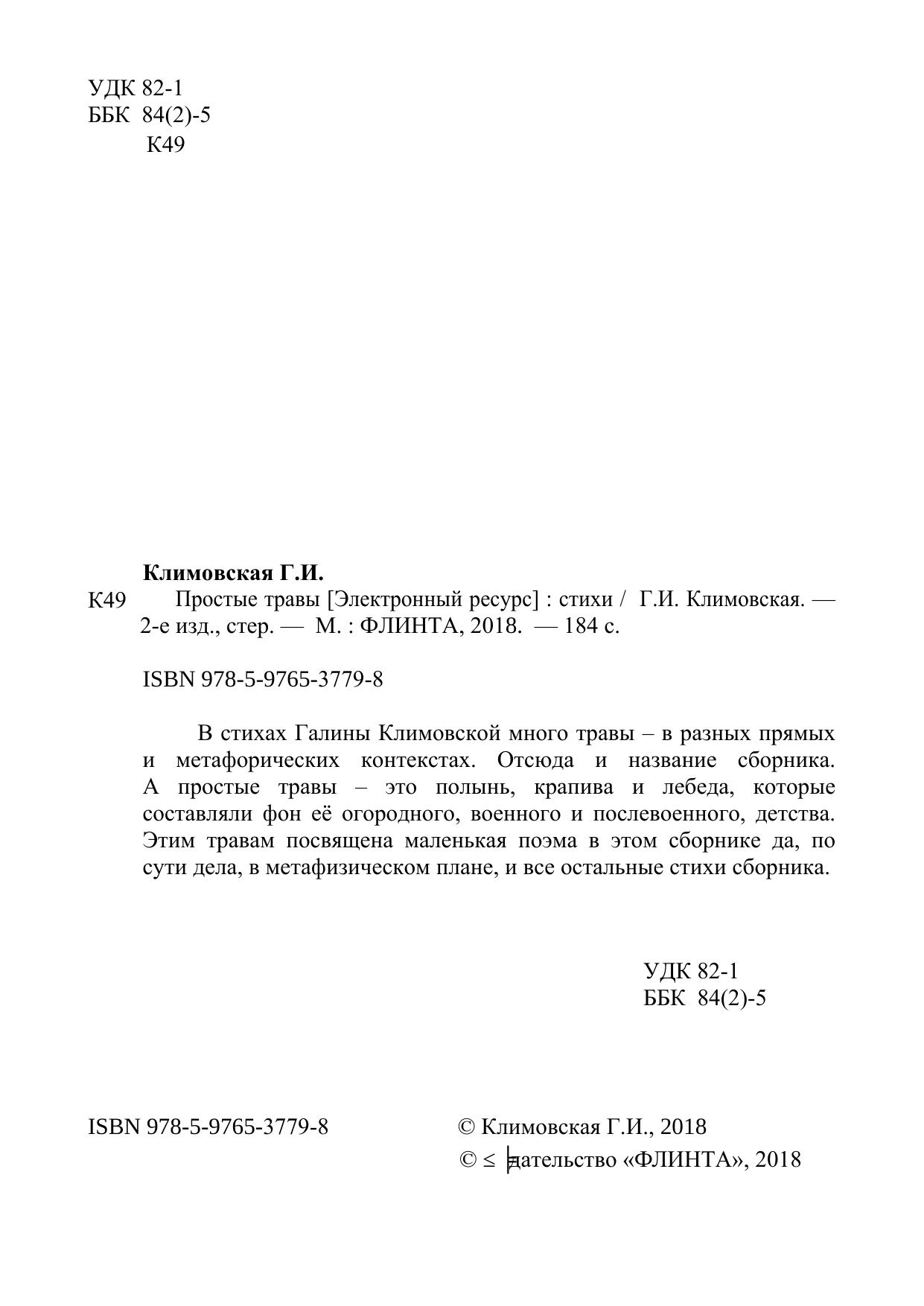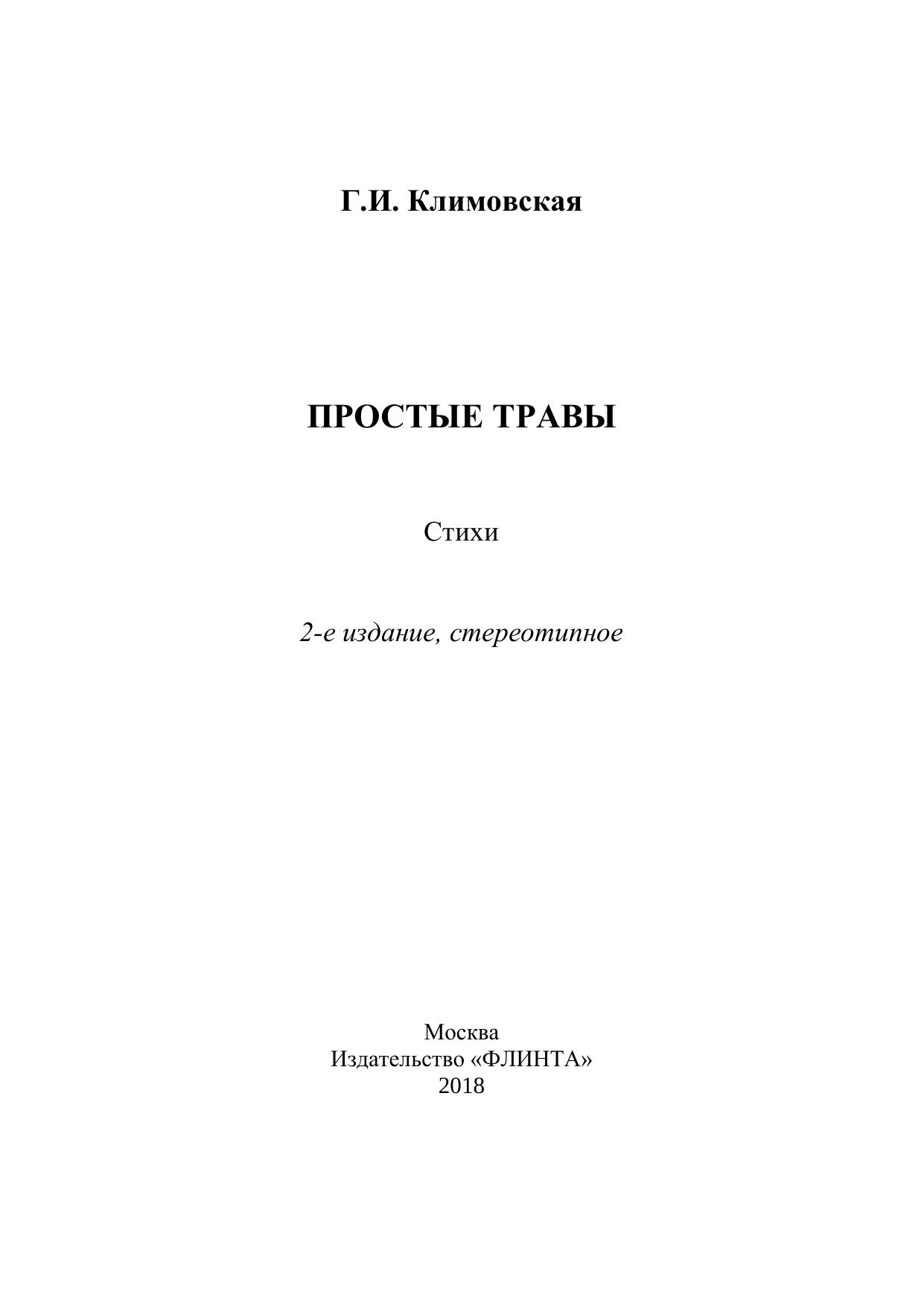 В стихах Галины Климовской много травы – в разных прямых и метафорических контекстах. Отсюда и название сборника. А простые травы – это полынь, крапива и лебеда, которыесоставляли фон её огородного, военного и послевоенного, детства. Этим травам посвящена маленькая поэма в этом сборнике да, по сути дела, в метафизическом плане, и все остальные стихи сборника.