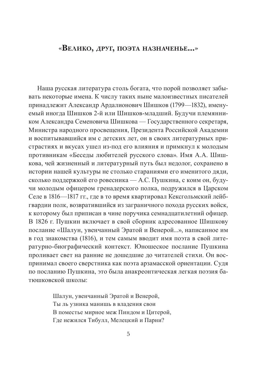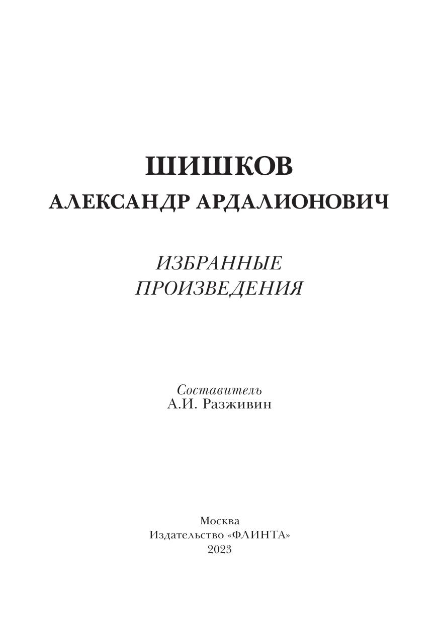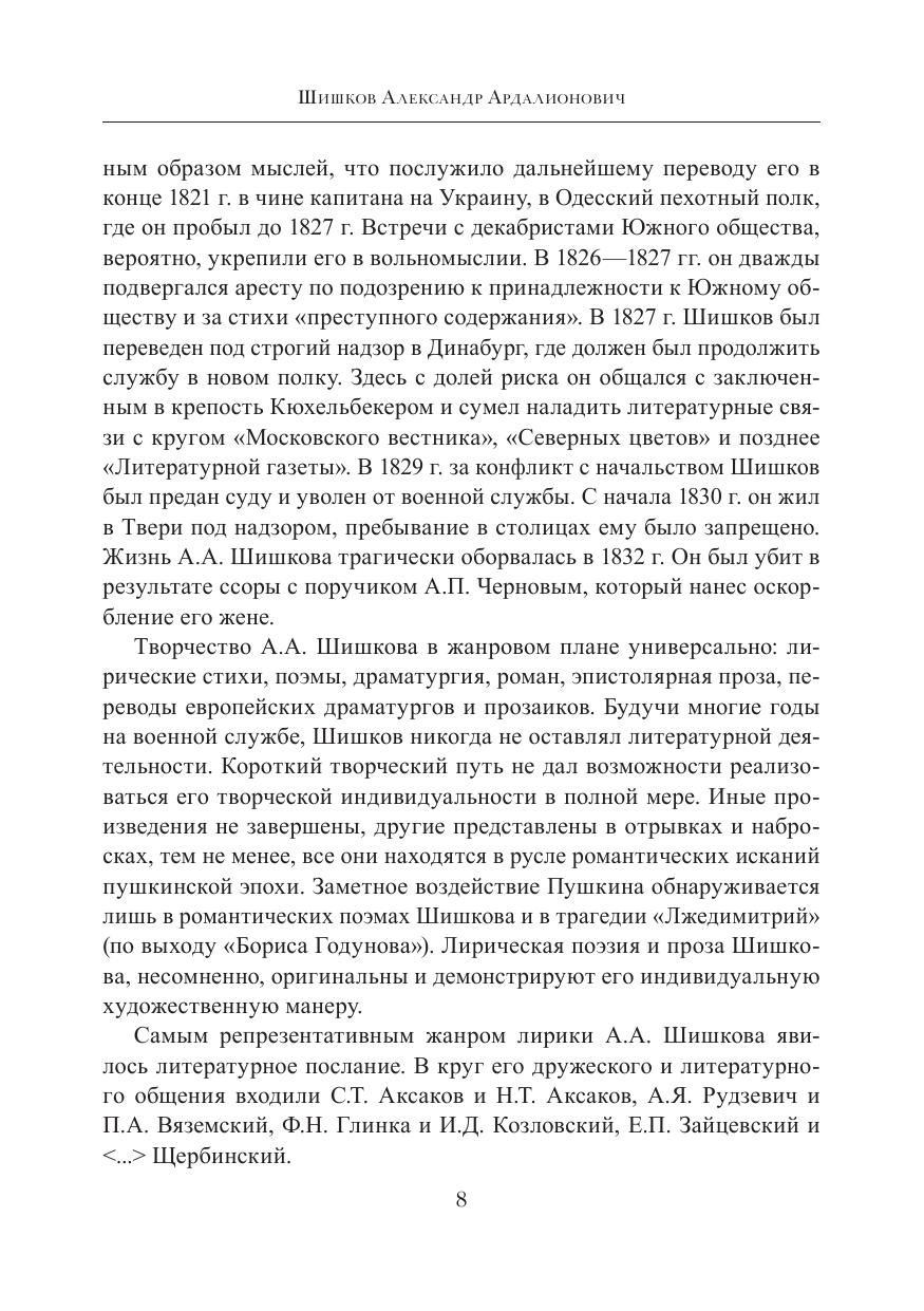 В книгу избранных произведений Александра Ардалионовича Шишкова (1799—1832), поэта, прозаика, драматурга и переводчика первой трети XIX века, современника и друга юности А.С. Пушкина, вошли лирические стихи, поэмы и эпистолярная проза. Бóльшая часть включенных сочинений романтического автора, сохраненных стараниями А.С. Пушкина, С.Т. Аксакова, М.П. Погодина, Н.И. Надеждина, не переиздавалась после 1834 года.