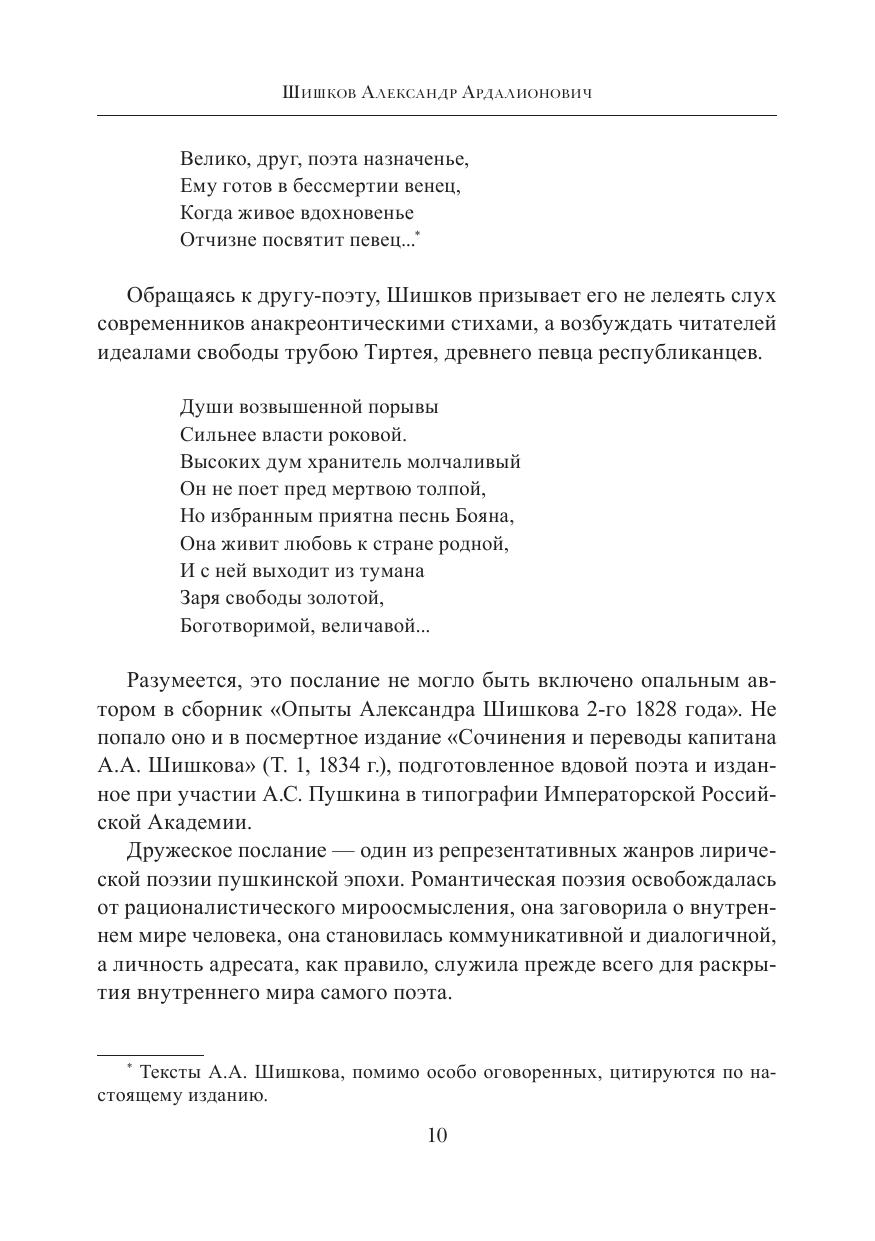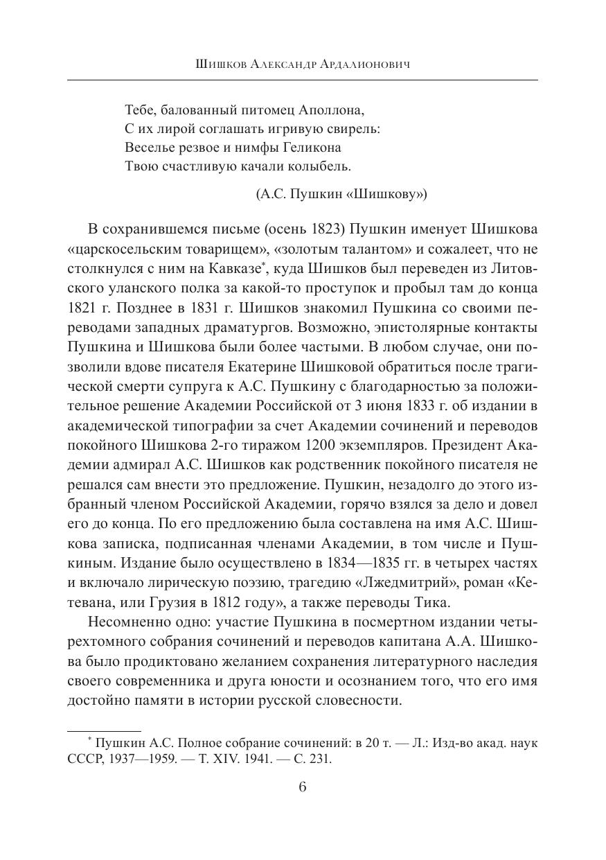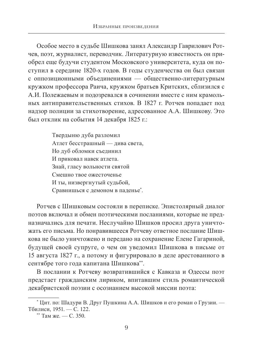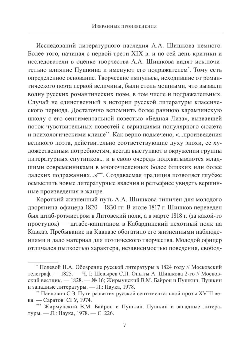 В книгу избранных произведений Александра Ардалионовича Шишкова (1799—1832), поэта, прозаика, драматурга и переводчика первой трети XIX века, современника и друга юности А.С. Пушкина, вошли лирические стихи, поэмы и эпистолярная проза. Бóльшая часть включенных сочинений романтического автора, сохраненных стараниями А.С. Пушкина, С.Т. Аксакова, М.П. Погодина, Н.И. Надеждина, не переиздавалась после 1834 года.