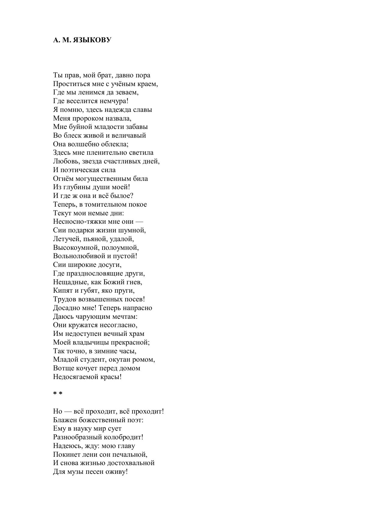 А. М. Языкову (Ты прав, мой брат, давно пора…)