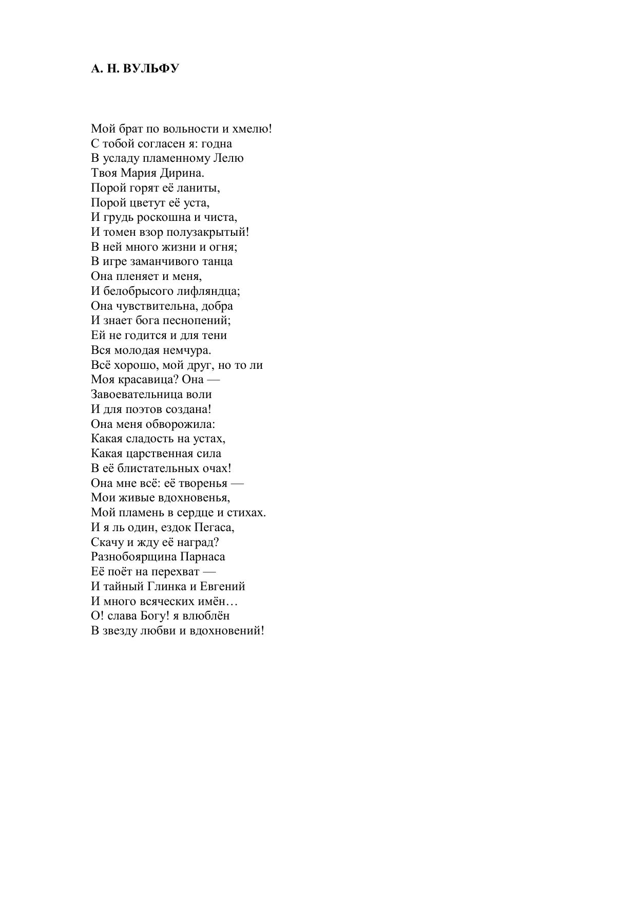А. Н. Вульфу (Мой брат по вольности и хмелю!)