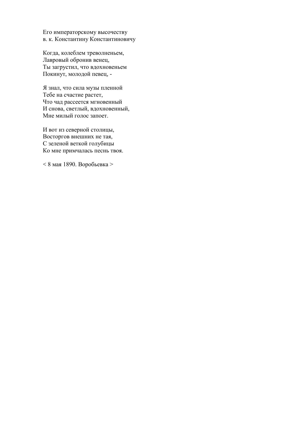 Его императорскому высочеству в. к. Константину Константиновичу Когда, колеблем треволненьем
