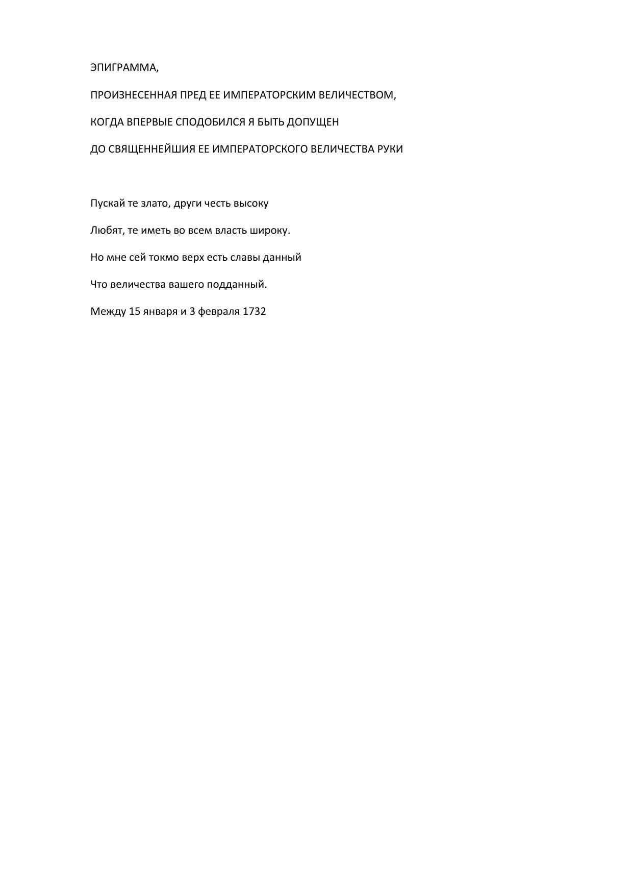 Эпиграмма, произнесенная пред ее императорским величеством, когда впервые сподобился я быть допущен до священнейшия ее императорского величества руки