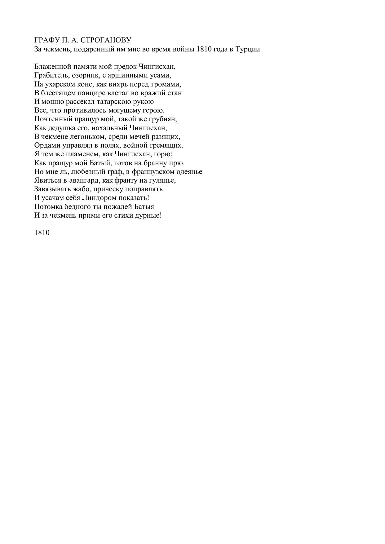 Графу П. А. Строганову За чекмень, подаренный им мне во время войны 1810 года в Турции