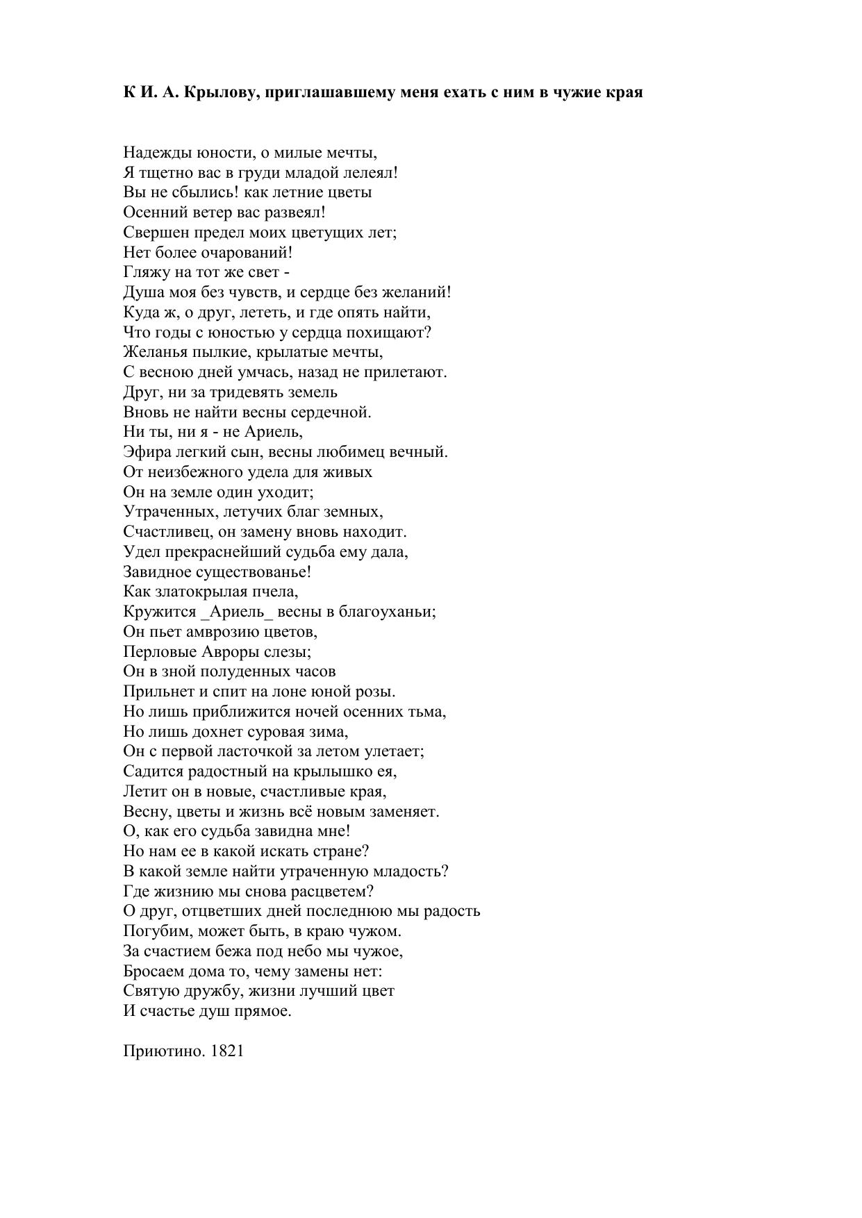 К И. А. Крылову, приглашавшему меня ехать с ним в чужие края