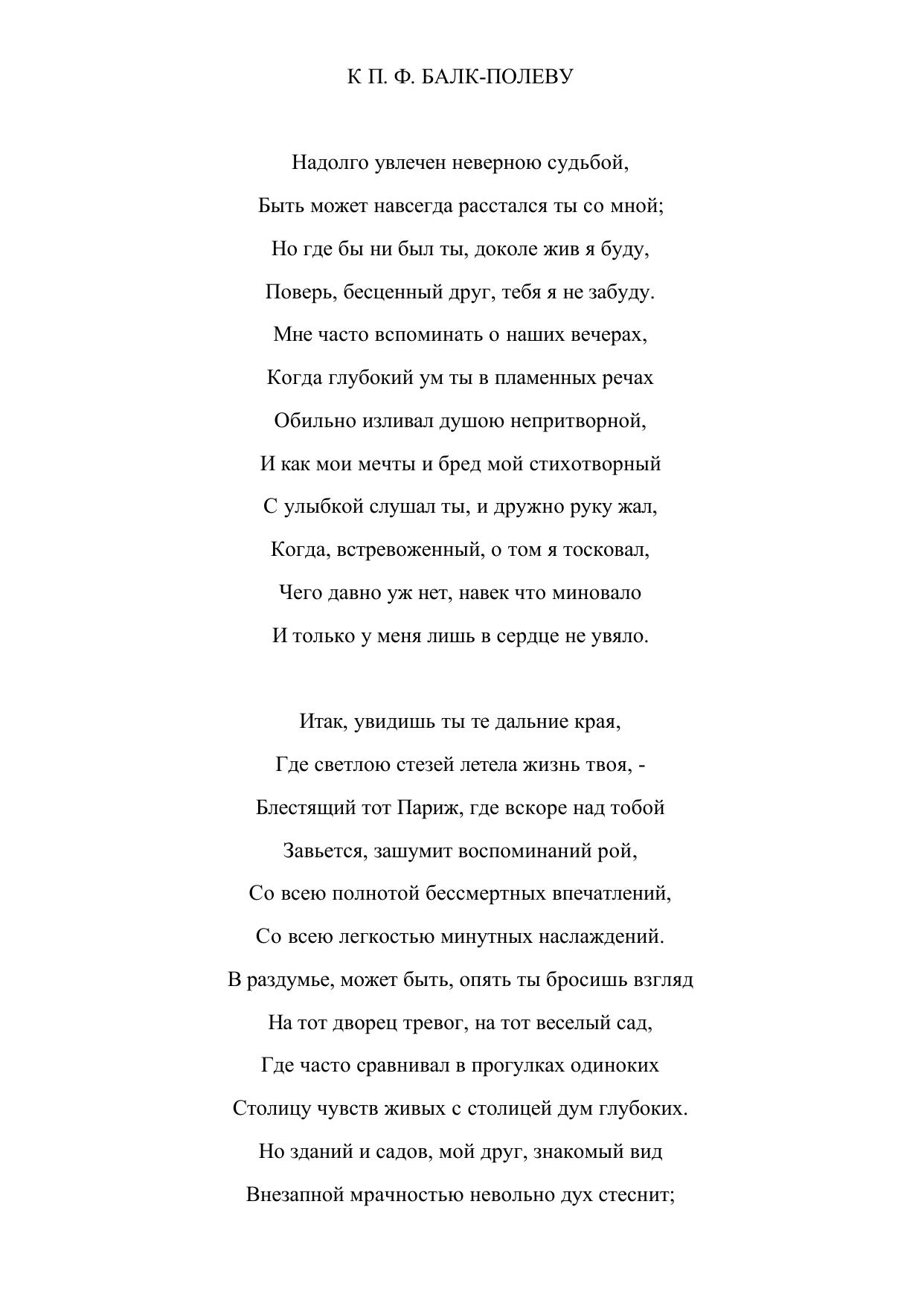 К П. Ф. Балк-Полеву ("Надолго увлечен неверною судьбой...")
